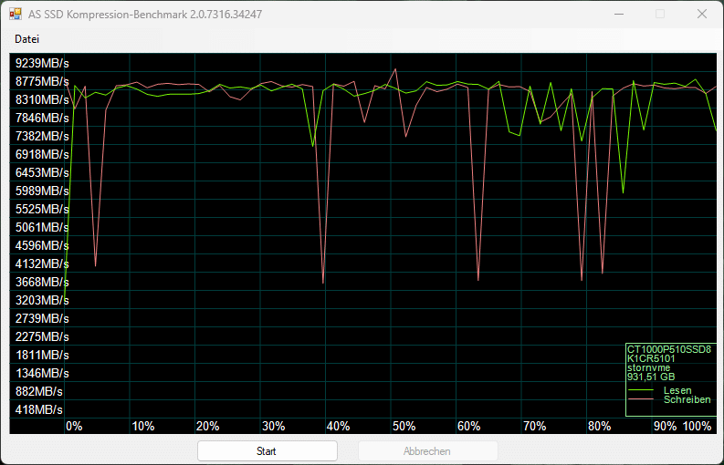 Wenn wir uns nun den AS SSD Benchmark genauer anschauen, fällt auf, dass sich die Crucial P510 1TB leistungstechnisch etwas unterhalb der herstellereigenen T-Serie einpendelt. Liefert die Crucial T705 noch einen massiven Vorsprung ab, so ist die P510 am ehesten mit einem leichten Rückstand zur T500 vergleichbar. Ungleichmäßiger wird es allerdings beim Kompressions-Benchmark, welcher auch bei mehreren Testversuchen durchaus Schwankungen in der Schreibleistung aufweist. Beim sequenziellen Lesen erreichen wir mit CrystalDiskMark ziemlich genau die vom Hersteller angegebenen 11.000 MB/s. Beim Schreiben liegen wir mit der Crucial P510 mit rund 100 MB/s etwas unter der Herstellerangabe von 9.500 MB/s. Im 4K-Test kann die P510 jedoch, wie auch das Schwestermodell Crucial P310, nicht ganz glänzen und büßt durchaus an Leistung ein. Dafür landen wir bei den Zugriffszeiten mit rund 0,026 im oberen Mittelfeld. Auch hier liegt die Crucial P510 fast gleichauf mit der T-Serie, wenn auch nicht ganz auf Augenhöhe.