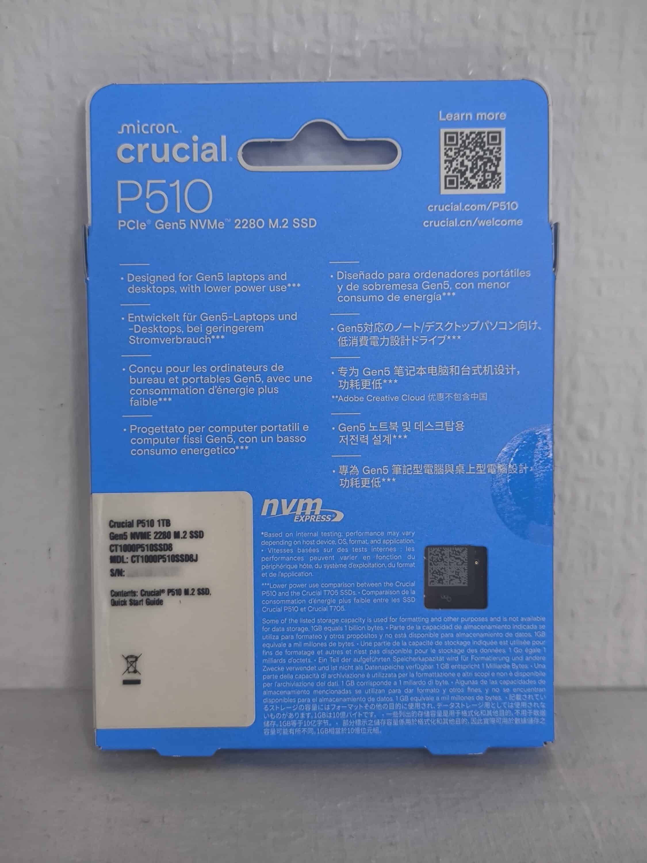 Die Crucial P510 1 TB wird in der markentypischen blauen Pappverpackung des Herstellers ausgeliefert. Zum Schutz vor eventuellen Transportschäden befindet sich die P510 in einer durchsichtigen Plastikhülle. Zusätzlich liegt eine kleine Broschüre respektive das Handbuch bei, das weiterführende Informationen rund um die Crucial SSD enthält.