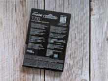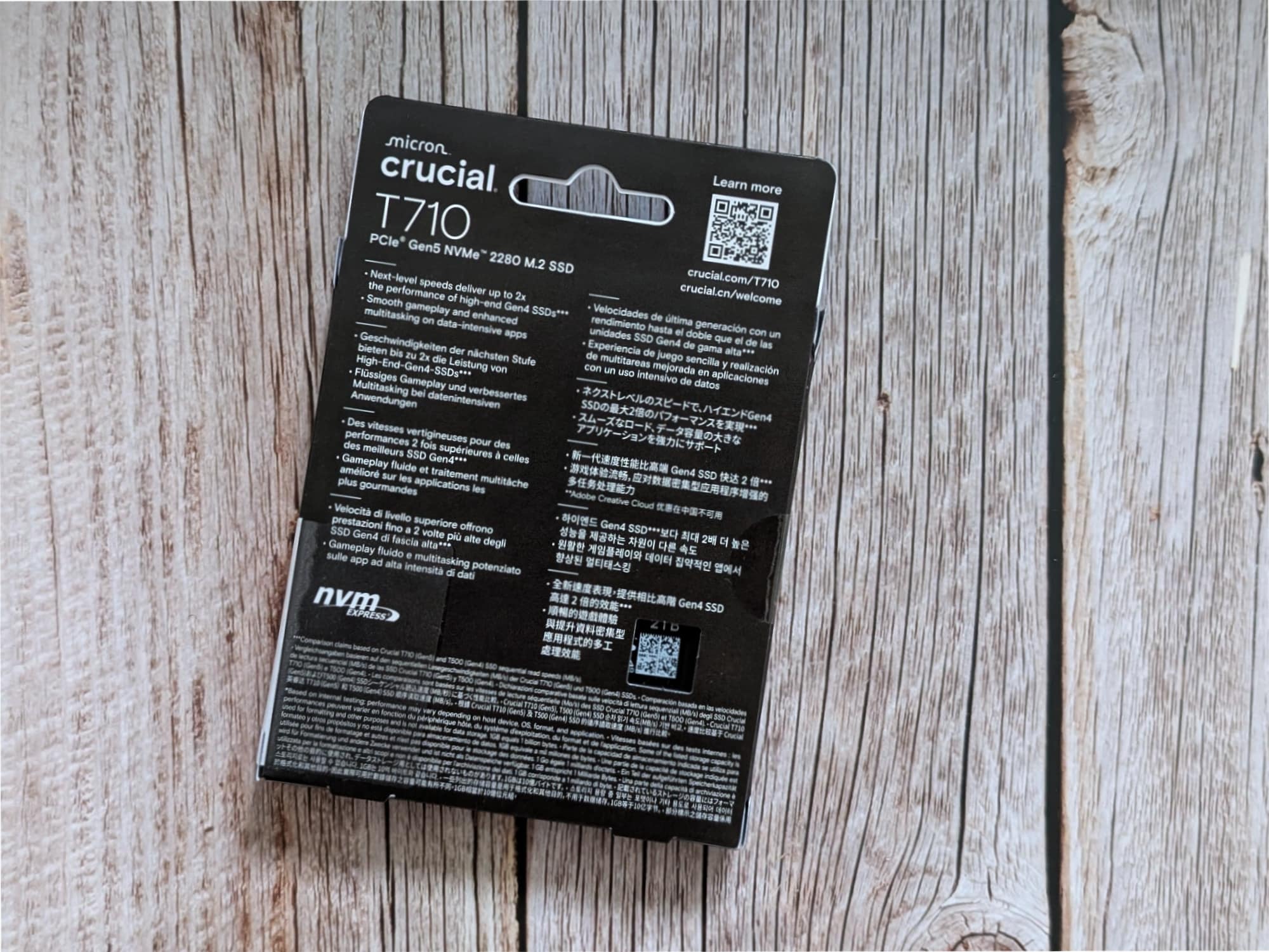 Die Crucial T710 wird in einem kompakten, schwarz blauen Karton geliefert. Auf der Vorderseite befinden sich ein Bild der SSD sowie Angaben zur Kapazität, Schnittstelle und maximalen Übertragungsraten. Auf der Rückseite befinden sich weitere Informationen und auf der Seite die Modellnummer. Die SSD selbst ist zudem mit der Angabe zur Kapazität durch einen Ausschnitt auf der Rückseite des Kartons sichtbar.