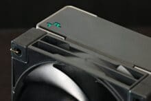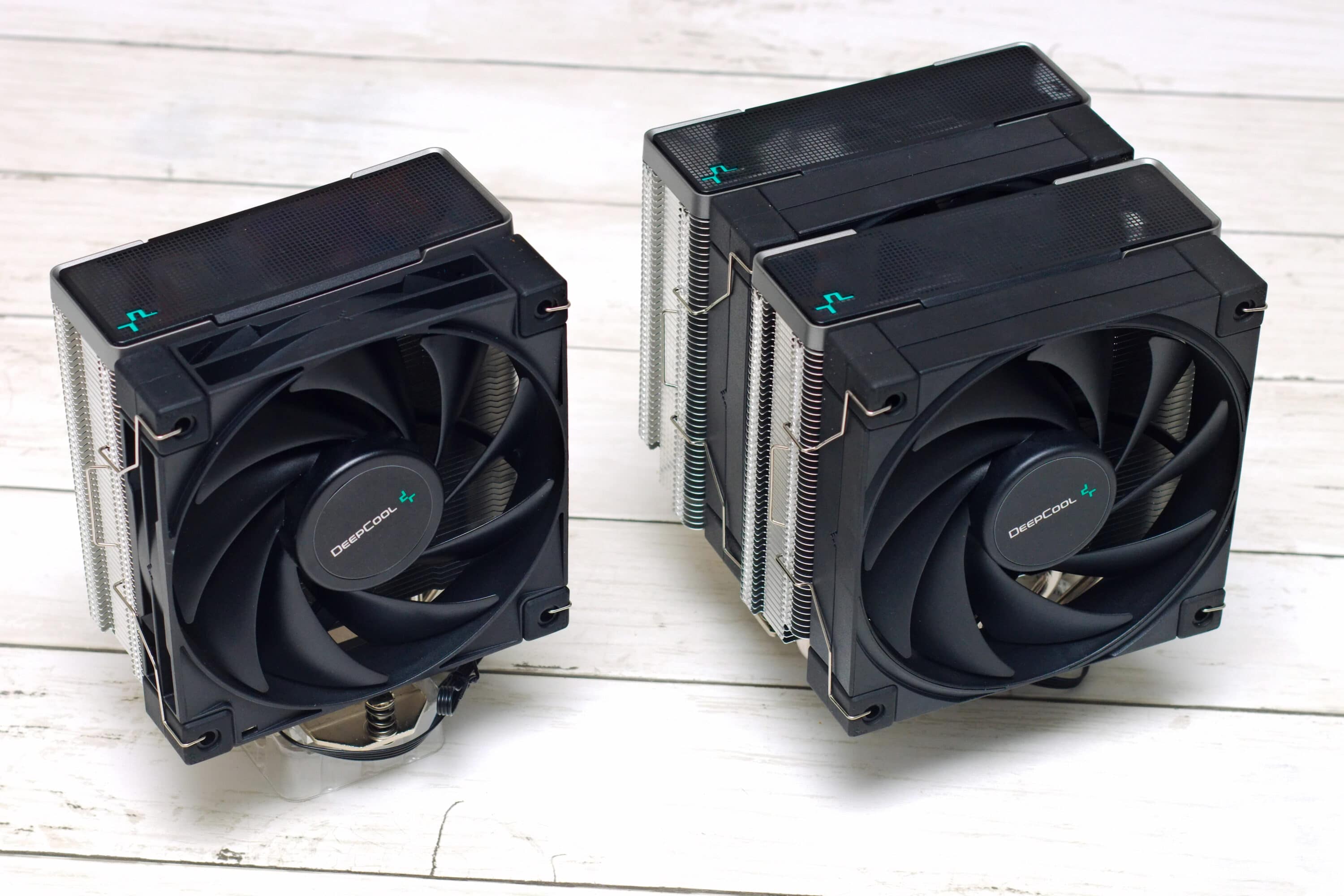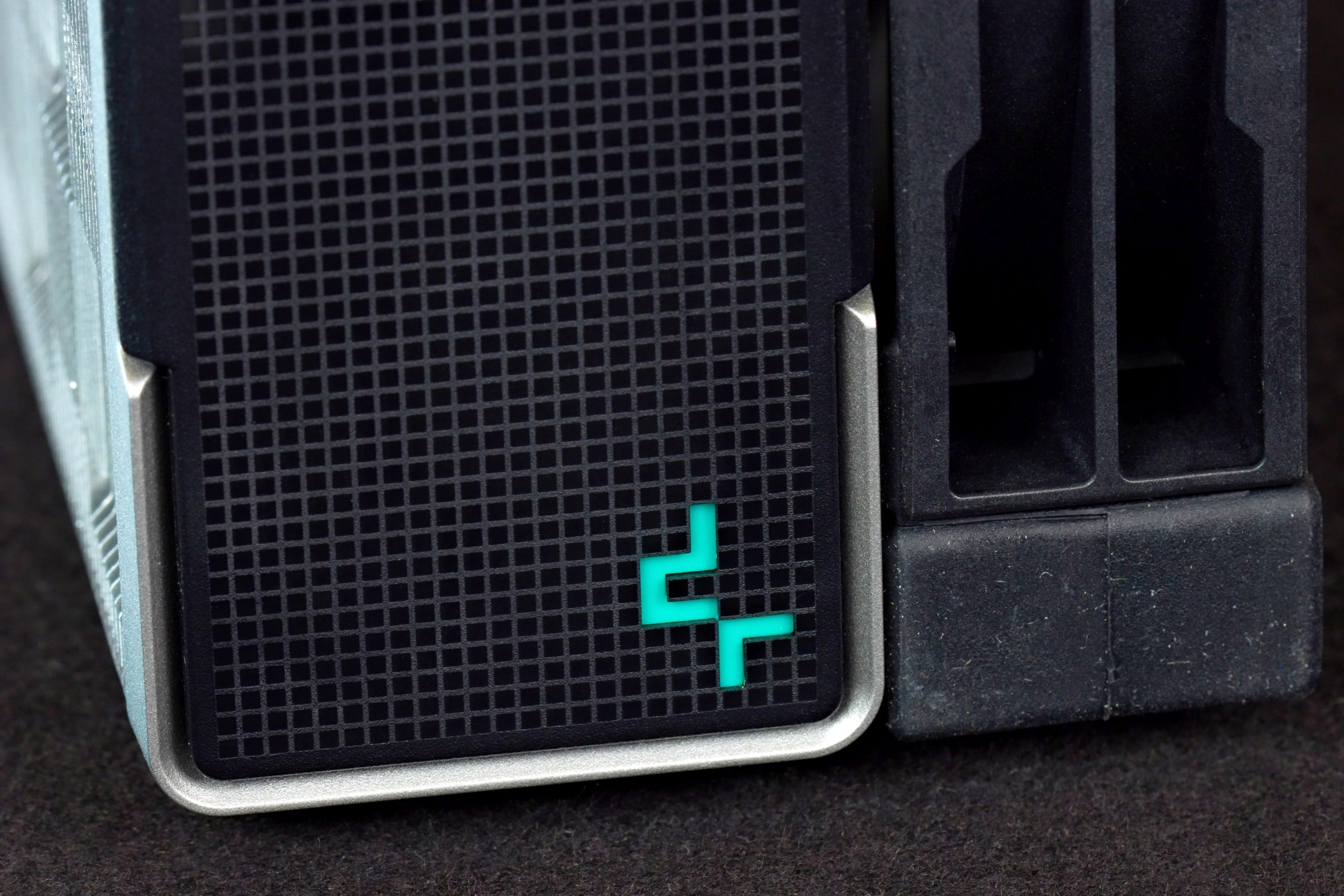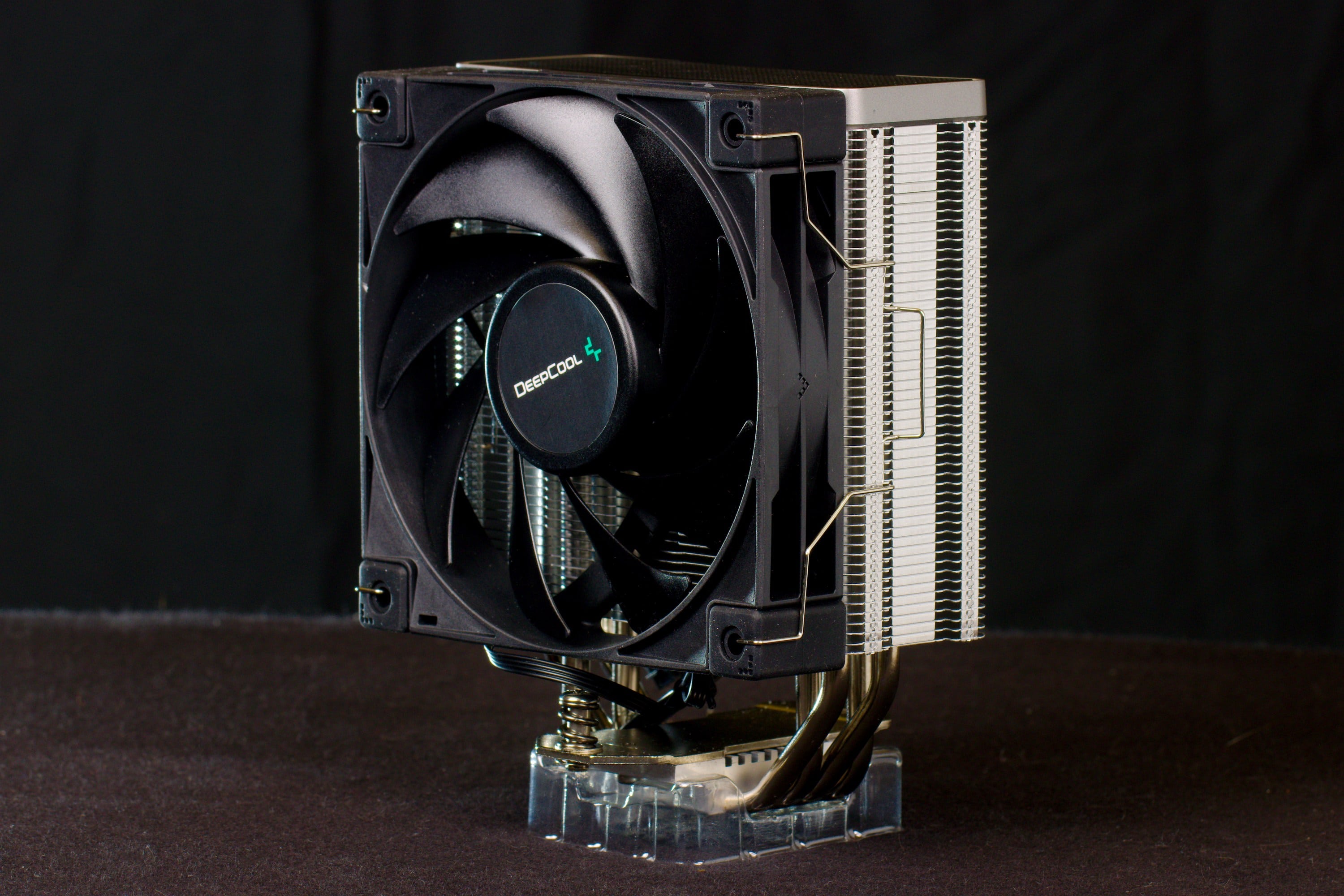 Bei genauerer Analyse fällt jedoch auf, dass es mehr Unterschiede gibt als nur ein Tower auf dem AK400 gegenüber zwei auf dem AK620. So wurde hier auf eine Base Plate verzichtet und die vier 6-mm-Heatpipes sollen die Hitze des Prozessors direkt auf die dicht beieinander liegenden Lamellen verteilen. Auch der Lüfter, hier ein DeepCool FC12P, unterscheidet sich etwas vom FK120 des AK620 und wirkt durch eine etwas andere Rahmenform nicht ganz so massiv quadratisch, wobei durch die Single-Tower-Konstruktion sowieso keine quadratische Form – von oben gesehen – möglich ist.