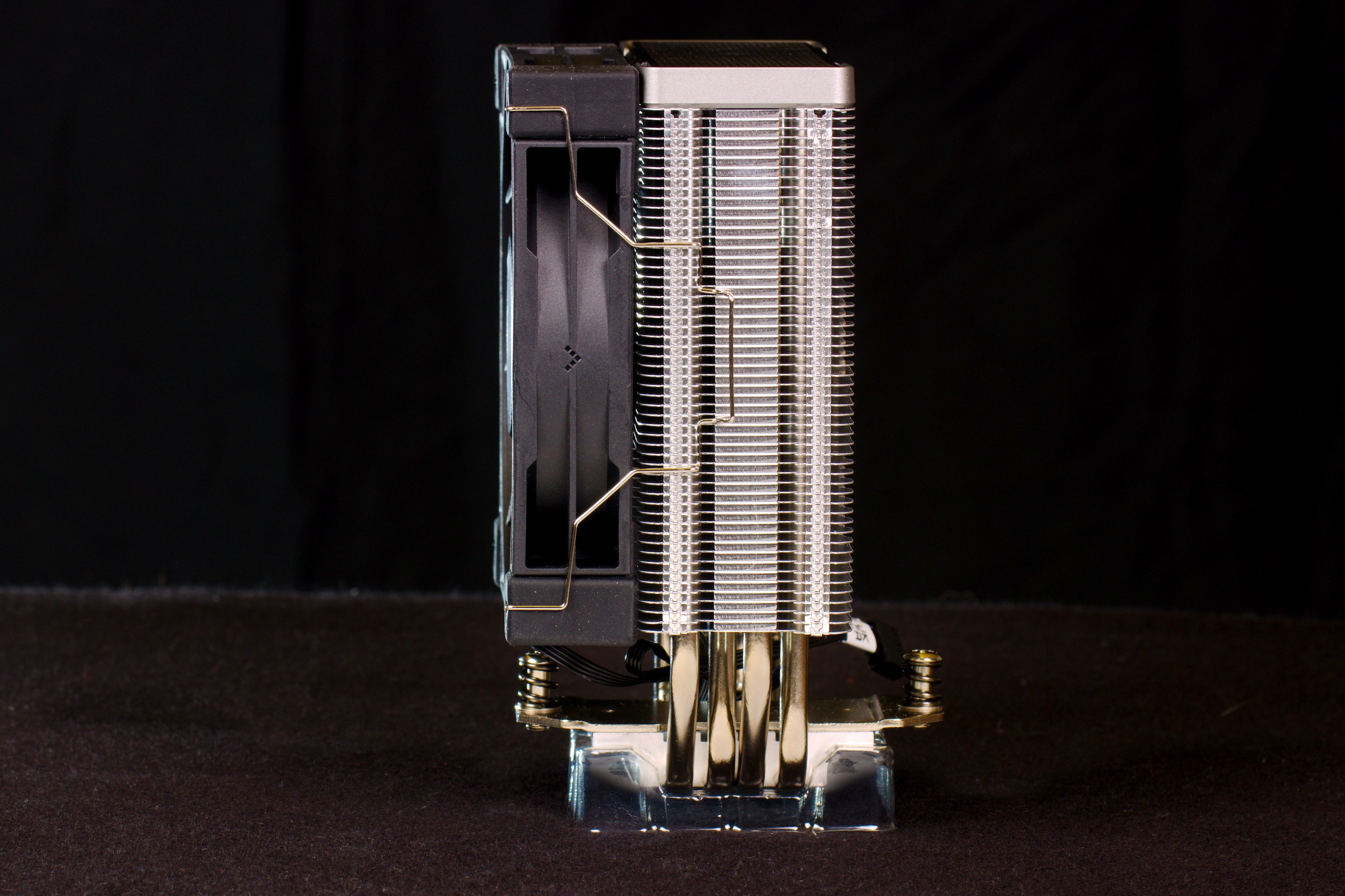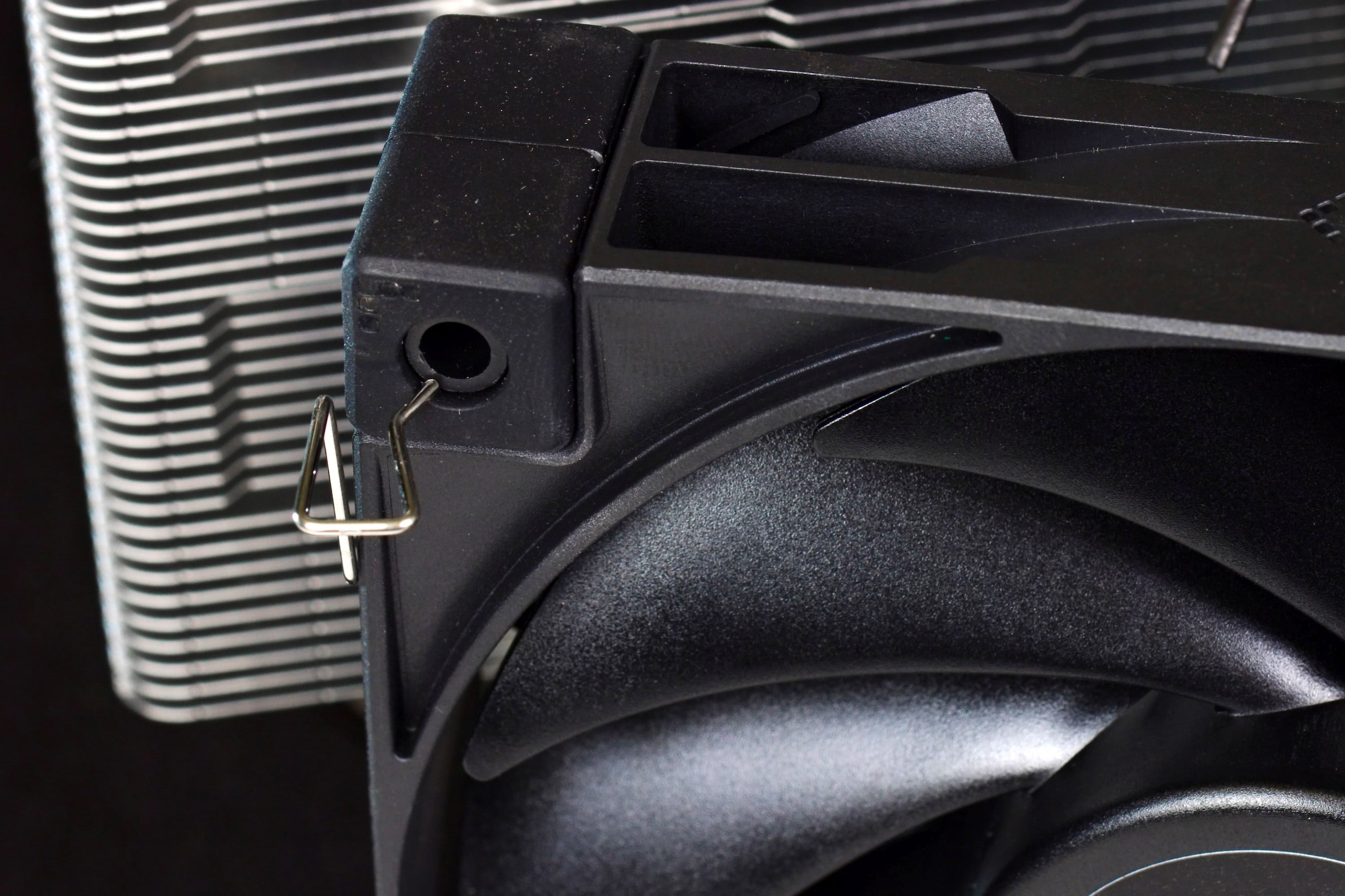 Der Lüfter wirkt weitestgehend robust und verwindungssteif, wenn auch der Kunststoff einen etwas günstigeren Eindruck macht. Die Ecken sind komplett aus Gummi gehalten, um Vibrationen in alle Richtungen abzudämpfen, haben jedoch den Nachteil, dass sie Staub magisch anzuziehen und festzuhalten scheinen. Dieser Staub ist schwer zu entfernen und trübt etwas den optischen Gesamteindruck des Kühlers. Die Klammern, die den Lüfter halten, haben einen guten Sitz am Lüfter und fallen nicht einfach ab; darüber hinaus braucht man nicht viel Kraft, um sie am Kühlkörper einclippen zu lassen.