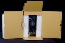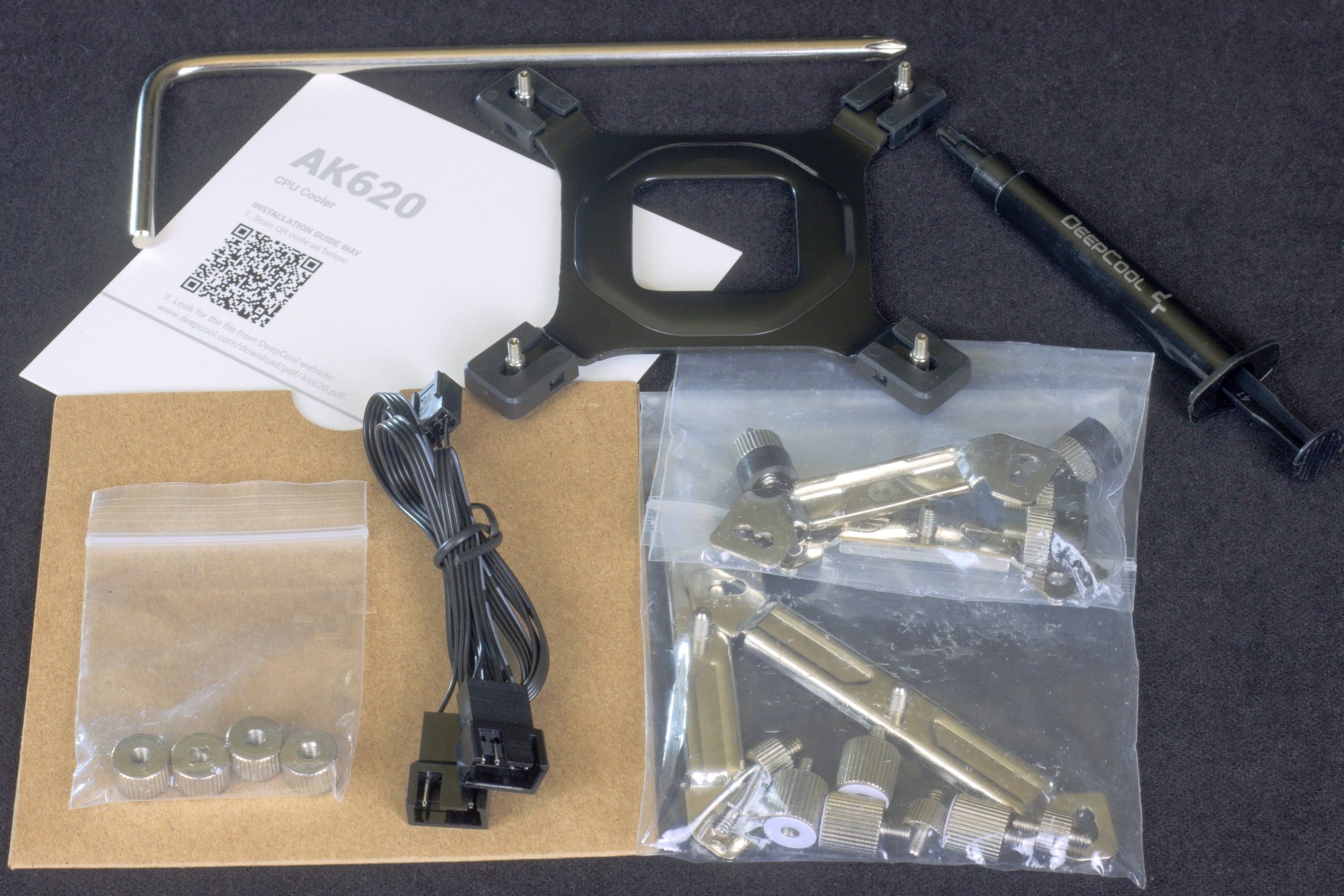 Im Gegensatz zum Design früherer Verpackungen wirkt die Box des DeepCool AK620 deutlich erwachsener und weniger verspielt. Der gewohnte Türkiston ist gewichen und auch das neue Logo ziert die Box. Öffnet man die Verpackung, sieht man frontal auf den komplett mit Lüftern vormontierten Kühler, der von einem Schaumstoff geschützt wird. Darüber befindet sich eine Box mit dem Montagematerial. Darin finden sich Befestigungen für Intel-Systeme aller Core-i-Generationen, inzwischen inklusive LGA 1700, und für die größeren Sockel LGA 2011 und 2066. Darüber hinaus sind die mitgelieferten Brackets kompatibel zu aktuellen AMD-Sockeln wie AM4 und AM5. Weitere Sachen in der Box sind ein Y-Splitter für die Lüfter, um beide über einen Header betreiben zu können, eine kleine Tube Wärmeleitpaste ohne genauere Bezeichnung und ein Schraubendreher im Stile der von Noctua mitgelieferten. Eine gedruckte Anleitung sucht man vergebens: Hier liegt eine kleine Karte bei, die auf die DeepCool-Webseite verweist (auch direkt mit QR-Code, falls man mit dem Handy arbeitet), wo sich die Anleitung in digitaler Form findet.