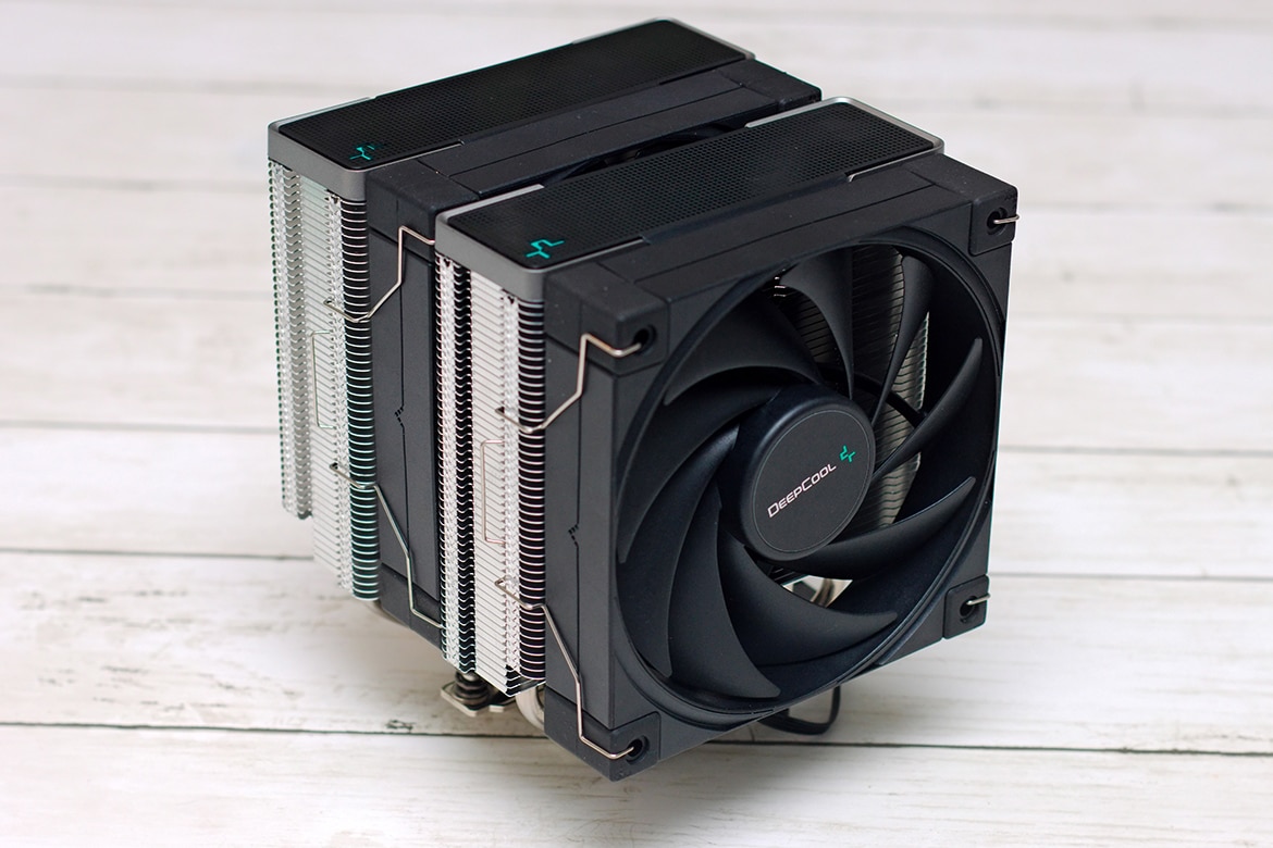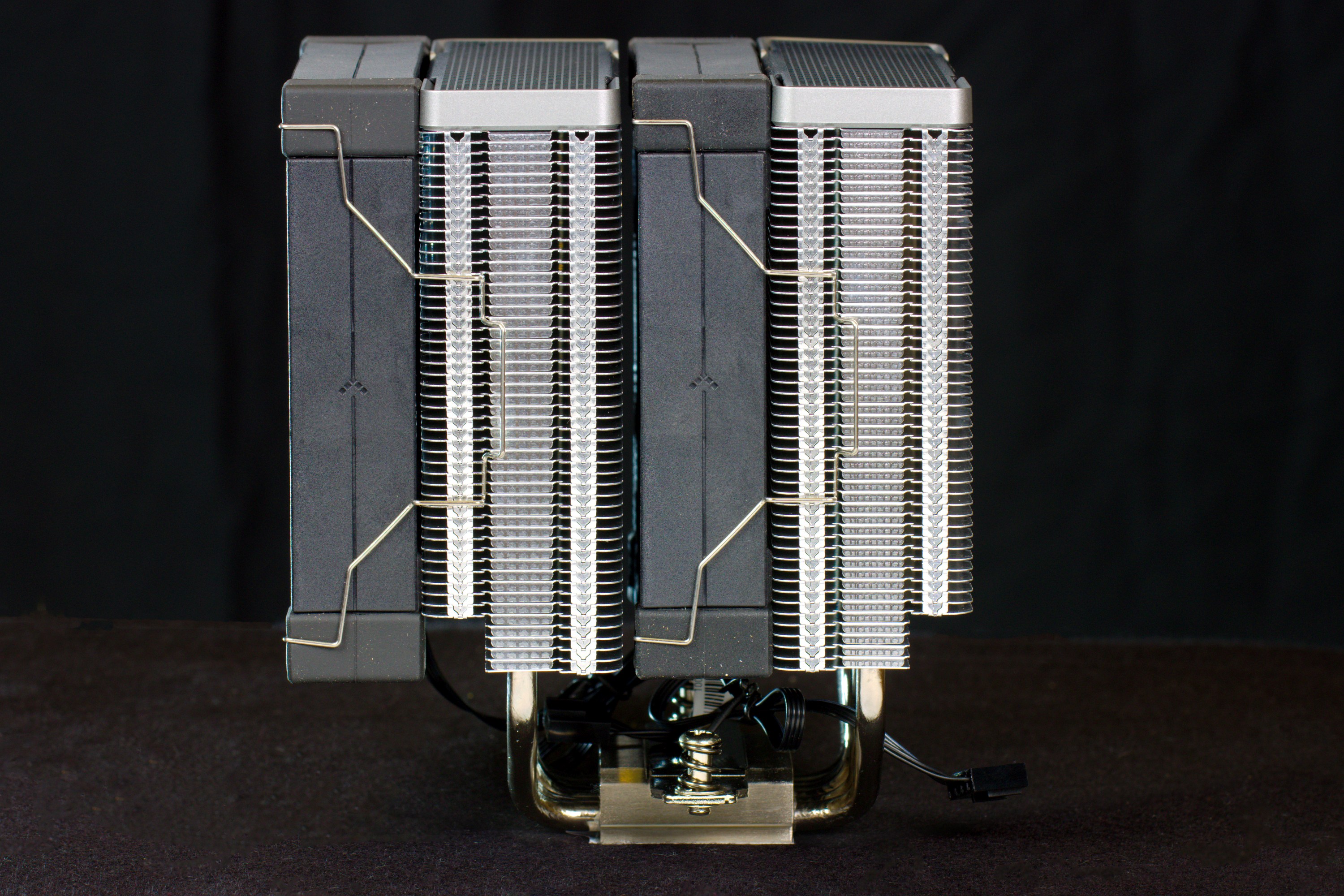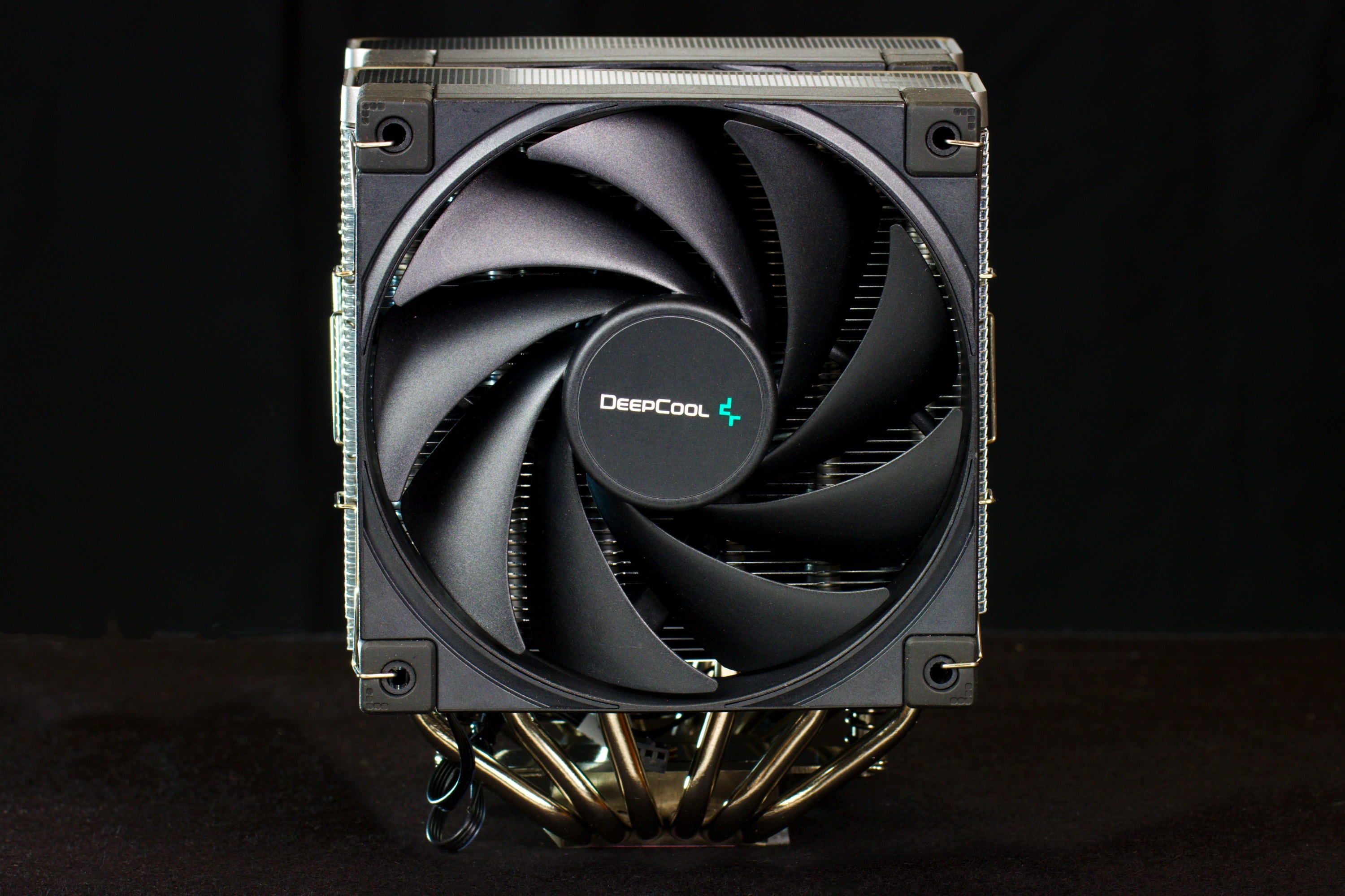 Der DeepCool AK620 wirkt edel mit seinen Abdeckungen für die Enden der Heatpipes, die nahezu lückenlos abschließen mit den Lüftern, welche betont quadratisch sind. Die Sicht auf den komplett montierten Kühler mit seinen zwei Lüftern wirkt fast ebenso quadratisch. Das ergibt ein sehr harmonisches Bild, was beim größeren Assassin III beispielsweise nicht ganz so der Fall war.