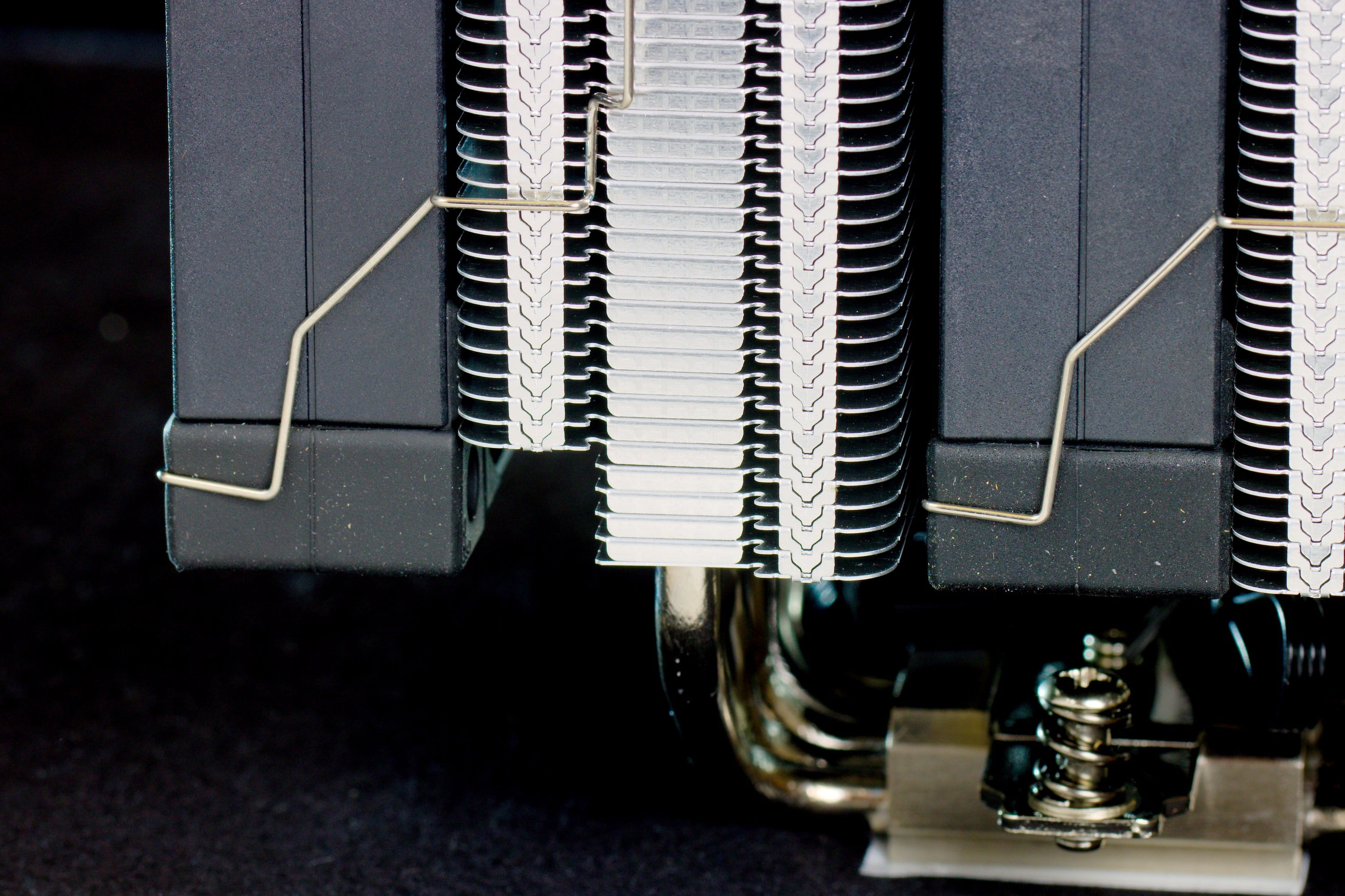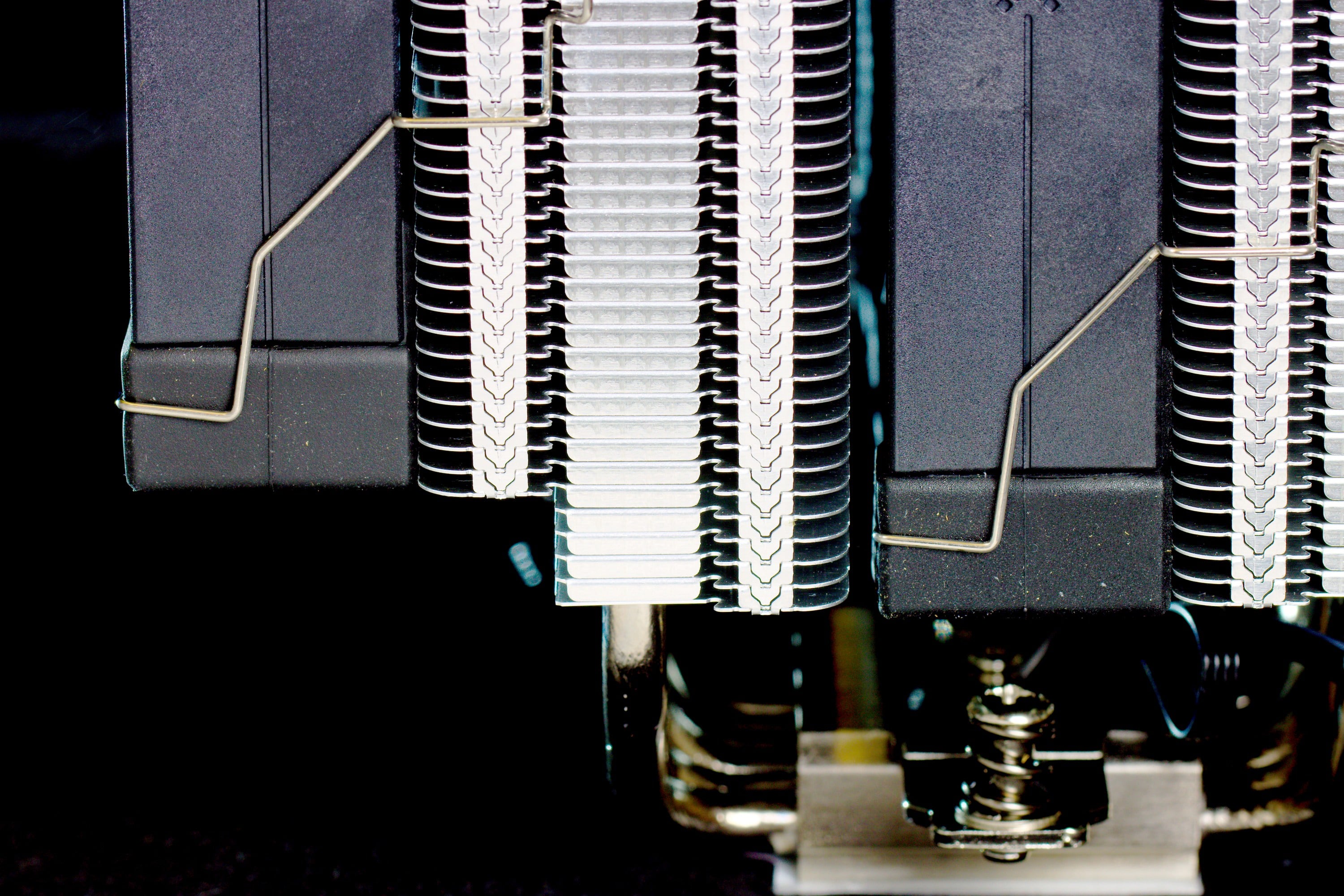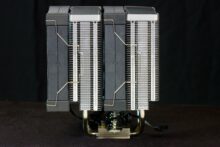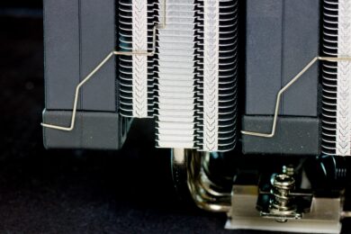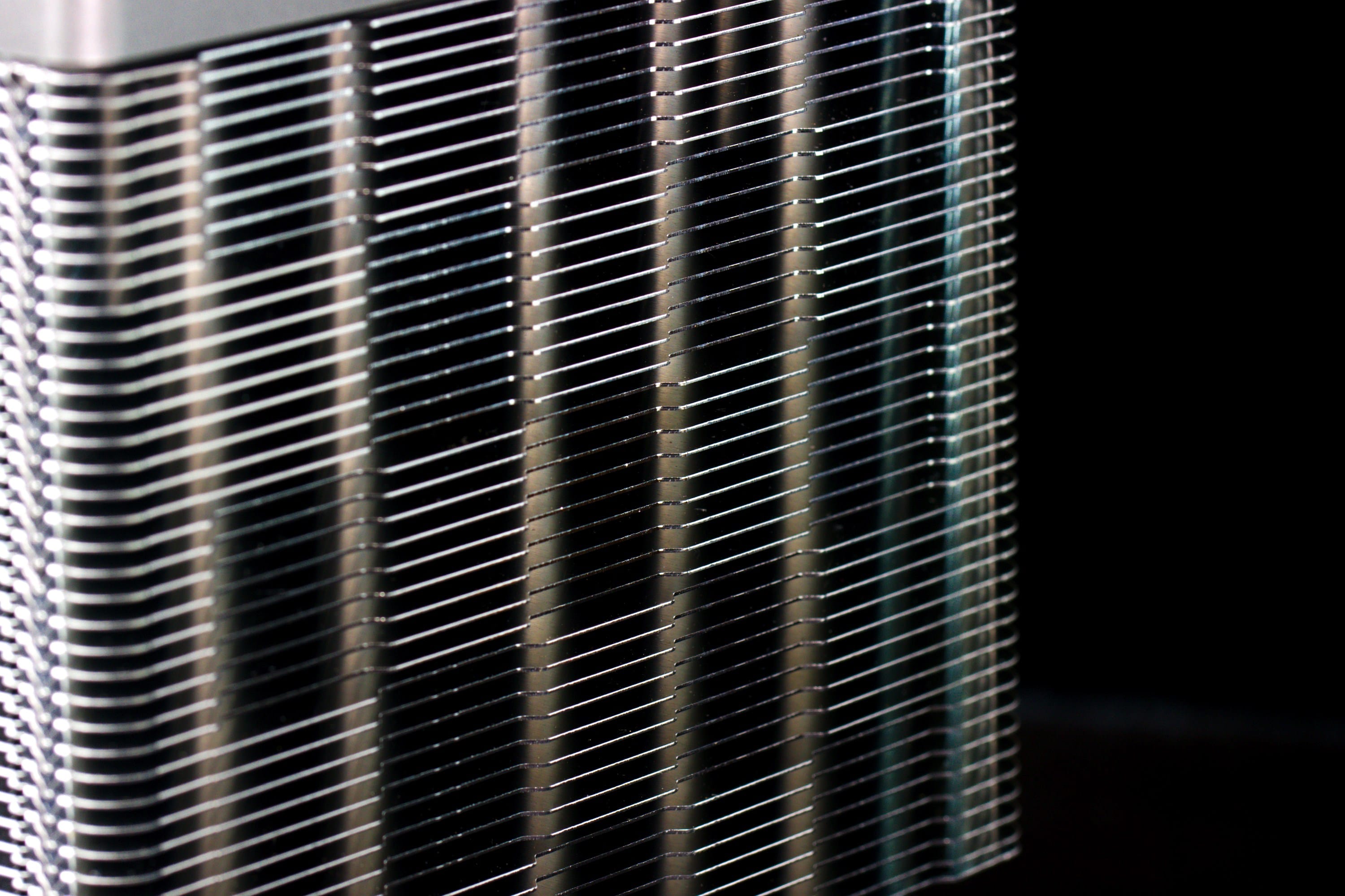 Der Kühlkörper selbst wirkt mit seinen sechs 6-mm-Heatpipes ordentlich ausgestattet und diese verteilen die Wärme auf die dicht beieinander liegende Lamellen. Eine Besonderheit der Lamellen ist, dass diese nicht glatt enden, sondern eine Art 3D-Muster aus Quadraten bilden. Dies mag eine rein optische Spielerei sein, die sich nicht auf die Leistung auswirkt, doch vermittelt das Muster einen edlen Eindruck. Die Kupfer-Heatpipes sind vernickelt und haben so den gleichen Farbton wie die Aluminium-Lamellen, was dafür sorgt, dass der schwarz-silberne Look nicht durch einen dritten Farbton unterbrochen wird. Die Kontaktfläche zum Prozessor ist ebenfalls aus vernickeltem Kupfer und verteilt die Hitze gleichmäßig auf die Heatpipes. Was es am DeepCool AK620 nicht gibt, das ist eine RGB-Beleuchtung, die zum sachlich-edlen Konzept nicht passt und außerdem den Preis ohne praktische Leistungssteigerung in die Höhe getrieben hätte.