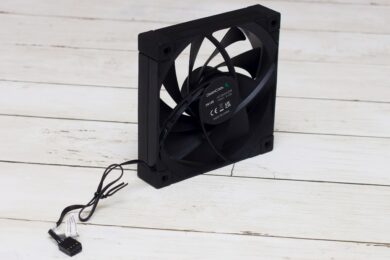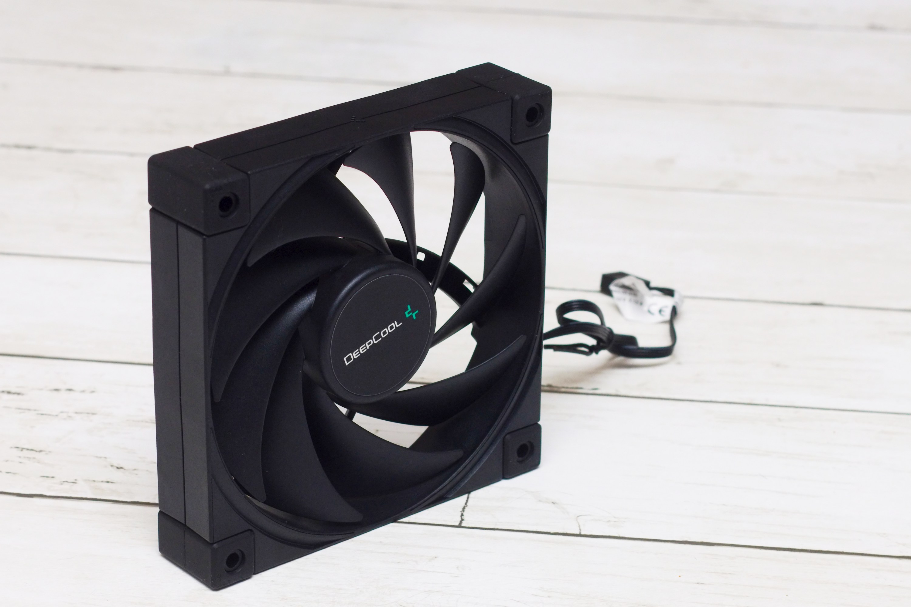 Die Lüfter sind DeepCool FK120 mit Fluid Dynamic Bearing, welche zum Zeitpunkt der Review-Erstellung auch einzeln oder in Dreierpacks zumindest in schwarz auf dem Markt erschienen sind, um einen einheitlichen Stil im Gehäuse durchziehen zu können. Die Lüfter wirken recht robust und verwindungssteif, doch der verwendete Kunststoff wirkt insbesondere an den Lüfterblättern recht standardmäßig. Die Ecken der Lüfter sind komplett aus Gummi, um so Vibrationen in alle Richtungen zu dämpfen. Ein Nachteil des Gummis ist jedoch, dass dieser nicht ganz leicht vom Staub zu befreien ist und diese staubigen Ecken stören etwas den ansonsten sehr edlen Eindruck, den der Kühler macht.