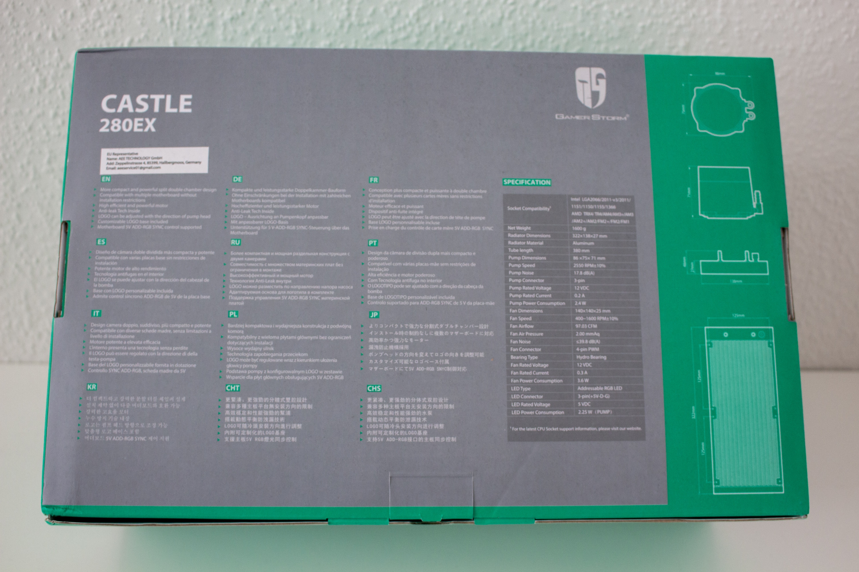 Die Deepcool Castle 280EX kommt gut und sicher verpackt in einem farbig bedruckten Karton aus Pappe. Durch die Verwendung von grauen und türkisen Farbtönen sowie einem farbigen Produktbild, sticht die Verpackung schon mal aus der Masse hervor. Neben den technischen Daten und den Zeichnungen von Radiator und Pumpe, hat außerdem eine Auflistung der wichtigsten Features einen Weg auf die Verpackung gefunden.