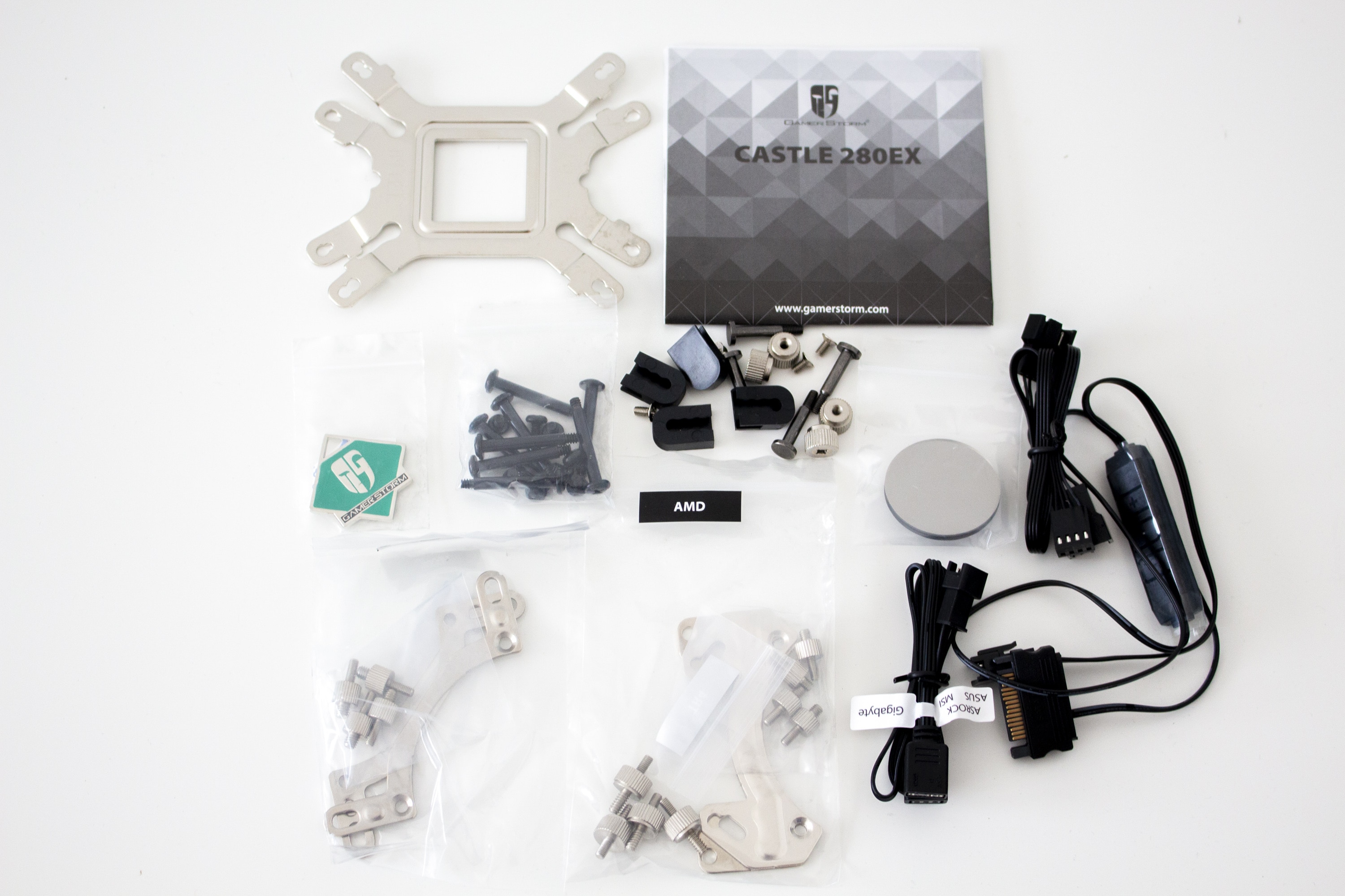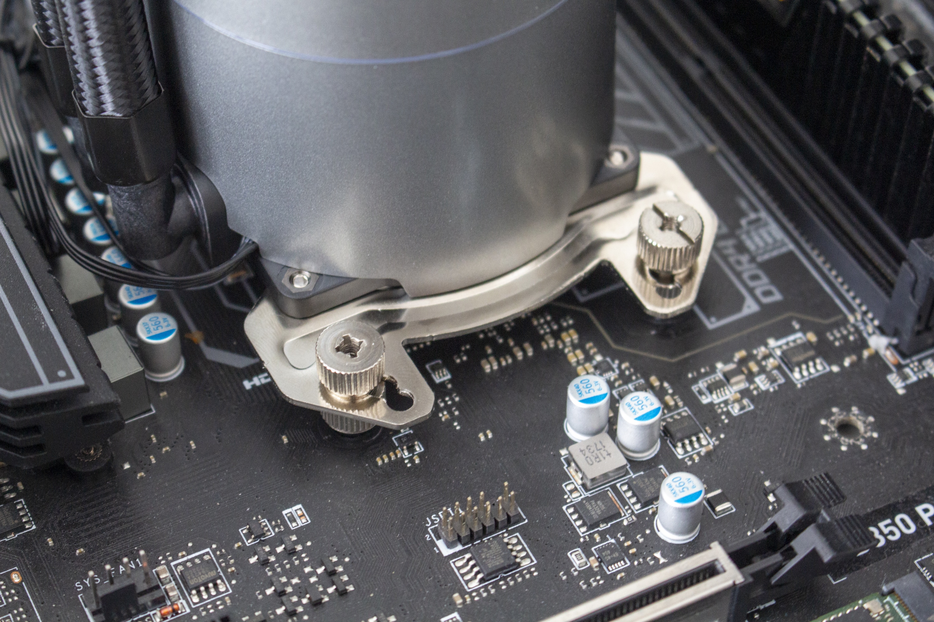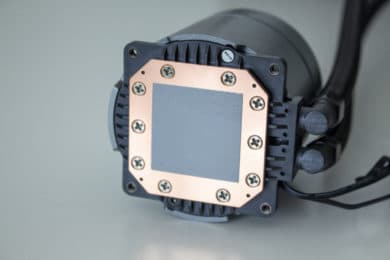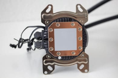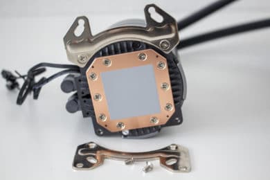 Anschließend muss die Pumpeneinheit vorbereitet werden. Diese kann bei der Deepcool Castle 280EX, unabhängig vom Sockel, in jeder Richtung ausgerichtet werden. Dazu legt der Hersteller für die unterschiedliche Sockel spezifische Haltebügel bei, die von unten an die Pumpe geschraubt werden müssen. Zuletzt setzt man die Pumpe auf den Prozessor und schraubt alles mit Hilfe von vier Muttern fest.