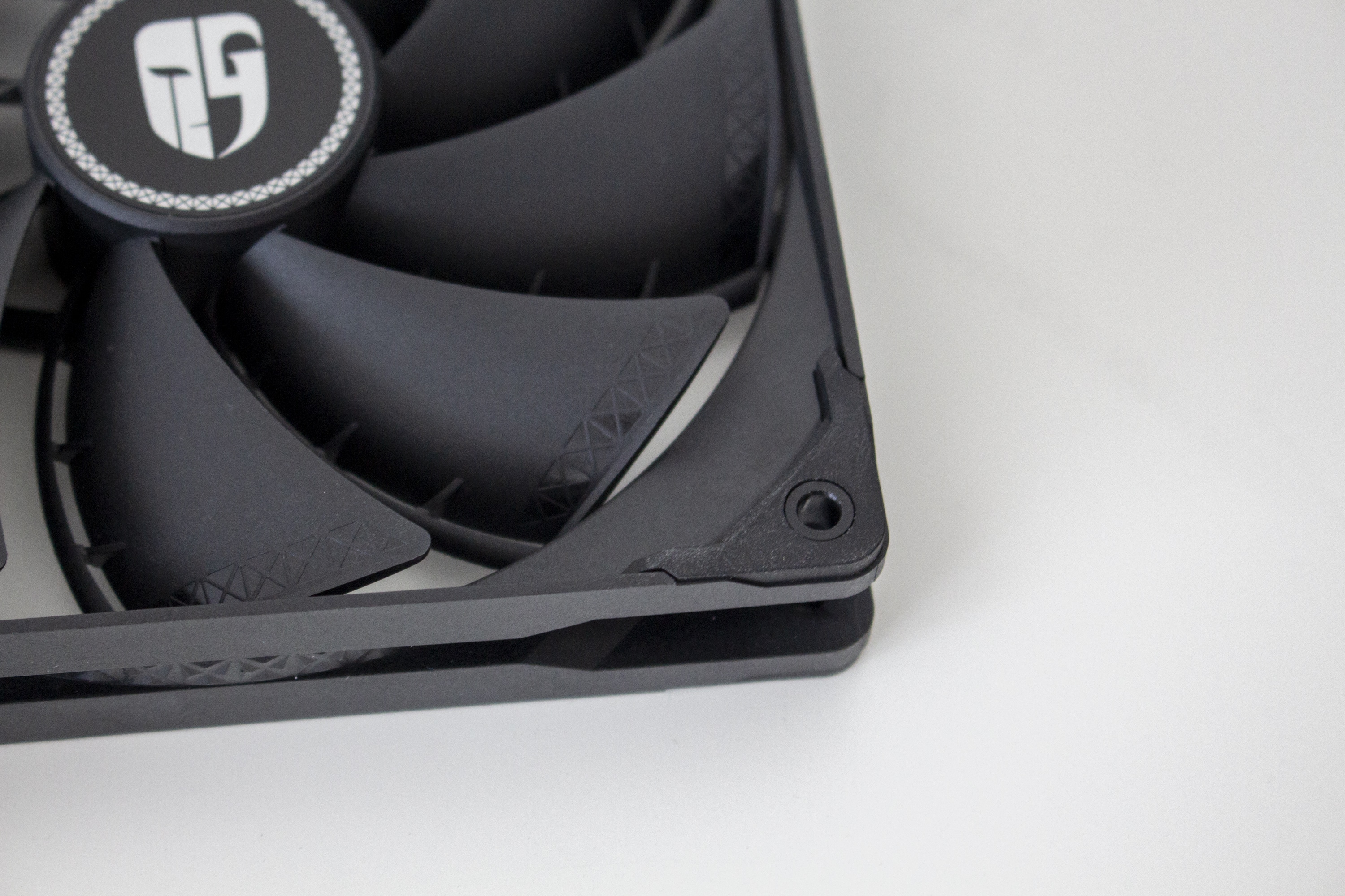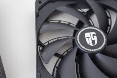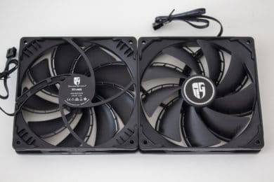 Die zwei mitgelieferten Lüfter vom Typ Deepcool TF140S sind komplett schwarz gehalten und wurden für die Erzeugung eines möglichst hohen Luftdrucks optimiert. Erreicht werden soll das durch neun Lüfterblätter die nah am Rahmen verlaufen und am hinteren Ende mit einer Art Spoiler versehen wurden. Beide Lüfter verfügen über einen separaten 4-Pin-PWM-Anschluss und drehen mit maximal 1600 Umdrehungen pro Minute. Zur Reduzierung von Schwingungen gibt es zudem beidseitig angebracht Gummi-Pads am Lüfterrahmen.