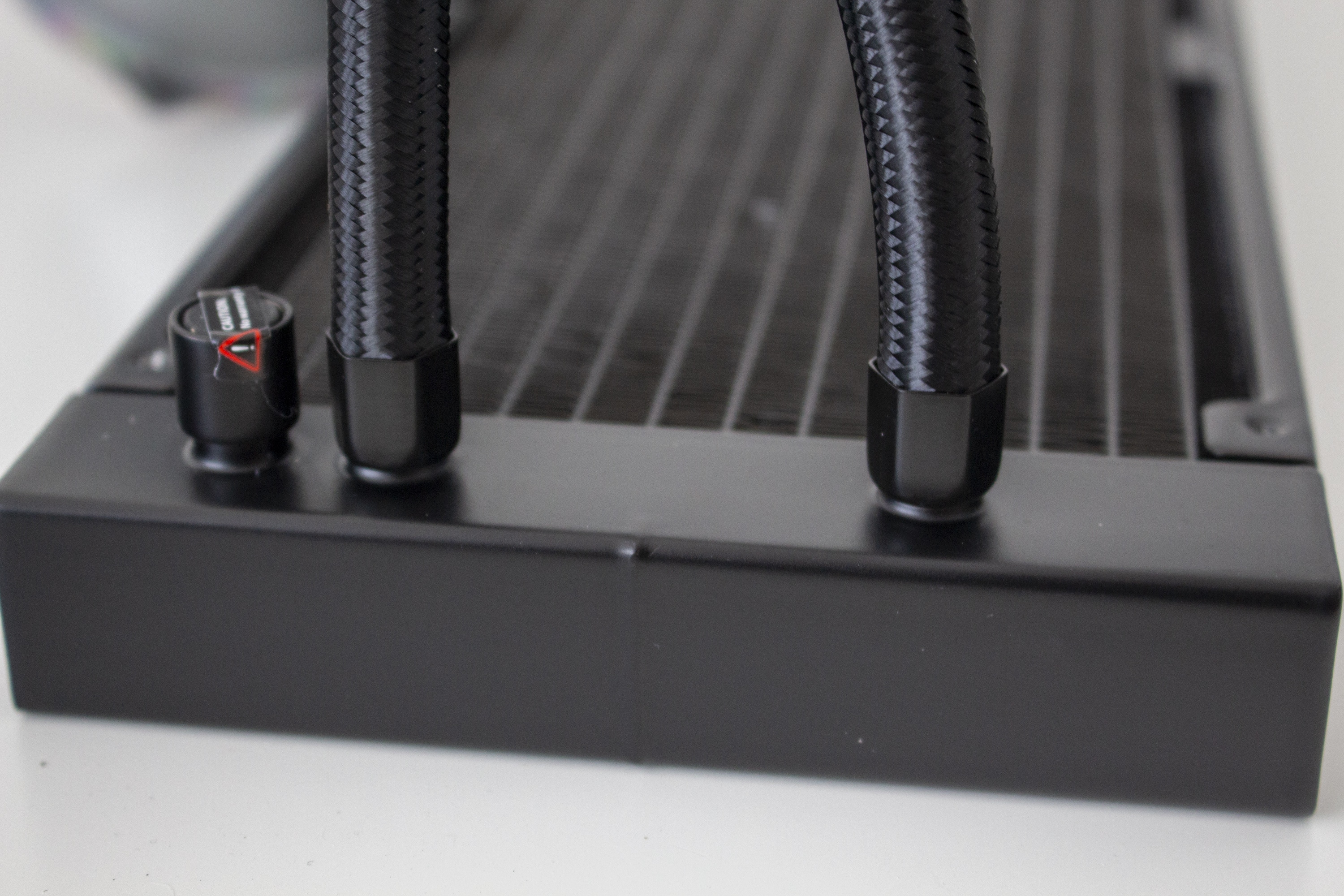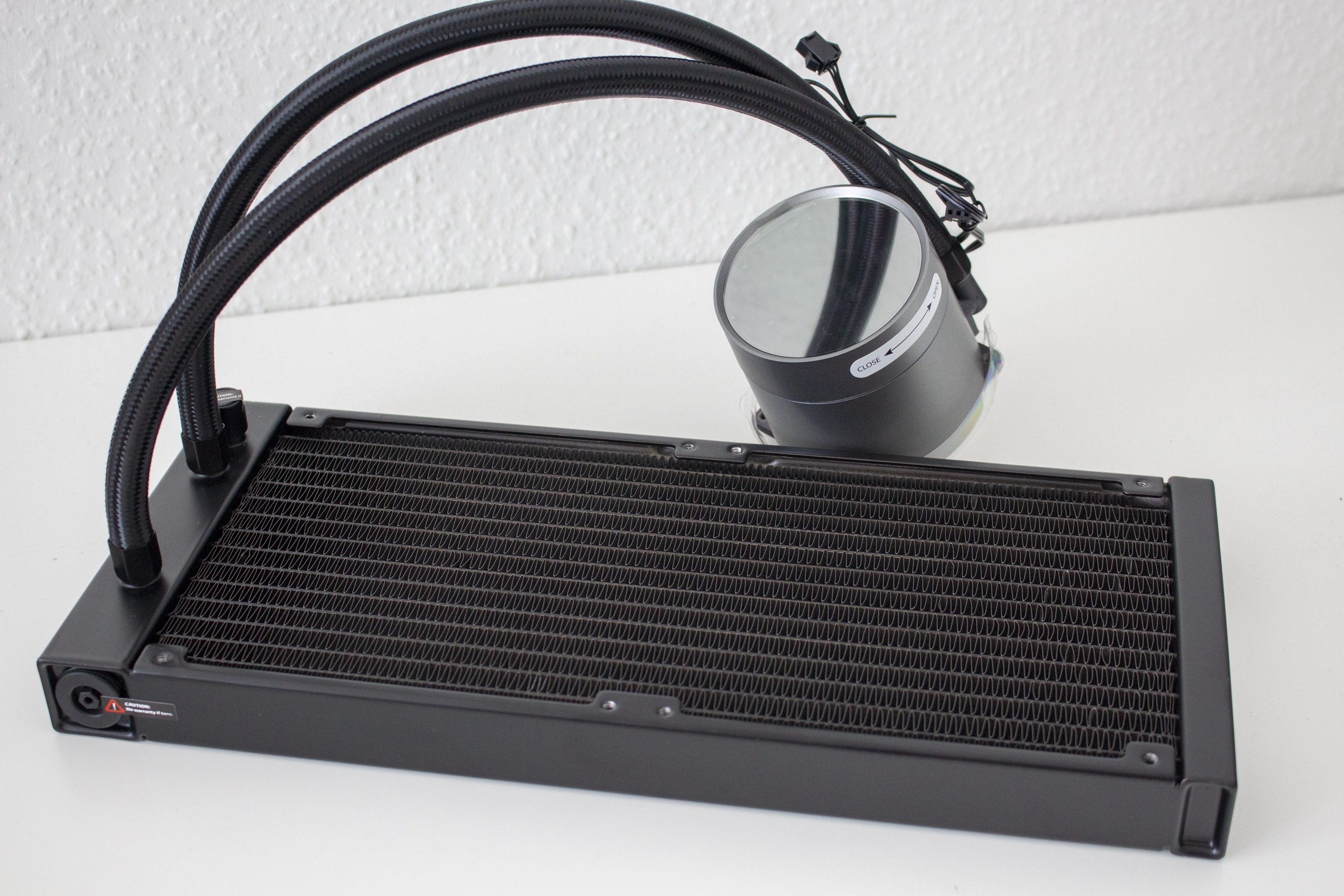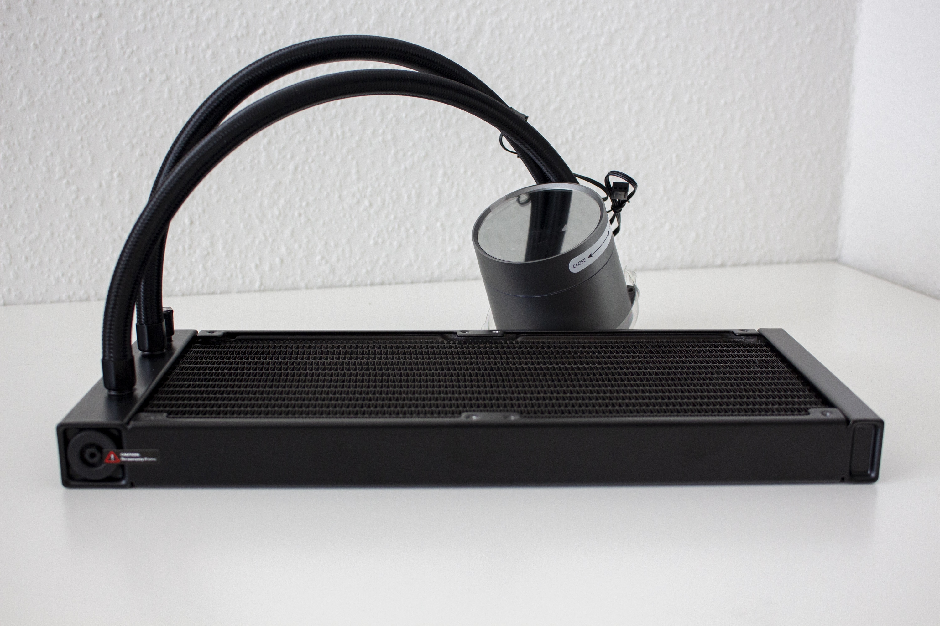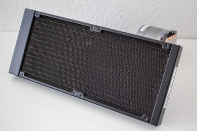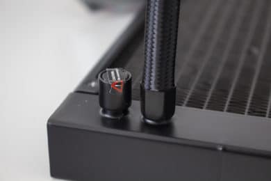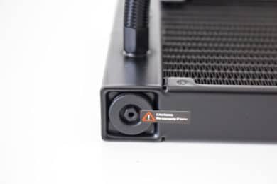 Bei der Optik geht Deepcool bei der Castle EX-Serie einen Mittelweg. So ist der 322 Millimeter lange Radiator aus Aluminium gefertigt und schlicht schwarz lackiert. Auf komplizierte Schriftzüge, Formen oder sonstige Aufdrücke, hat der Hersteller verzichtet. Am Radiator sind zwei, jeweils 380 Millimeter lange, Schläuche angeschlossen. Aus Gründen der Optik wurden die Schläuche schwarz gesleeved und enden am Radiator in zwei gepressten Metallgehäusen. Neben den Schläuchen gibt es zudem noch einen Auslass um den Radiator aufzufüllen oder zu entlüften. Dieser Prozess ist jedoch mit dem Verlust der Garantie verbunden. Selbiges gilt für das Öffnen des Überdruckventils auf der rechten Seite des Radiators.
