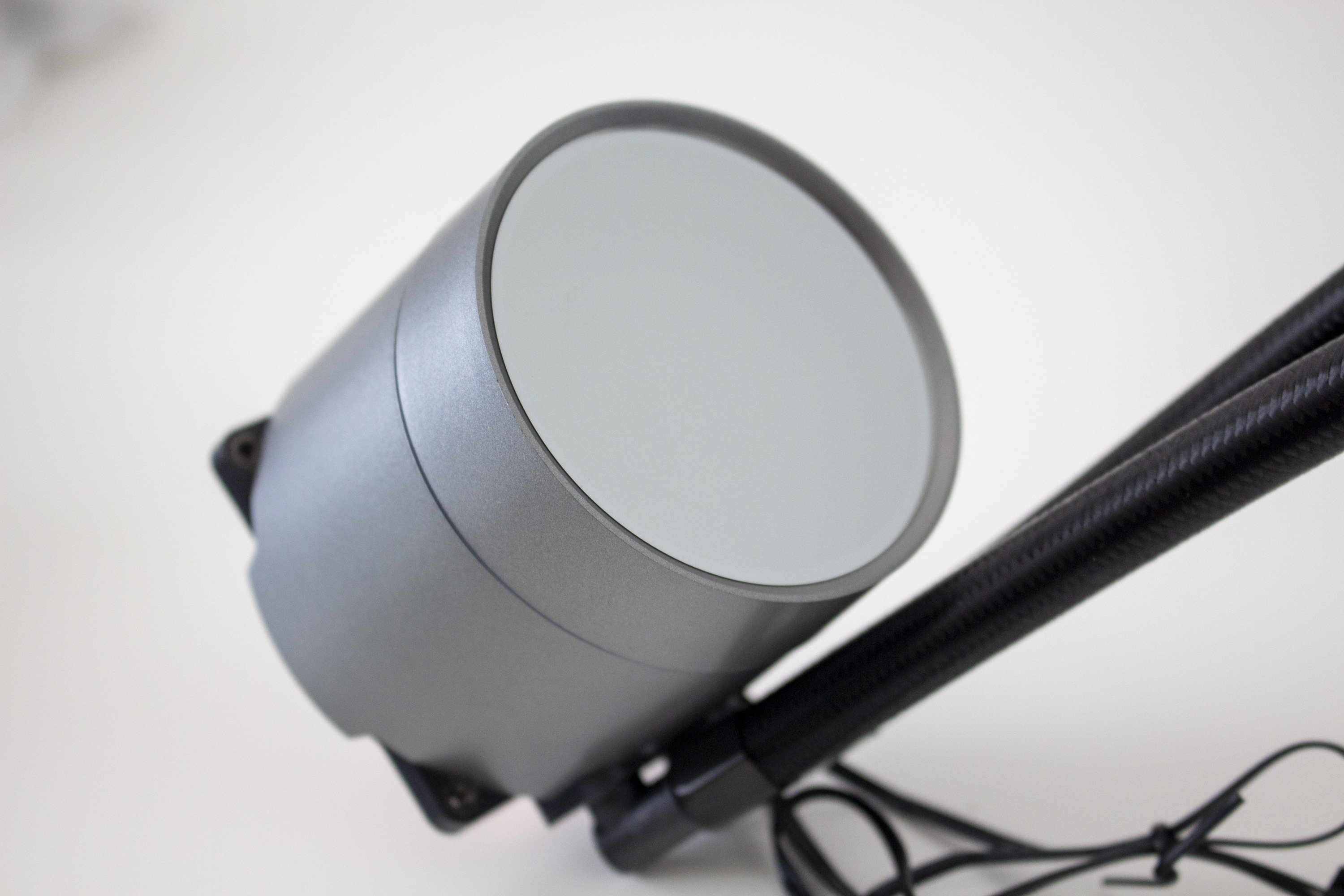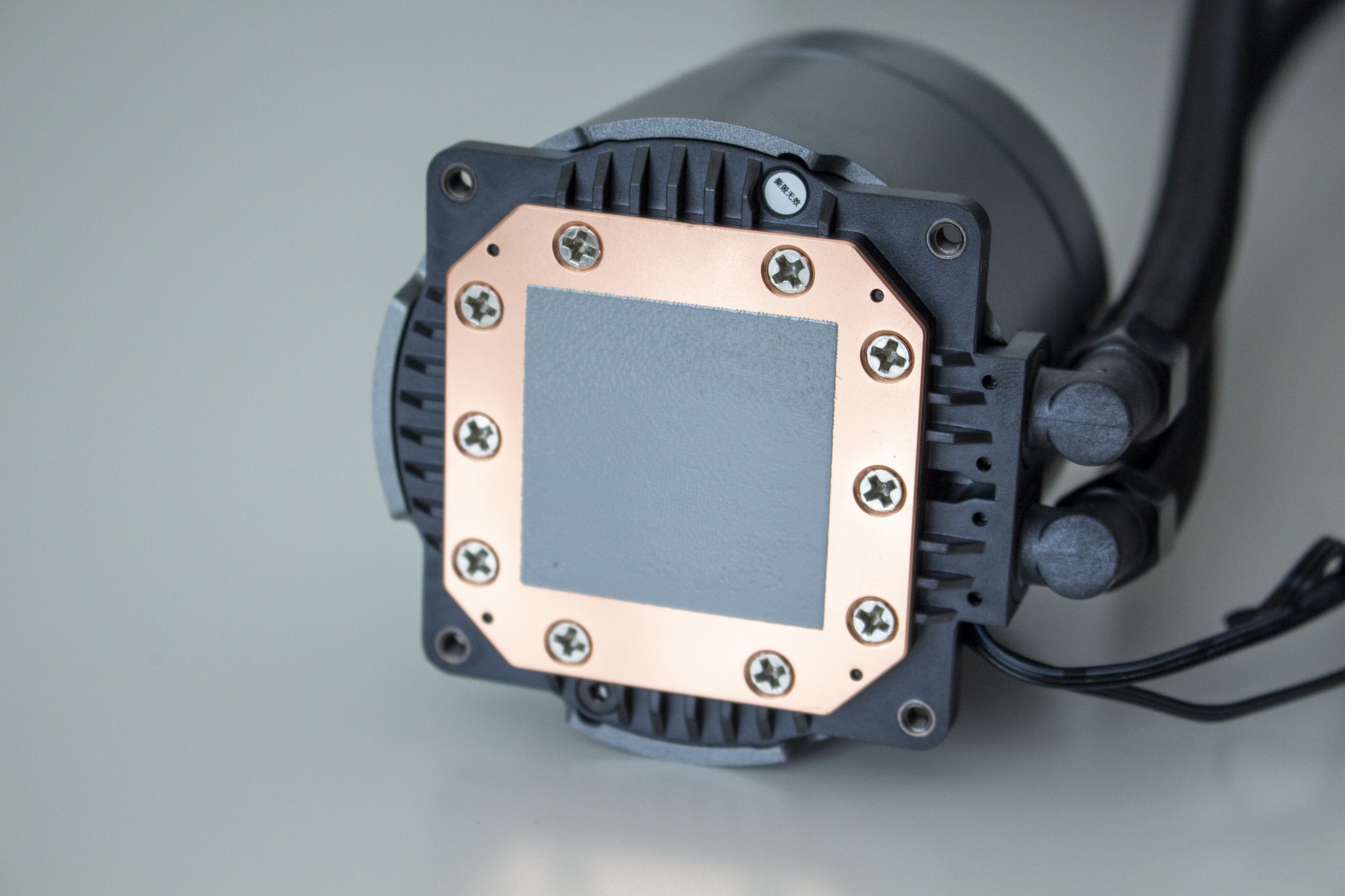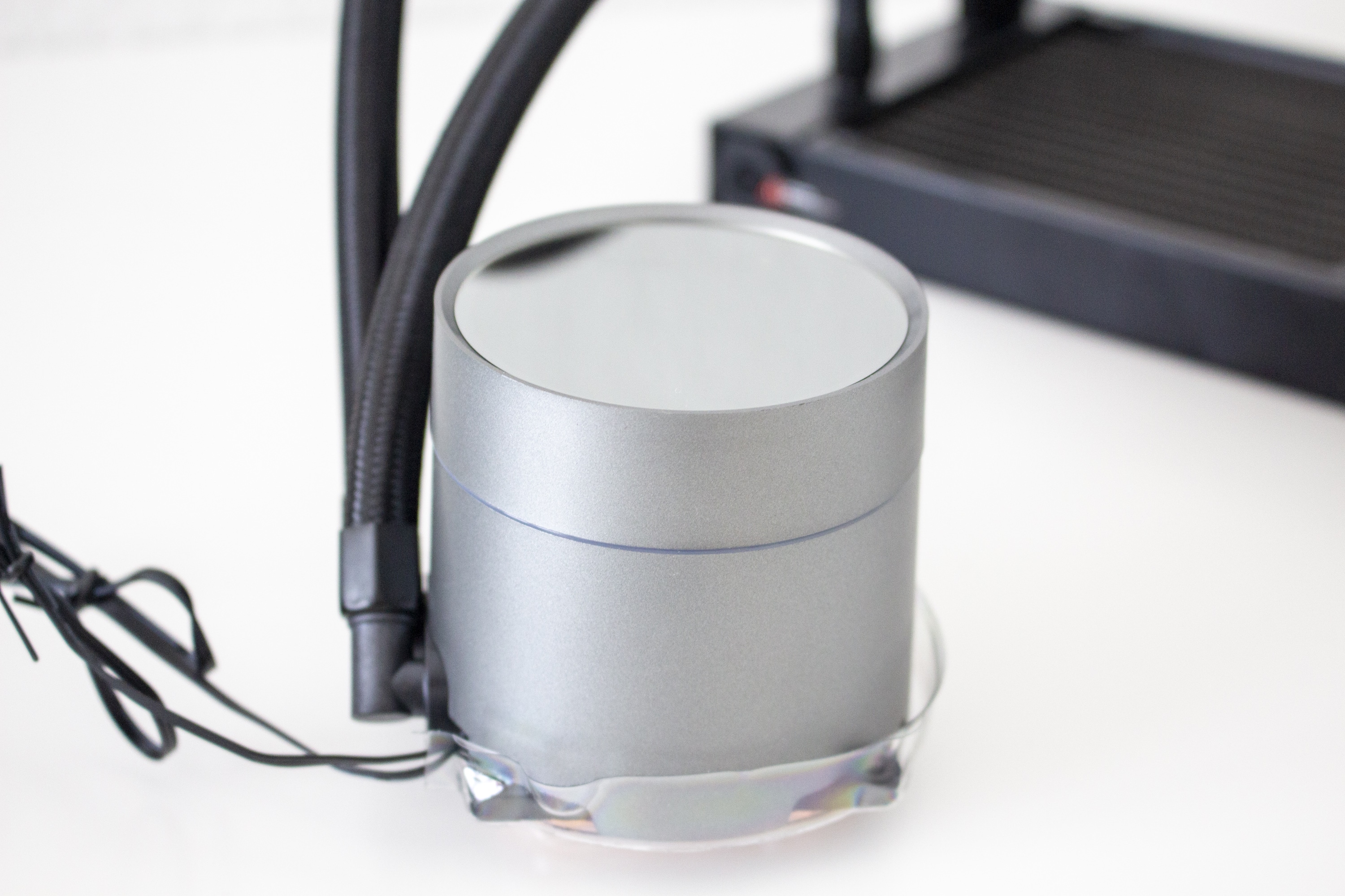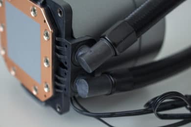 Am anderen Ende sind die Schläuche natürlich mit dem Pumpenblock verbunden. Diese Verbindung erfolgt über zwei schwenkbare Arme an welche die Schläuche gepresst wurden. Das runde Pumpengehäuse selbst besteht aus einem silberfarbenen Kunststoff und ist 71 Millimeter hoch. Die darin verborgene Pumpe dreht mit maximal 2550 Umdrehungen pro Minute und wird über ein 3-Pin-Kabel mit dem Mainboard verbunden. Die Bodenplatte ist selbstverständlich aus Kupfer gefertigt, wurde am Pumpenblock verschraubt und verfügt ab Werk über eine Schicht Wärmeleitpaste.