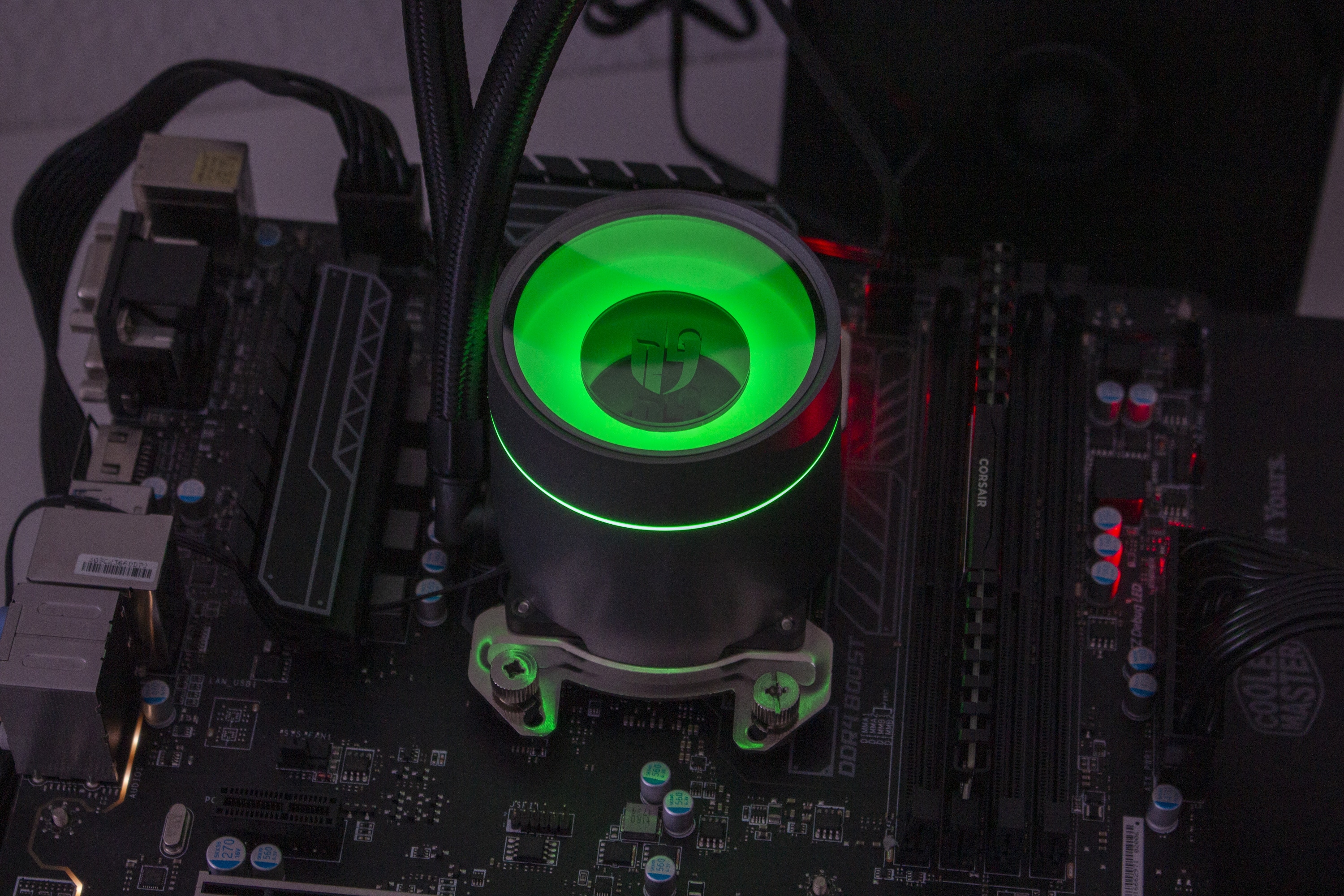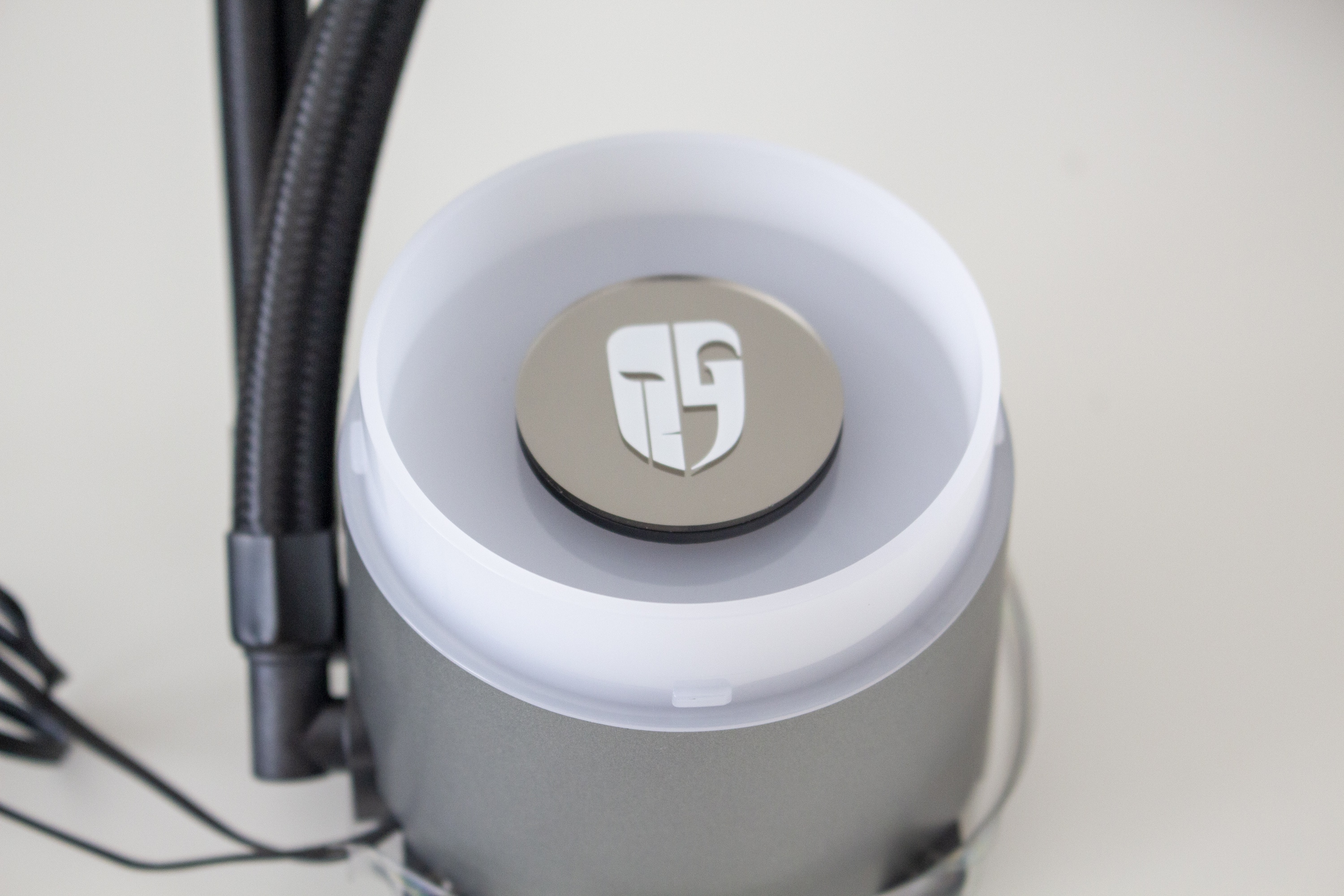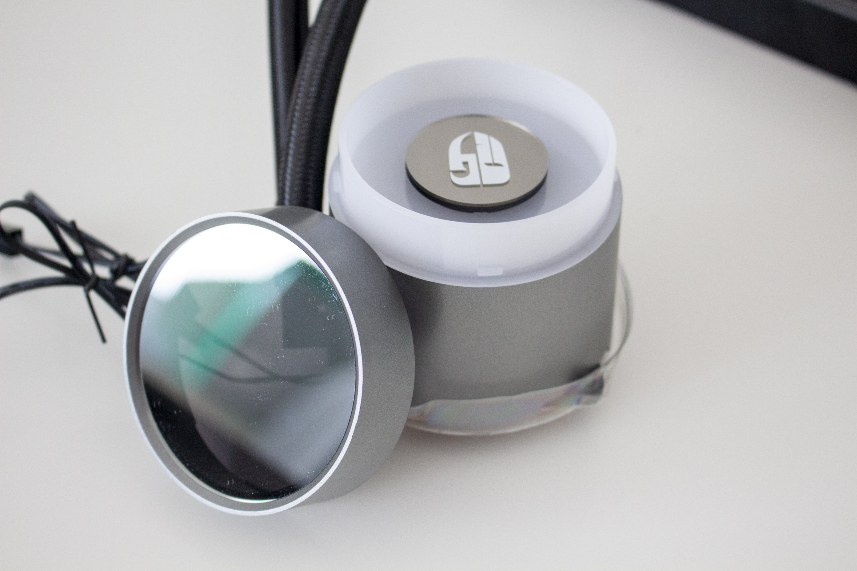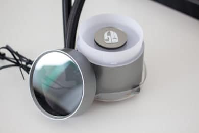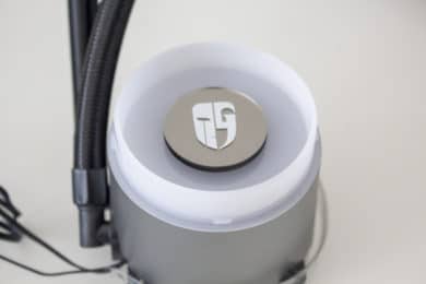 Da Radiator und Lüfter sehr schlicht gestaltet sind, muss der Pumpenblock etwas Farbe ins Spiel bringen. Erreicht wird das durch eine indirekte RGB-Beleuchtung der milchigen Kunststoffplatte unterhalb des Fensters im Deckel. In die Platte wurde, über zwei Nasen und einen Magneten, ein kleiner Spiegel mit dem Deepcool-Logo eingesetzt. Dieser Spiegel kann, je nach Position der Pumpeneinheit, gedreht oder durch den mitgelieferten Spiegel ohne Logo ersetzt werden.