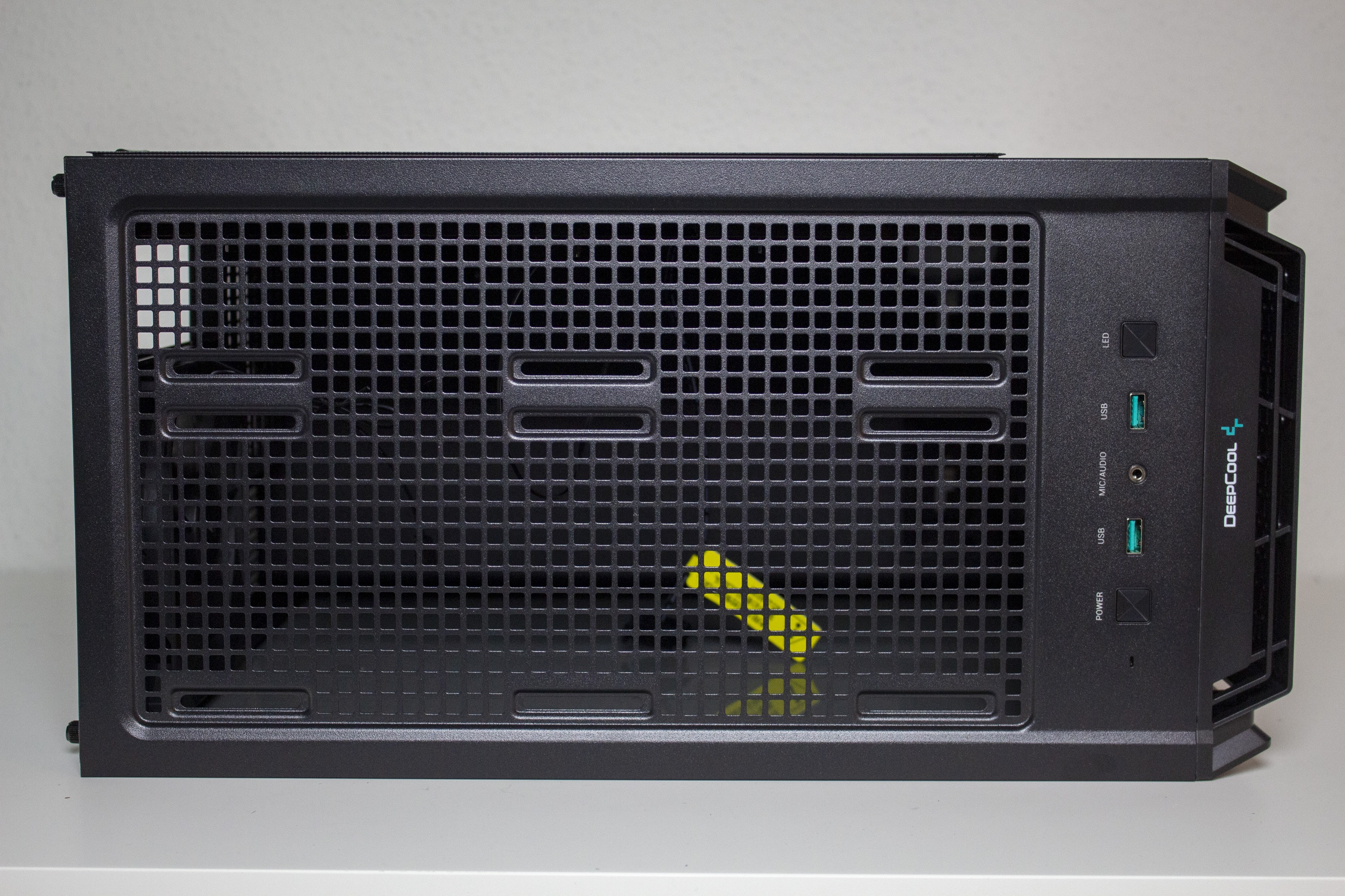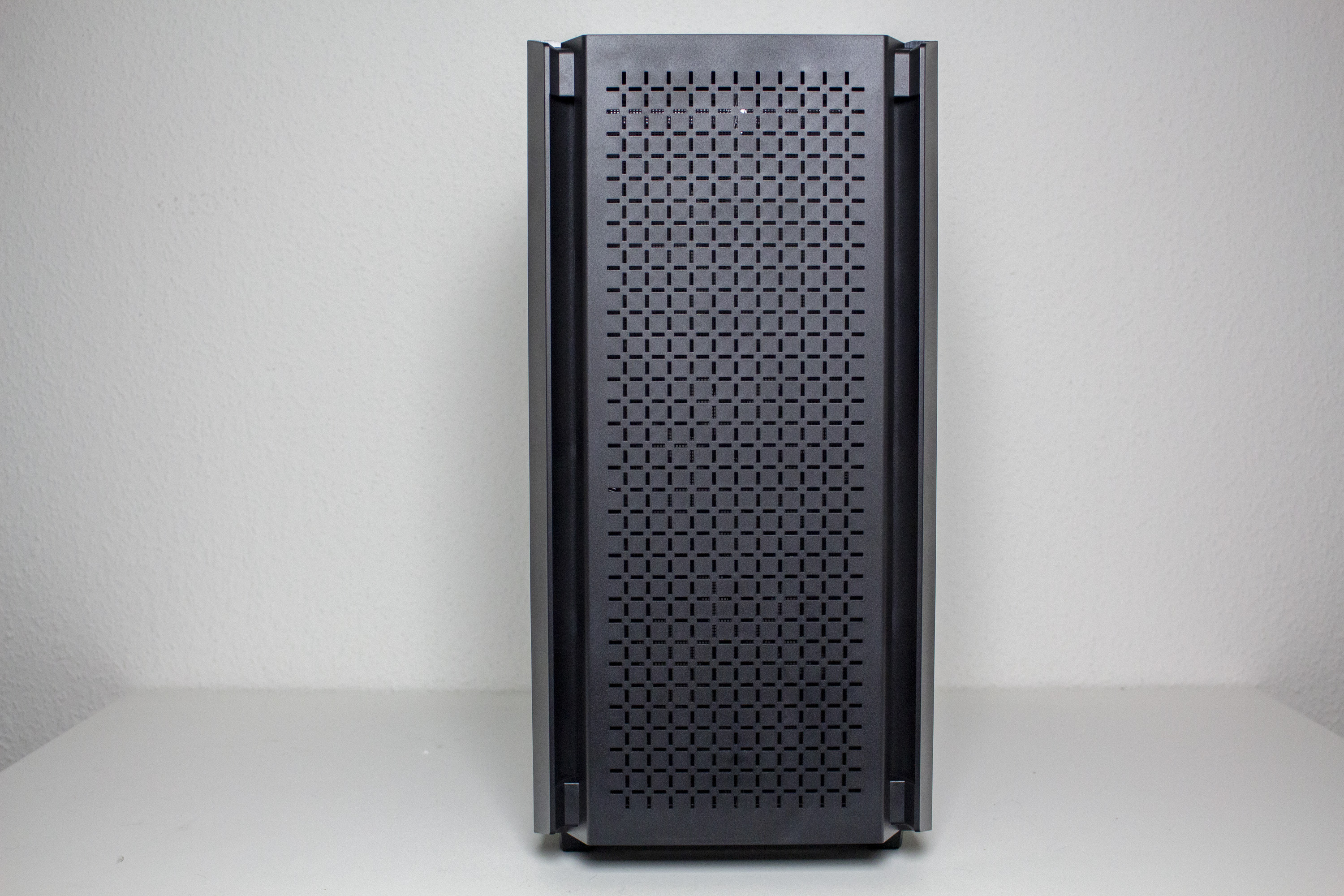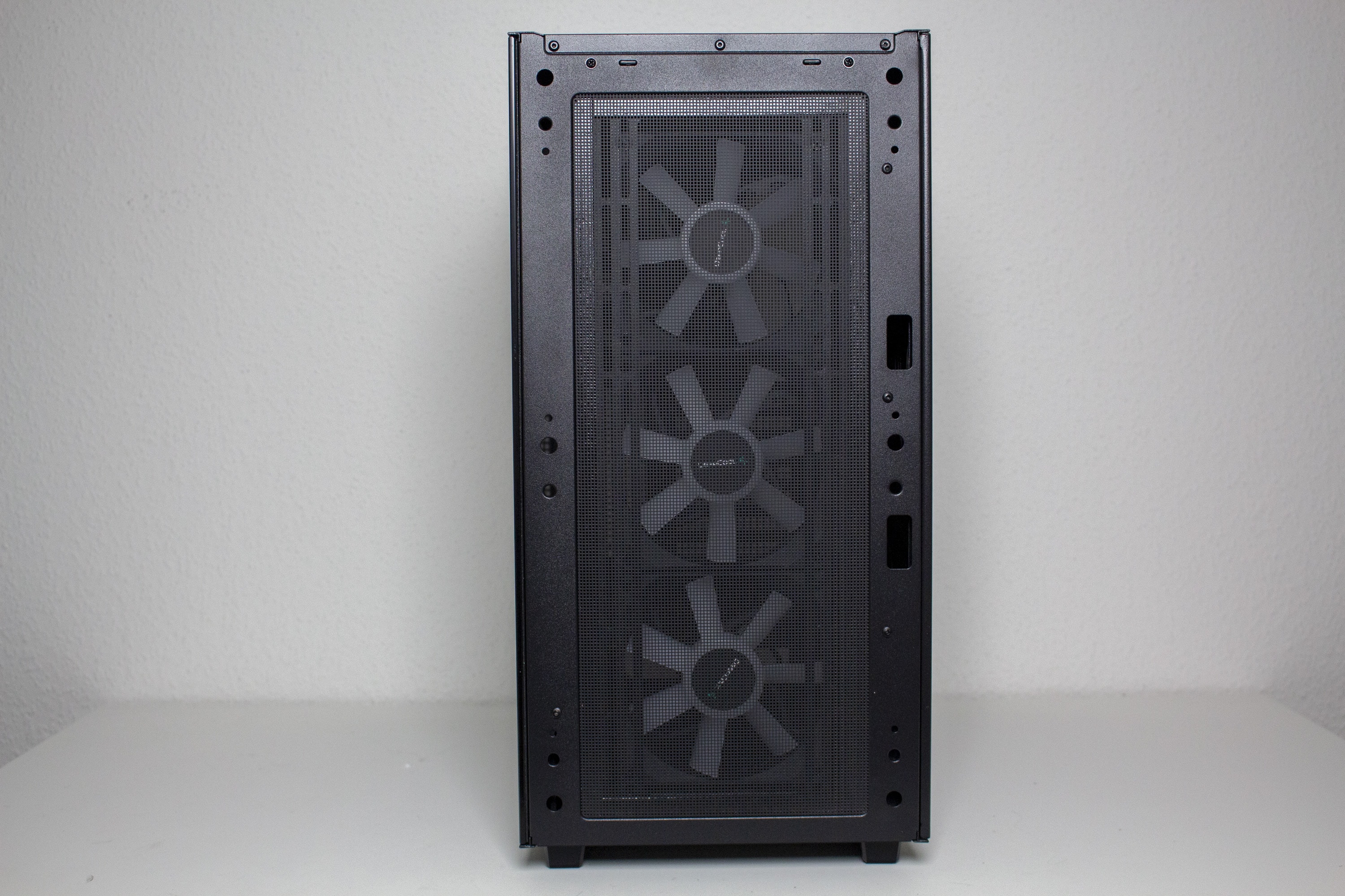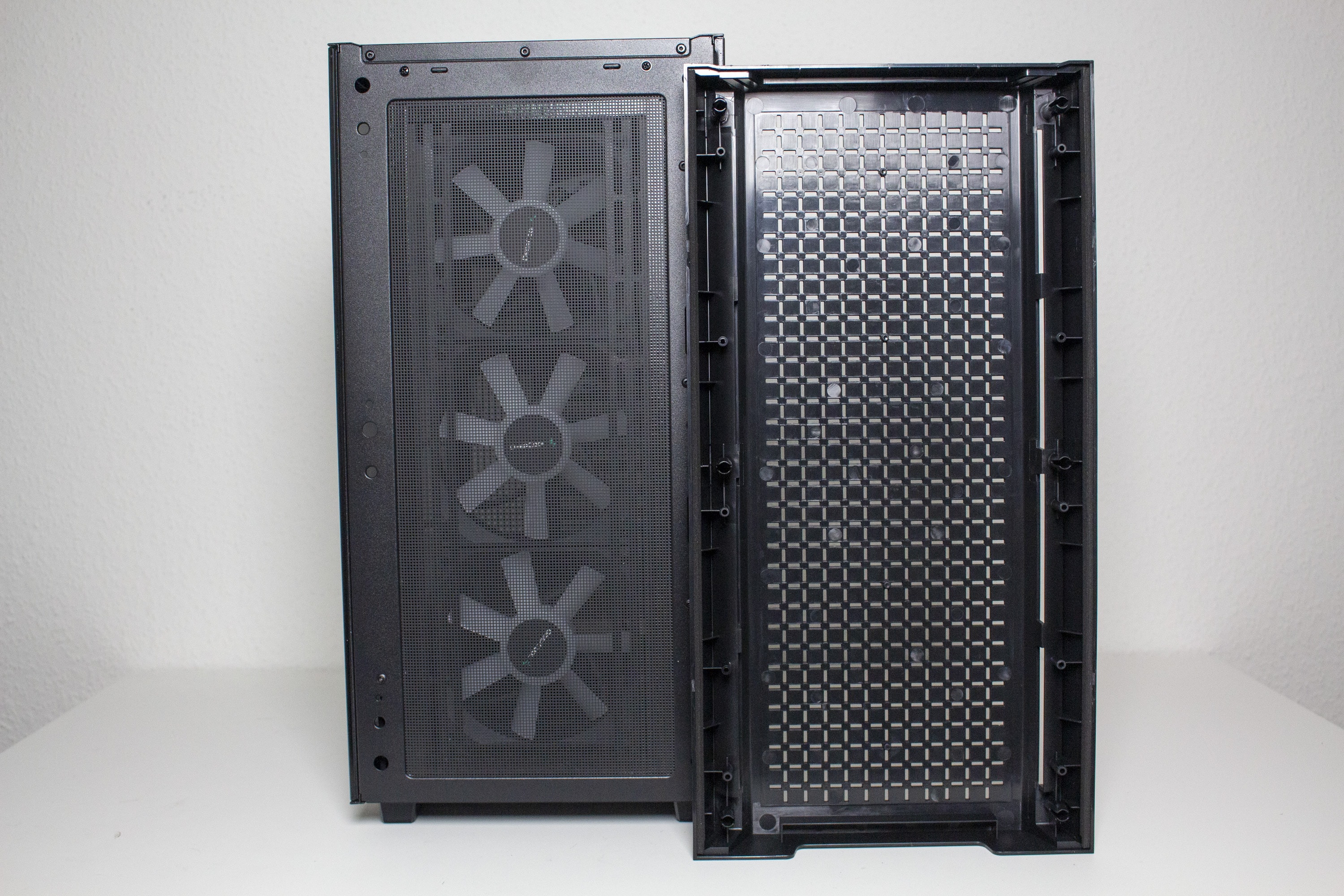 DeepCool gestaltet das CG560 optisch überwiegend unauffällig. Etwas anders ist das jedoch bei der Front. Das Frontpanel besteht vollständig aus schwarzen Kunststoff und wurde mit einem Mesh-Gitter in Fadenkreuz-Optik versehen. Dessen Materialqualität lässt dabei leider etwas zu wünschen übrig. Die Materialstärke ist sehr gering und die Frontblende lässt sich leicht verbiegen. Zusätzlich verfügt das Panel beidseitig über große Luftschlitze. Um den Innenraum vor Staub zu schützen, wurde am Korpus eine magnetische Staubfiltermatte aus Mesh angebracht. Dahinter hat DeepCool insgesamt drei ARGB-Lüfter mit einer Rahmenbreite von 120 Millimetern platziert.