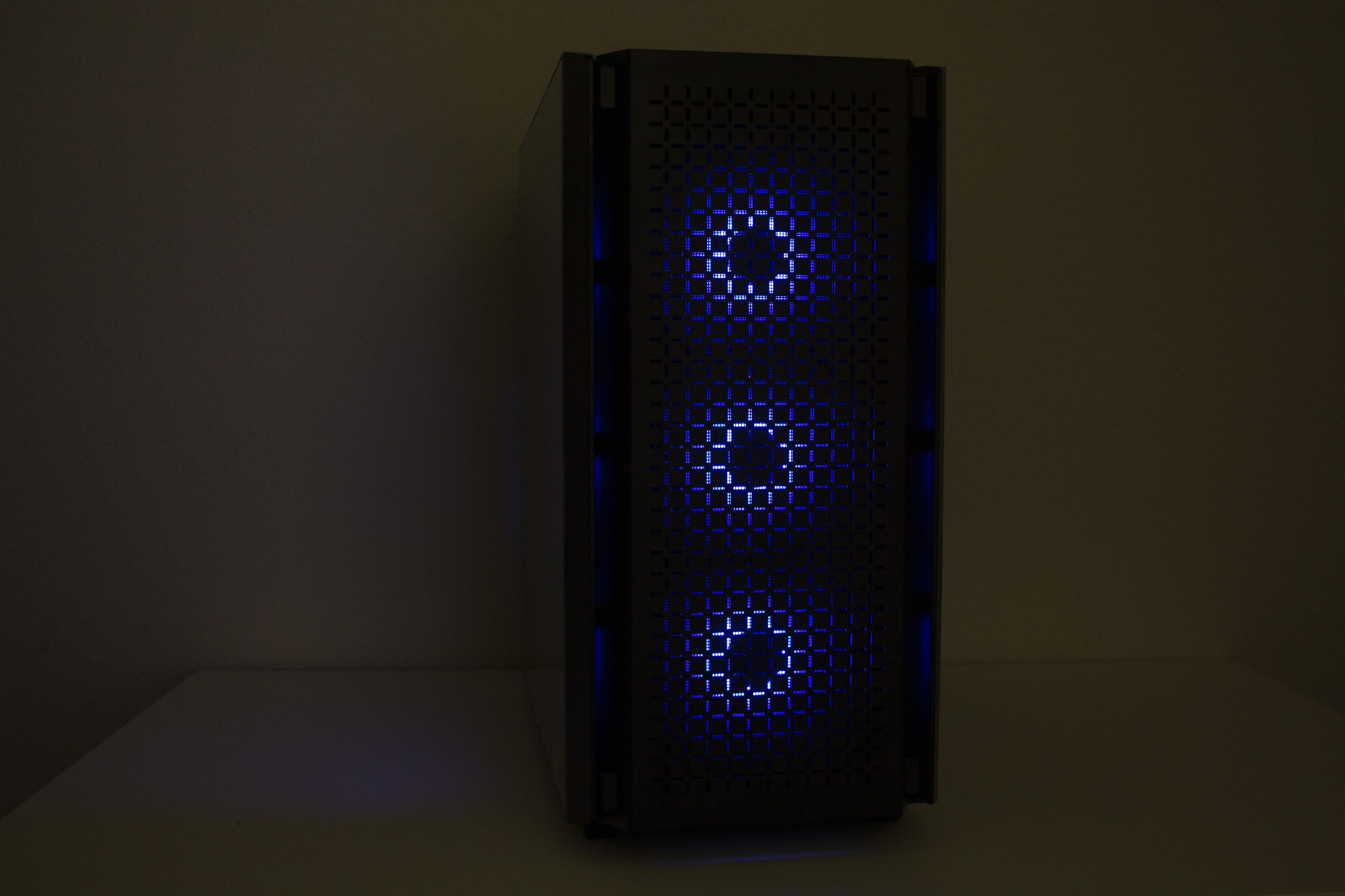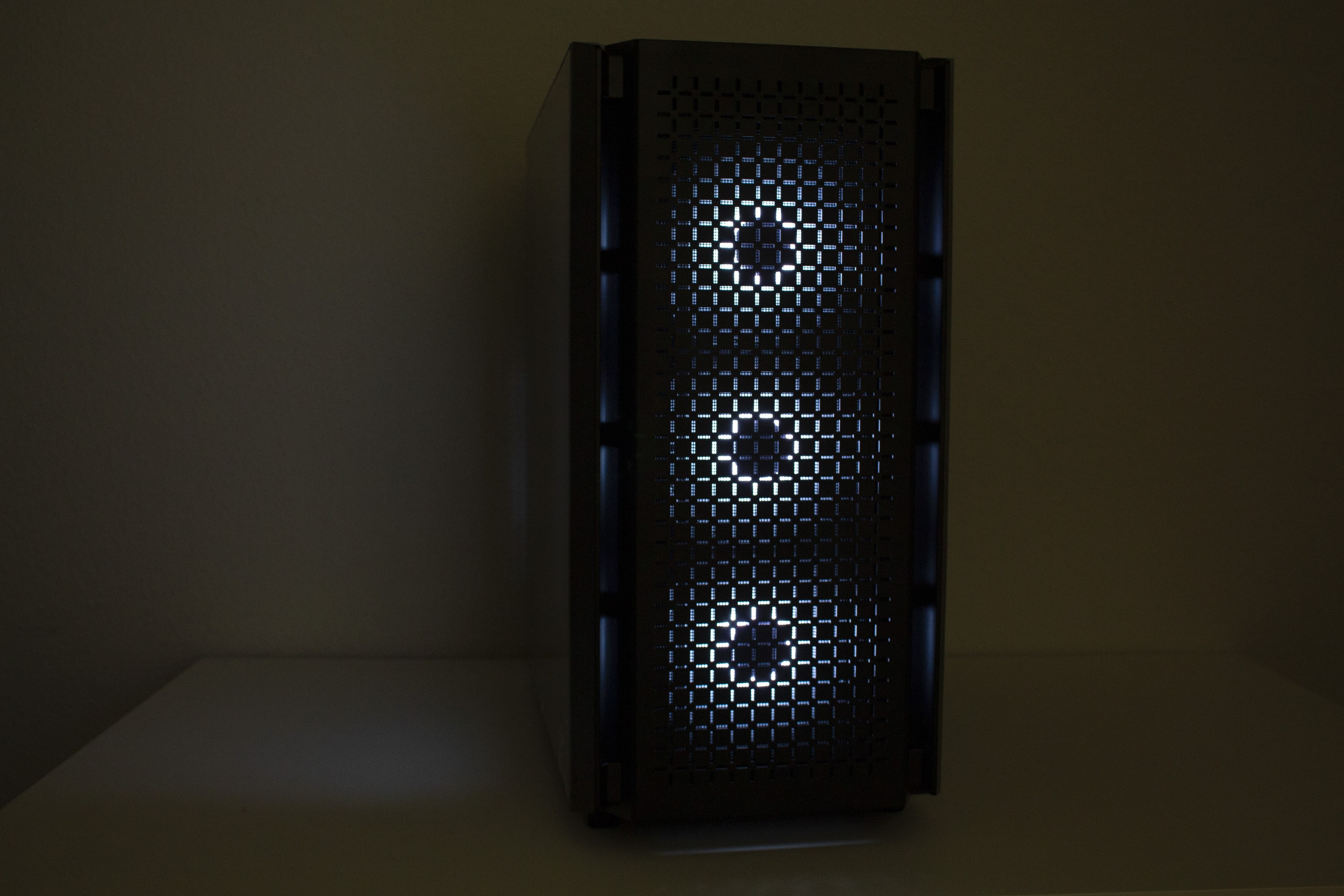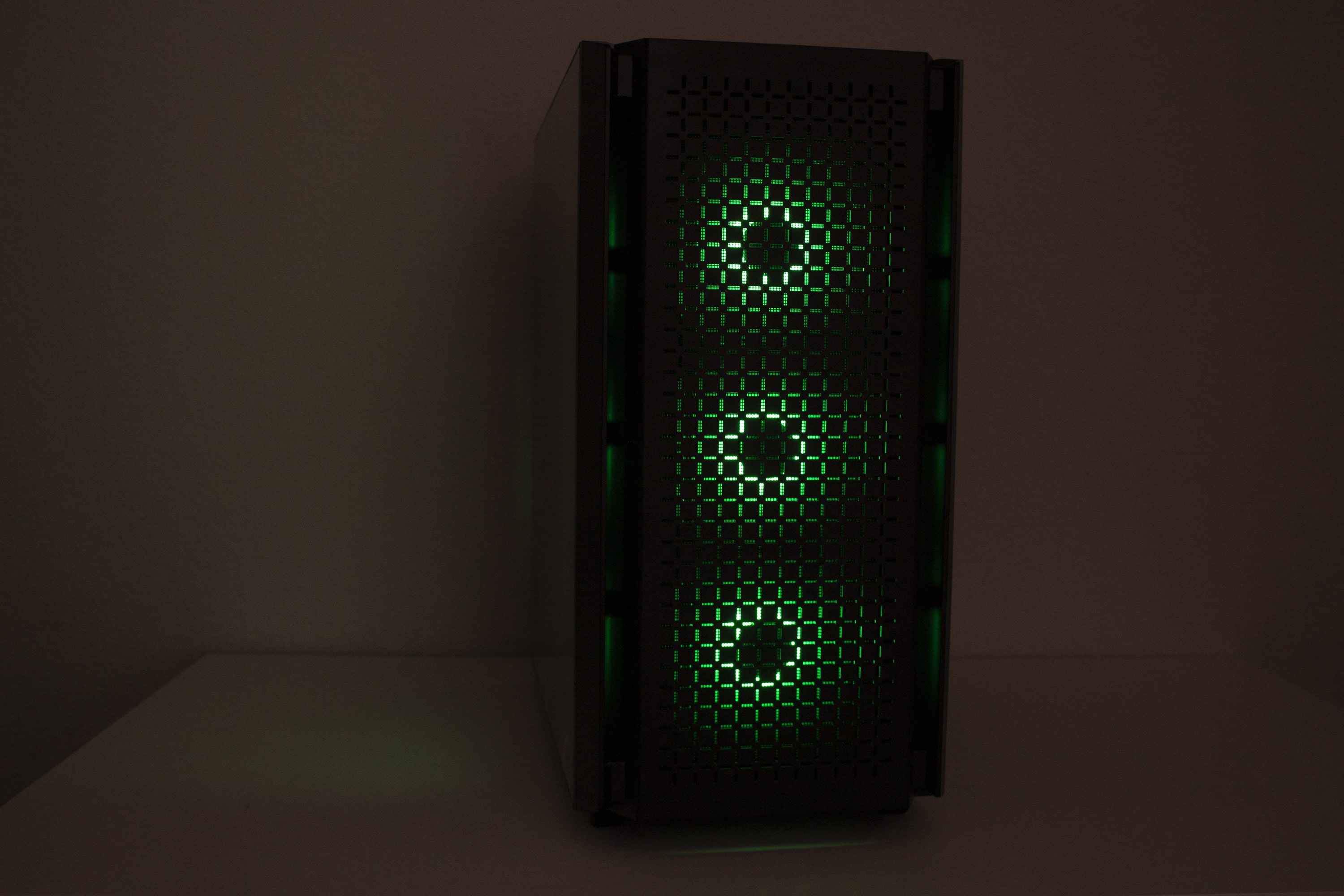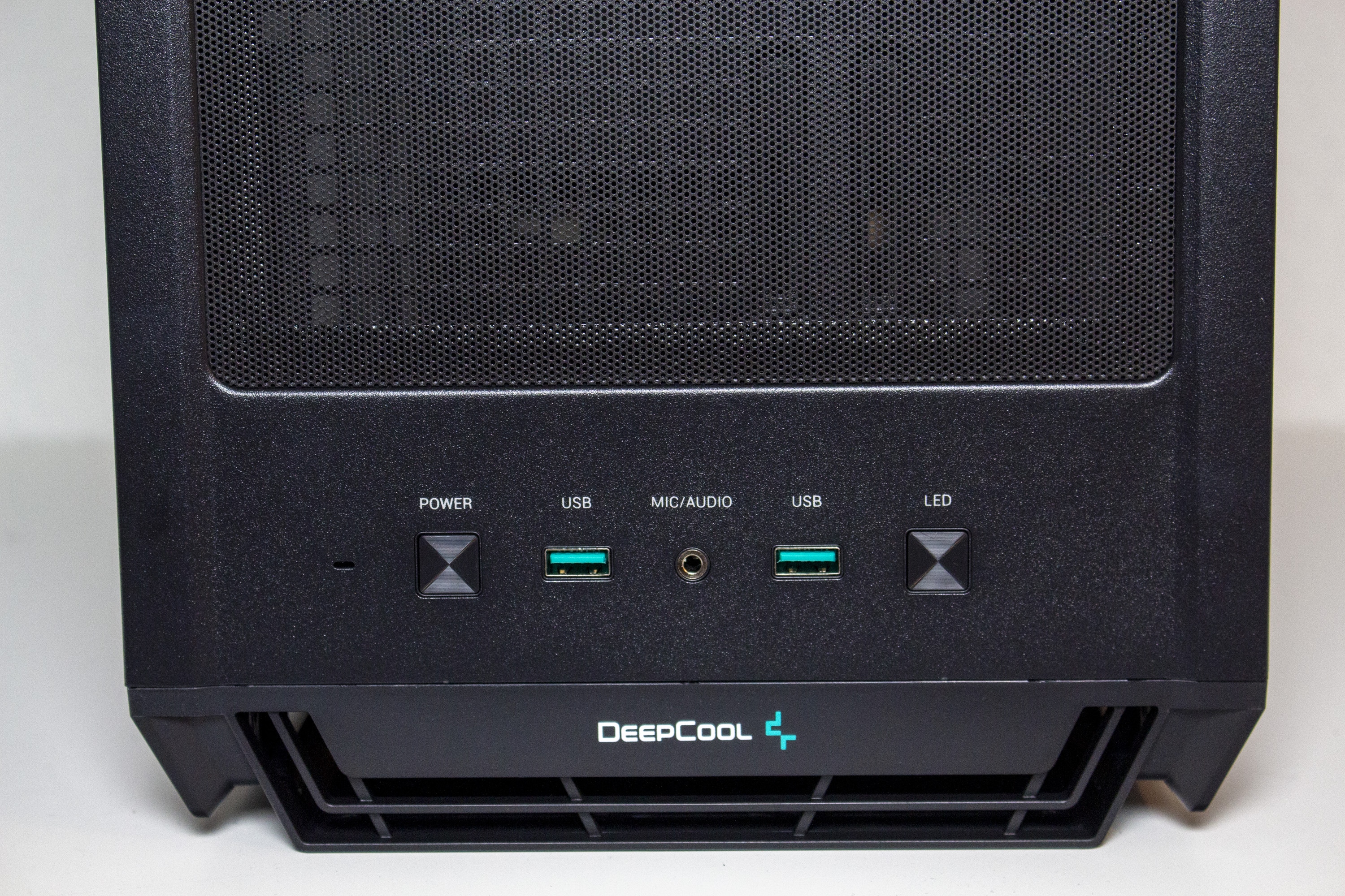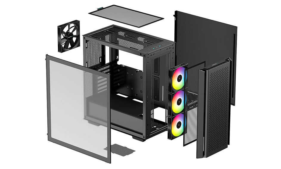 DeepCool gestaltet das CG560 optisch überwiegend unauffällig. Etwas anders ist das jedoch bei der Front. Das Frontpanel besteht vollständig aus schwarzen Kunststoff und wurde mit einem Mesh-Gitter in Fadenkreuz-Optik versehen. Dessen Materialqualität lässt dabei leider etwas zu wünschen übrig. Die Materialstärke ist sehr gering und die Frontblende lässt sich leicht verbiegen. Zusätzlich verfügt das Panel beidseitig über große Luftschlitze. Um den Innenraum vor Staub zu schützen, wurde am Korpus eine magnetische Staubfiltermatte aus Mesh angebracht. Dahinter hat DeepCool insgesamt drei ARGB-Lüfter mit einer Rahmenbreite von 120 Millimetern platziert.