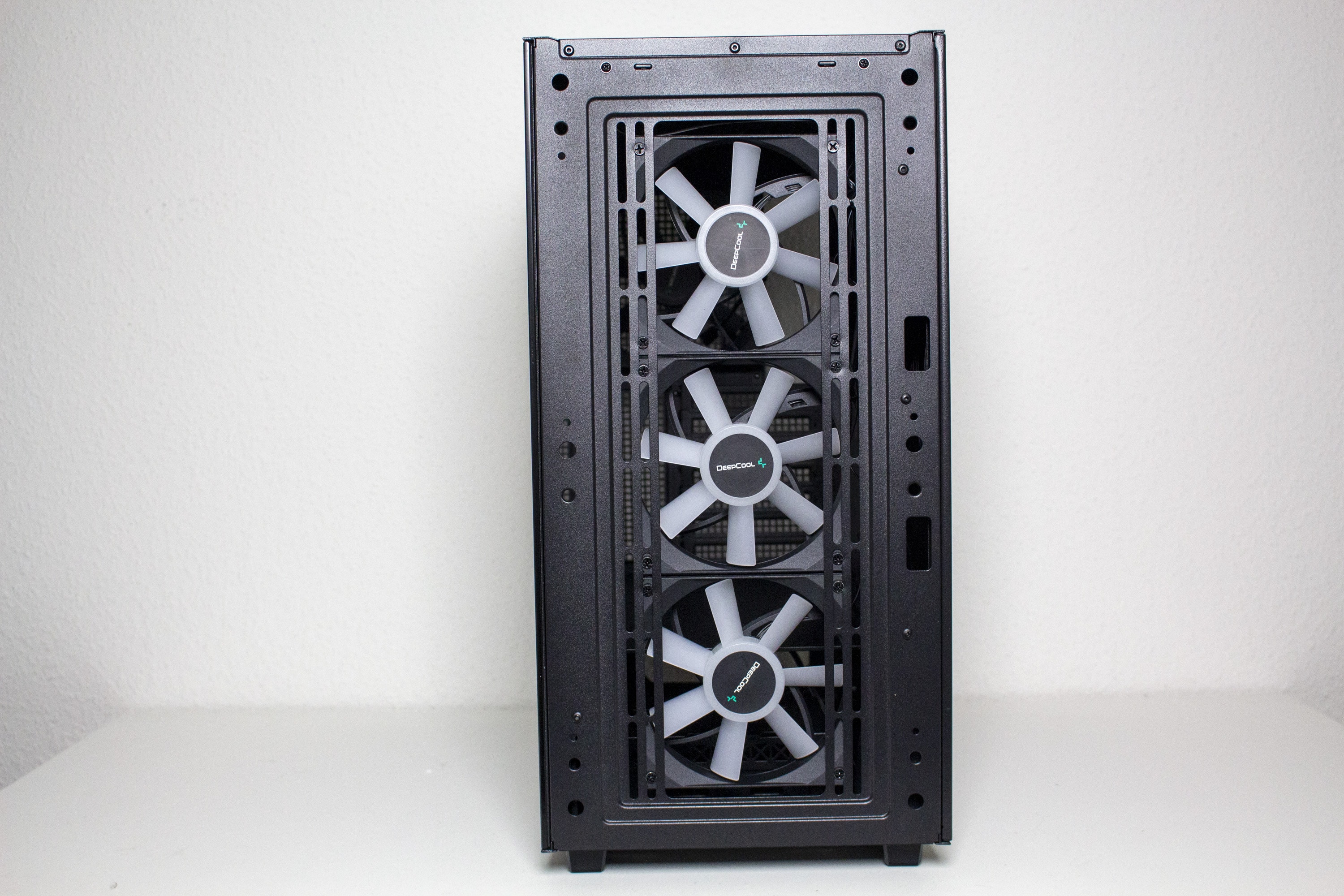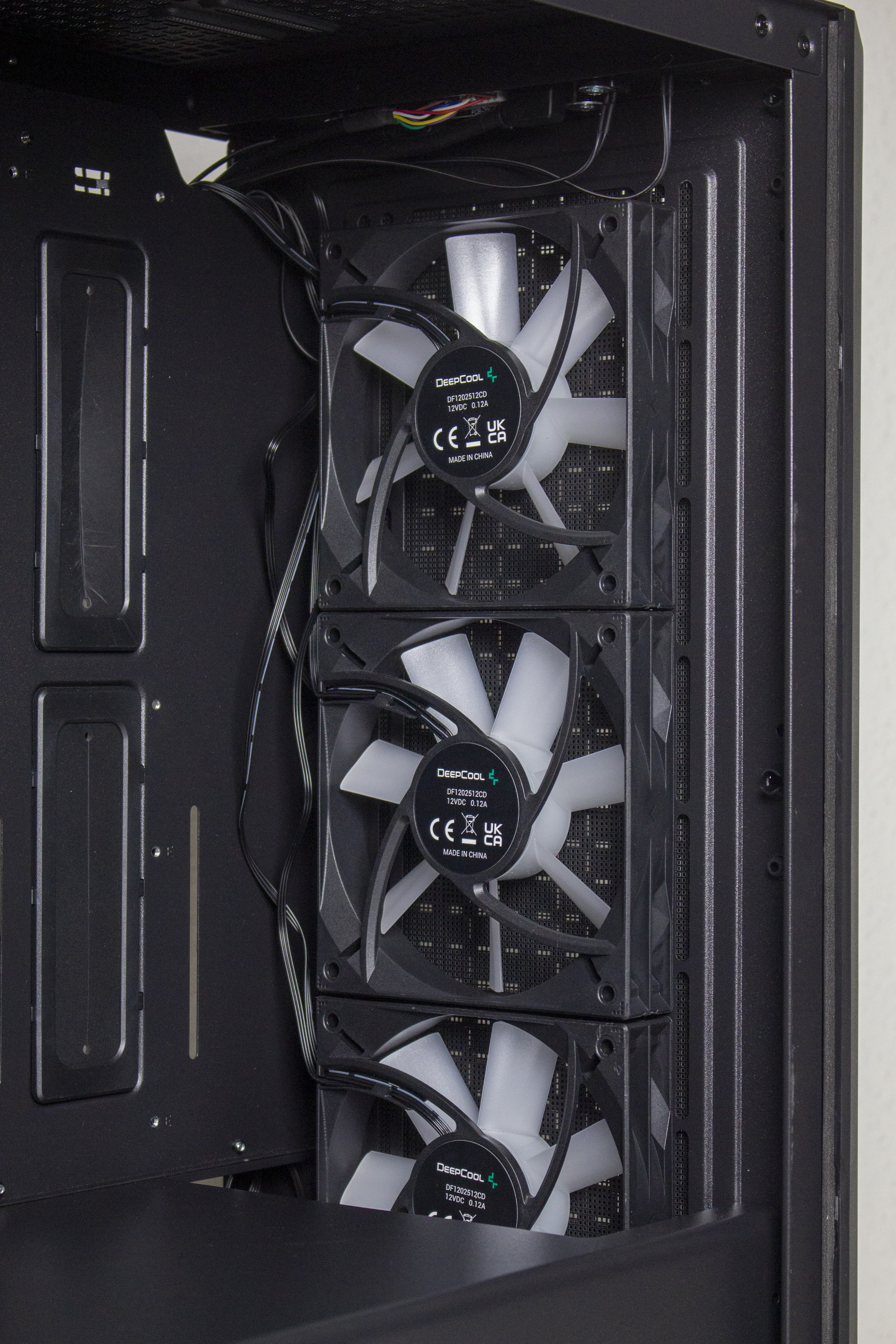 Ab Werk verbaut Deepcool im CG560 vier Lüfter. Die drei Lüfter in der Front bestehen aus einem schwarzen Rahmen mit sieben milchig-weißen Lüfterblättern. Die Stromversorgung erfolgt jeweils über einen 3-Pin-Stecker, die über eine Y-Weiche zu einem einzelnem Stecker verbunden wurden. Die Ansteuerung der LEDs erfolgt über eine Steuerplatine auf der Rückseite. Die Maximaldrehzahl der Lüfter liegt bei circa 1200 Umdrehungen pro Minute. Der Hecklüfter kann eine Rahmenbreite von 140 Millimetern vorweisen und dreht mit maximal 900 Umdrehungen pro Minute. Anders als die Frontlüfter ist dieser aber vollständig schwarz gehalten. Auffällige Lagergeräusche sind während des Betriebs nicht zu vernehmen.