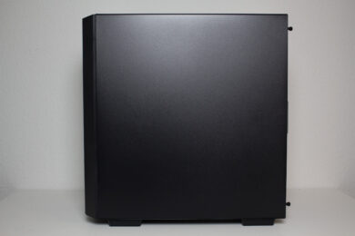 Da DeepCool bei CG560 ARGB-Lüfter verbaut, darf natürlich ein Seitenteil aus Tempered Glass nicht fehlen. Dieses ist auf der linken Gehäuse zu finden und wurde leicht getönt. Ab Werk befinden sich zwei Schutzfolien auf der Scheibe. Für eine leichtere Montage wurde diese zudem auf einen Stahlrahmen geklebt, der an Heck mit zwei Rändelschrauben befestigt wird. Das rechte Seitenteil besteht aus Stahl und kann eine Materialstärke von 0,55 Millimetern vorweisen. Bei der Größe des Panels ist das bereits grenzwertig. Dafür verfügt es aber über Rändelschrauben und eine Ausziehhilfe.