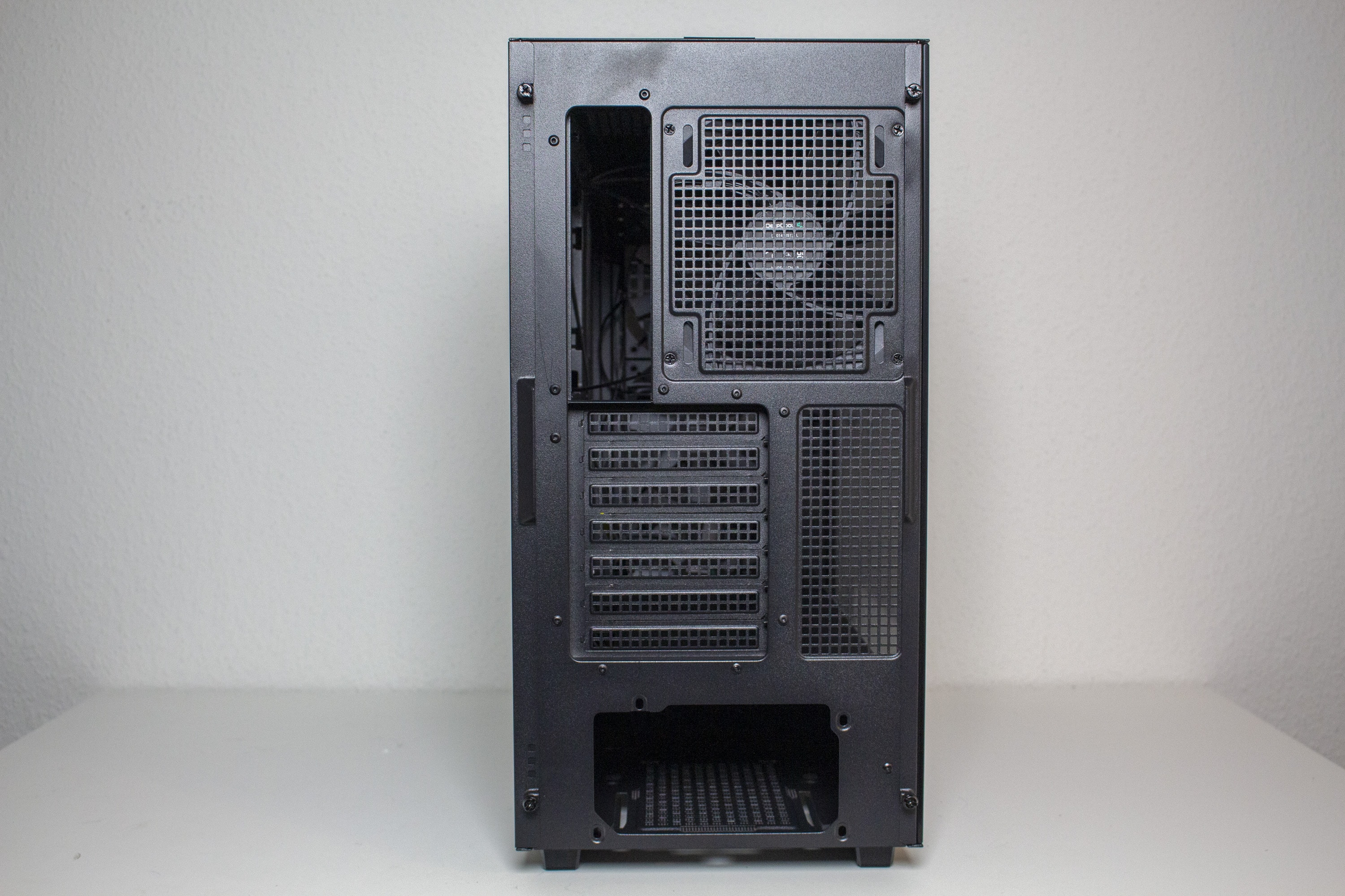 Die Rückseite des CG560 verbirgt nichts außergewöhnliches. Das Netzteil wird am Boden platziert und darüber finden sich sieben Erweiterungsslots mit wiederverwendbaren Blenden. Die Verschraubung der Erweiterungskarten erfolgt, erstaunlicherweise, im Innenraum und nicht außerhalb. Über den Erweiterungsslots sind ein vierter Gehäuselüfter im 140er-Format und der Ausschnitt für die I/O-Blende des Mainboards zu finden.