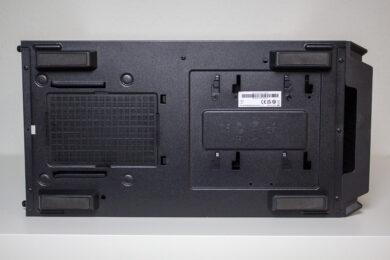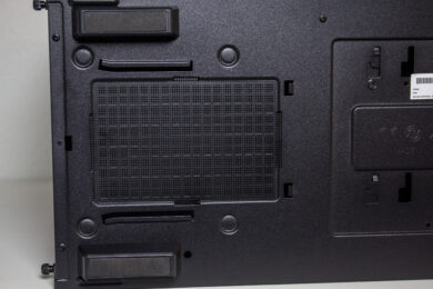 An der Unterseite lässt sich eine weitere kleine Einsparmaßnahme entdecken. Denn obwohl sich hier eine Vorbereitung für die Montage eines Staubfilters mit Rahmen vorhanden ist, verbaut der Hersteller leider nur eine einfach Matte aus Mesh. Einen sicheren Stand erhält der Tower durch vier Standfüße aus Kunststoff, die zusätzlich mit einer Schicht Gummi beklebt wurden. Ein weiteres auffälliges Merkmal sind zwei Schrauben in der Nähe des HDD-Käfigs, die auf eine Modularität hindeuten.