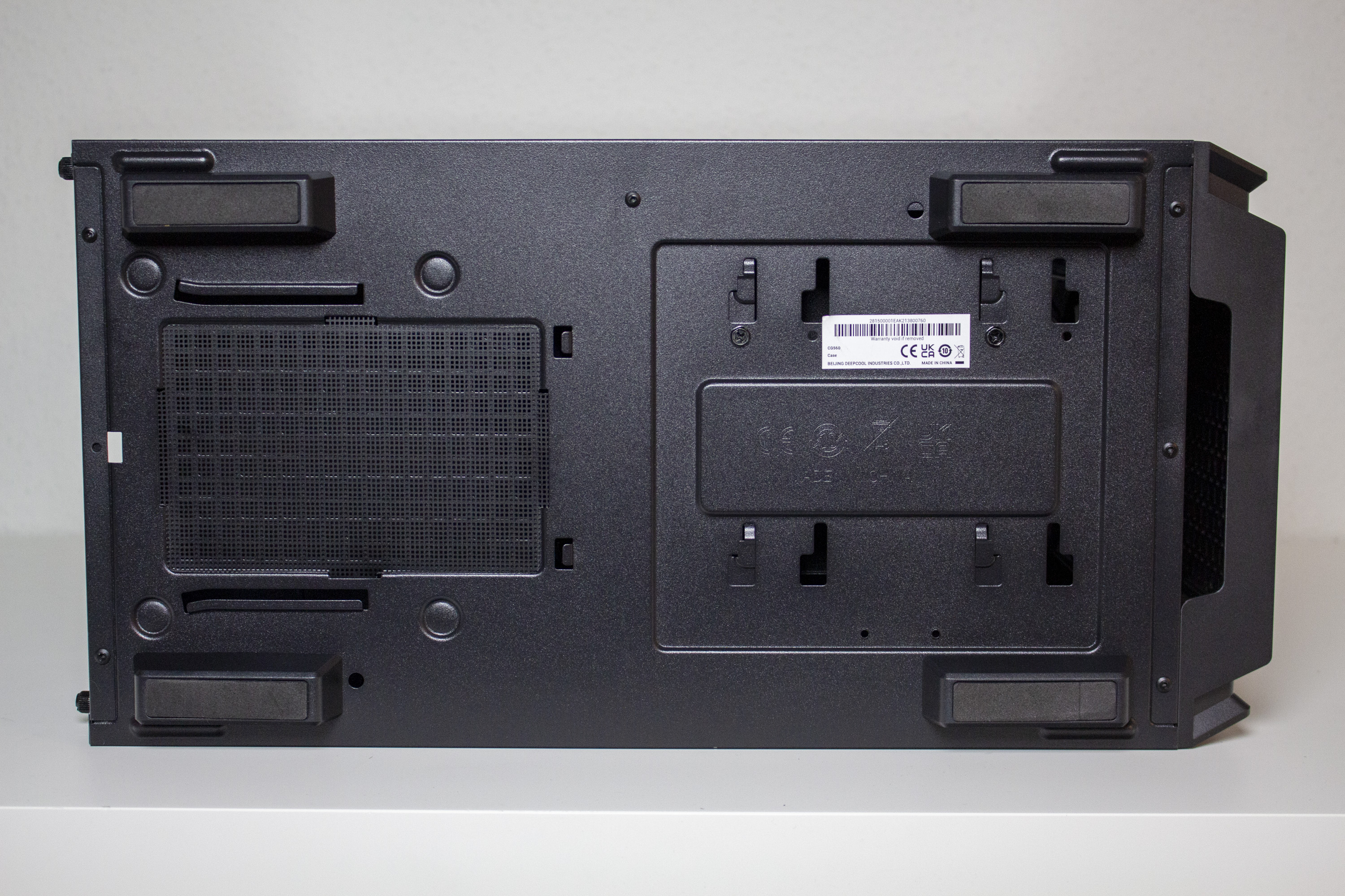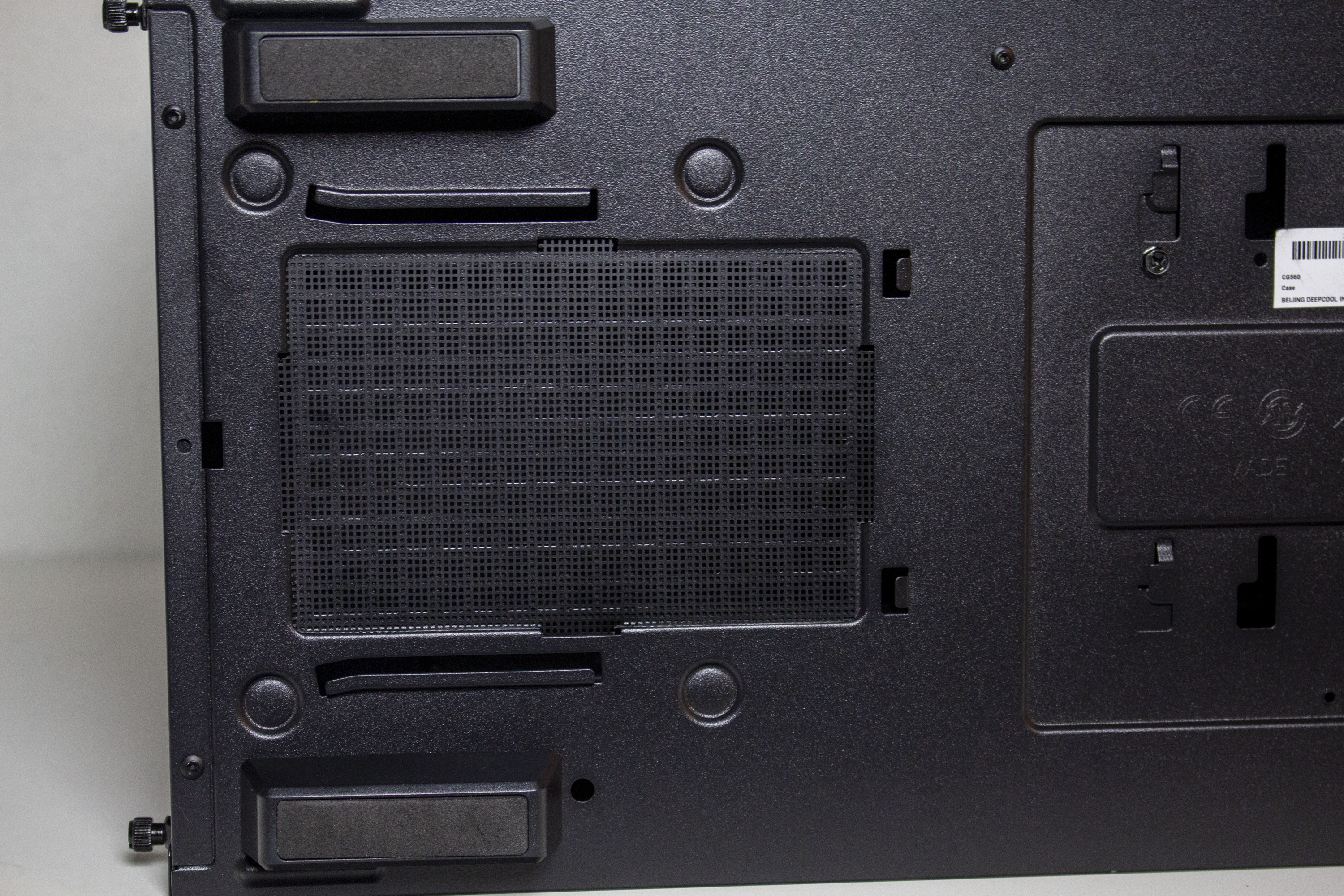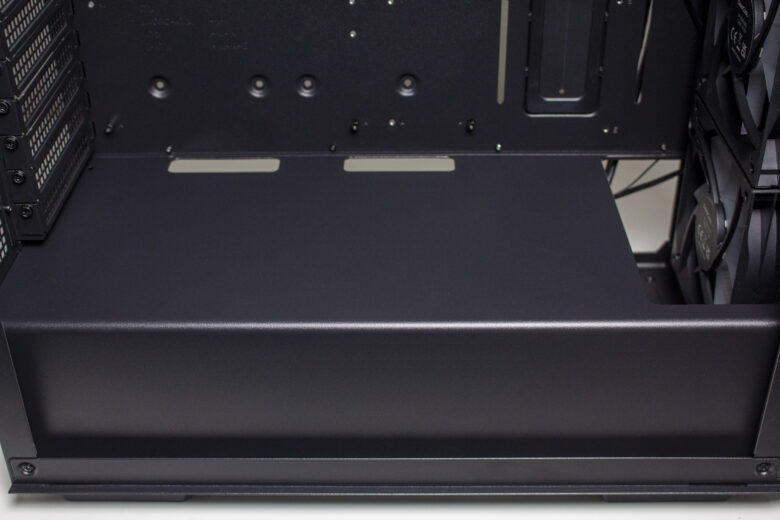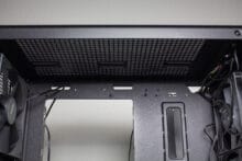 Wie so oft, kommt auch beim CG560 eine Netzteilabdeckung zum Einsatz. Diese verdeckt das Netzteil, dessen Kabel und den HDD-Käfig. Zur Erleichterung der Verkabelung verfügt die Abdeckung außerdem noch über zwei Kabelmanagement-Öffnungen und, im vorderen Bereich, über einen großen Ausschnitt der die Kompatibilität zu Radiatoren erhöhen soll.