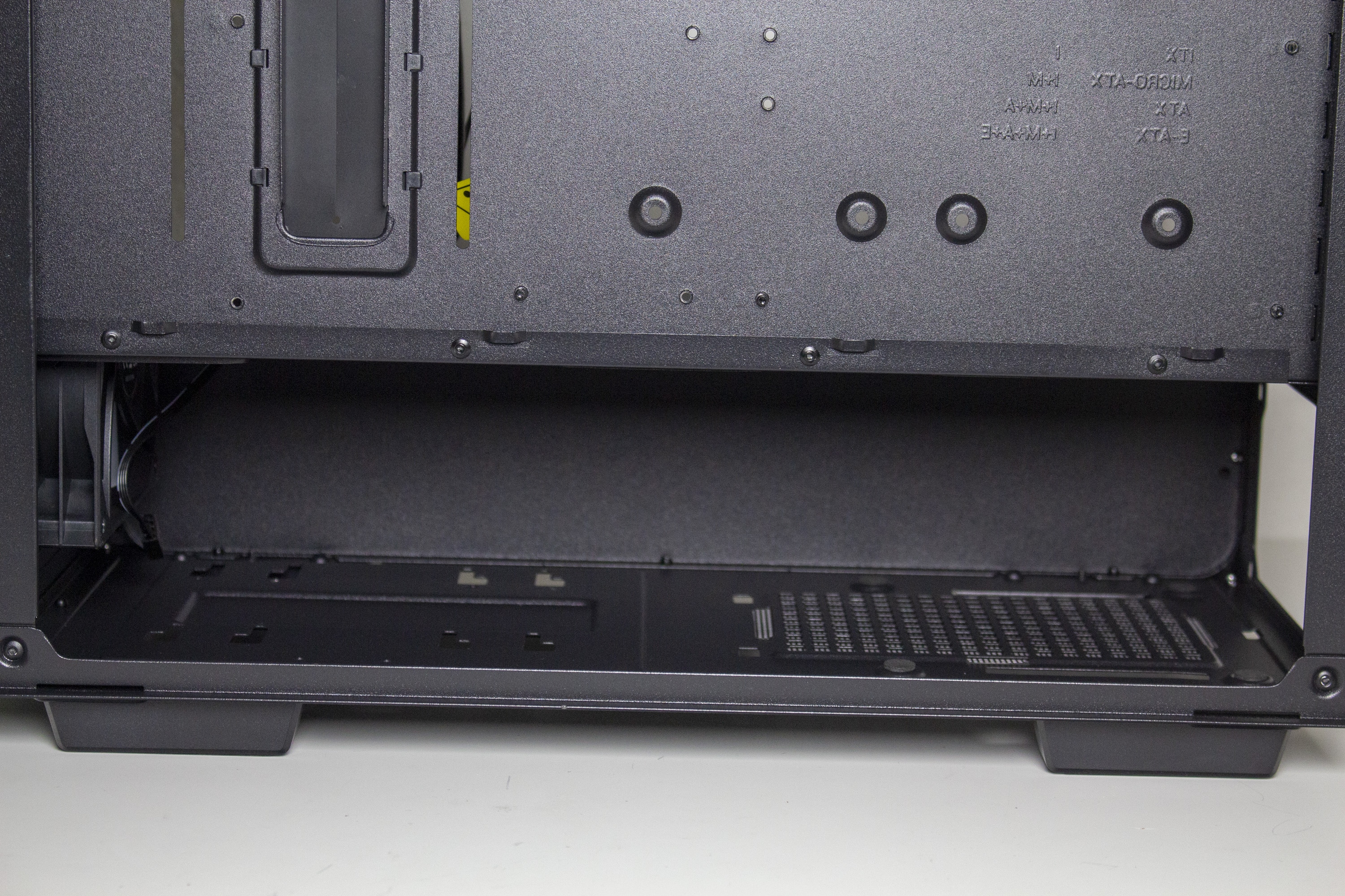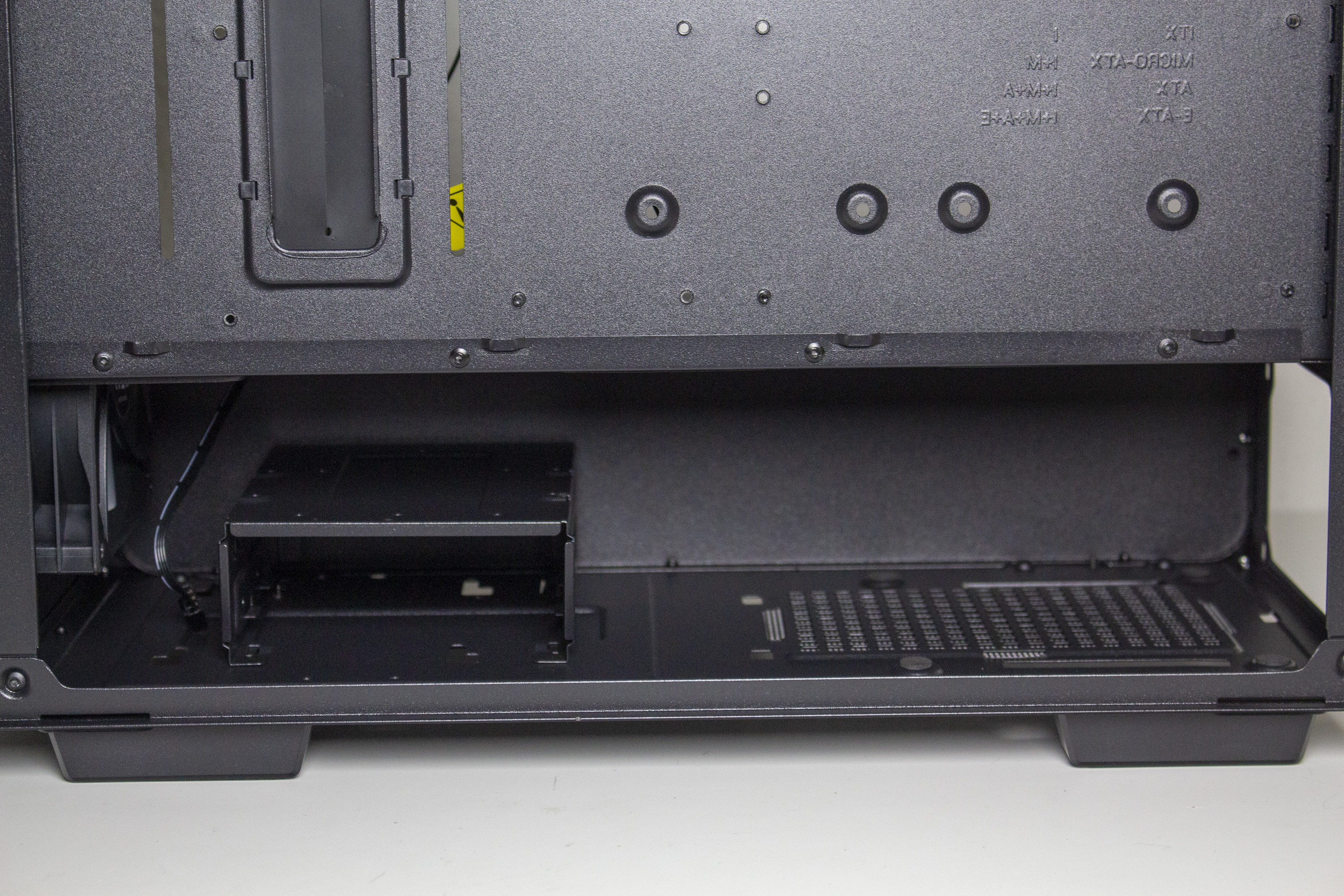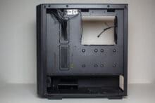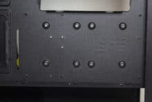 Unterhalb der Netzteilabdeckung verstecken sich offensichtlich das Netzteil und ein modularer HDD-Käfig. Der Montageplatz des Netzteils verfügt zur Minimierung von Vibrationen über dünne Gummistreifen. Ansonsten gibt es auf der Rückseite des Mainboard-Trays vor allem Platz für Kabel. Um die Anschlüsse des Netzteils noch besser verlegen zu können, hat der Hersteller an zahlreichen Stellen Halteösen für Kabelbinder in die Rückwand stanzen lassen.