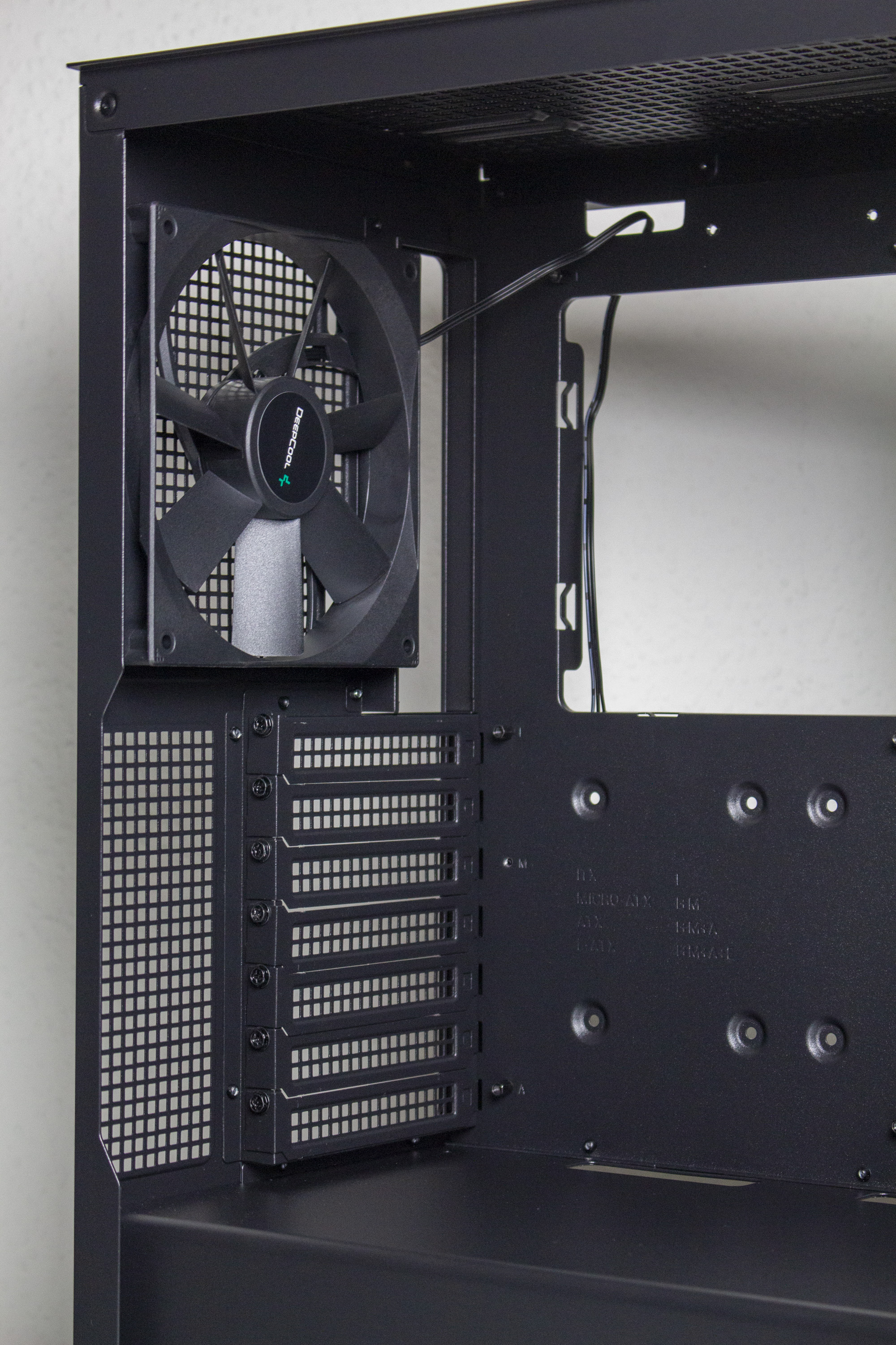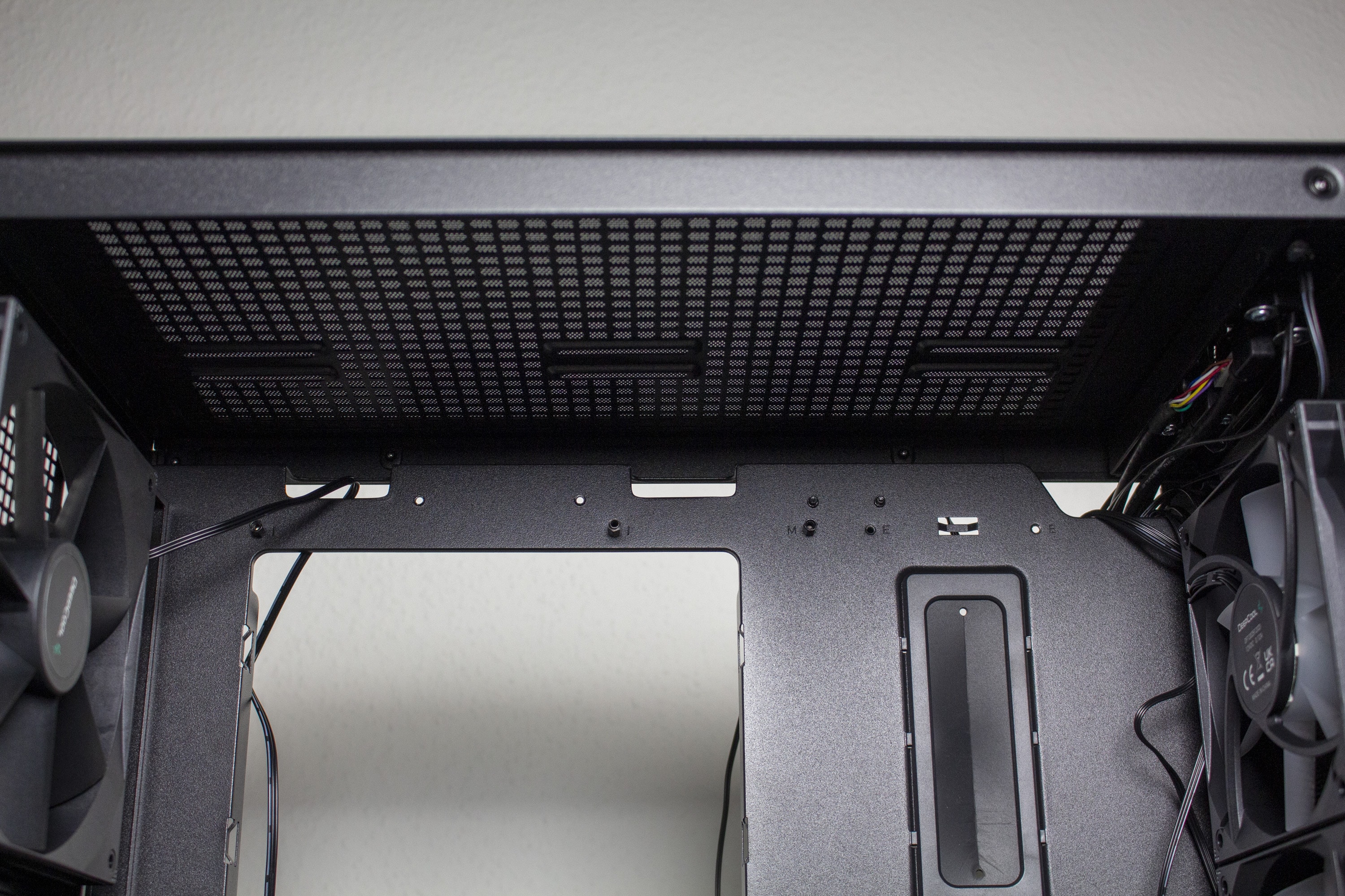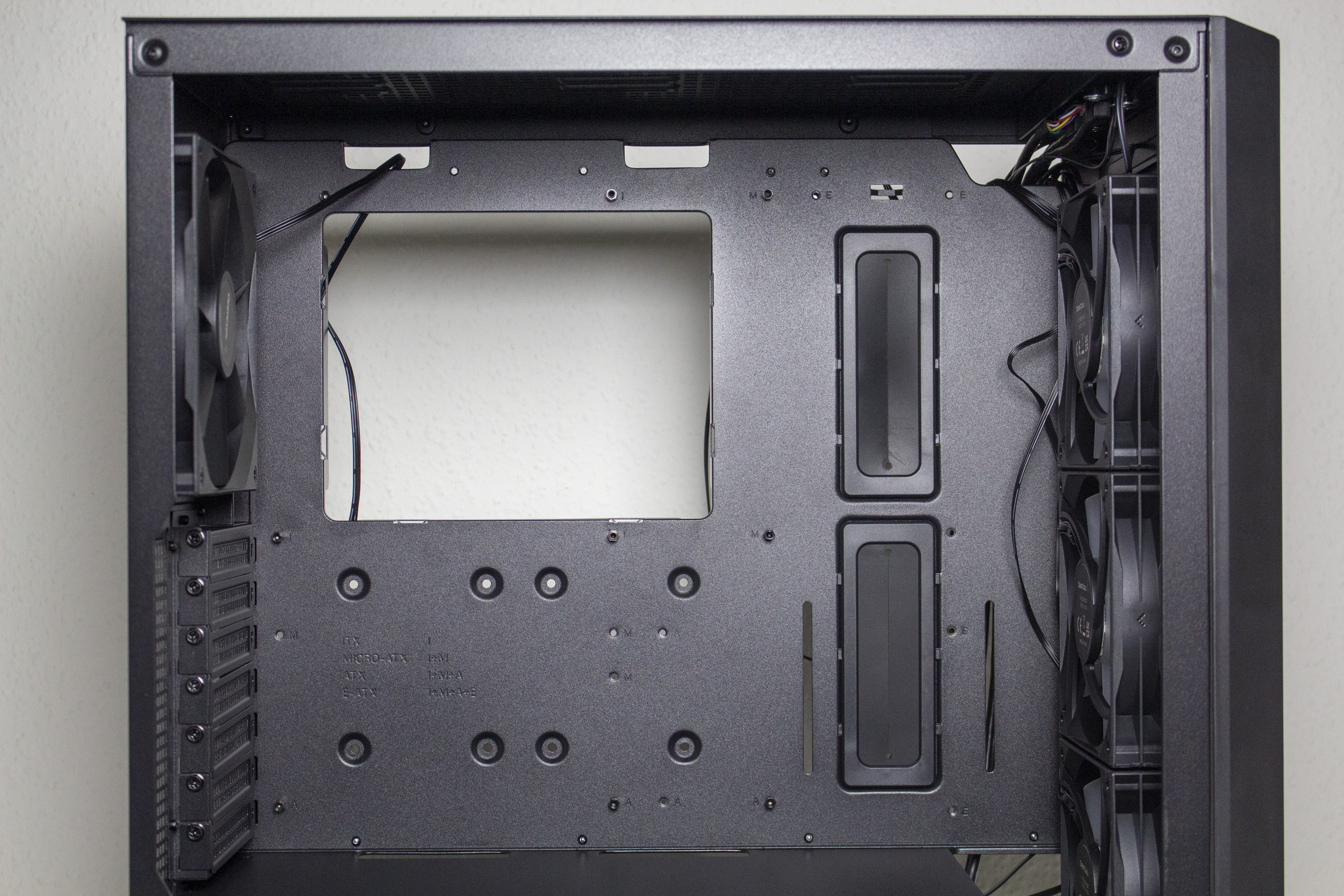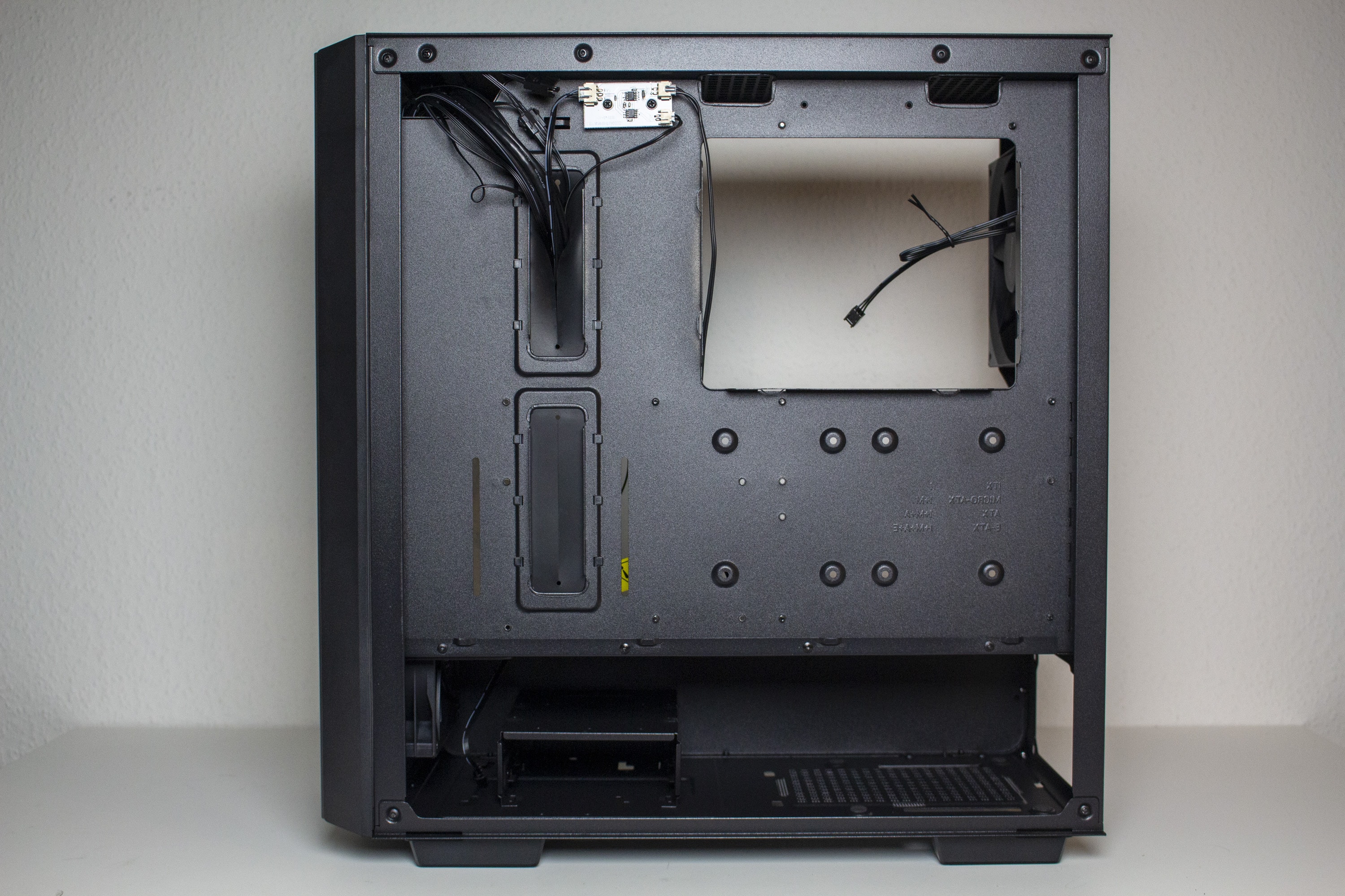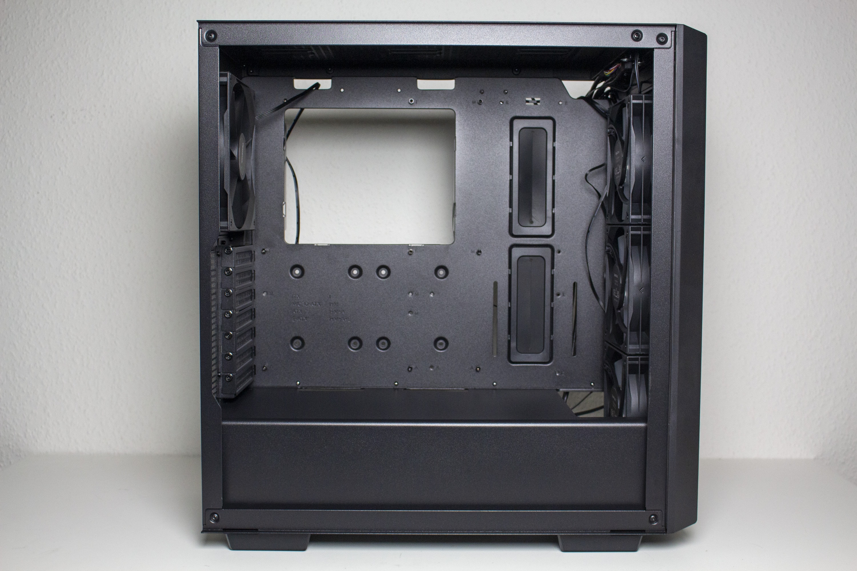 Im Innenraum kommt ein Layout zum Einsatz, dass mittlerweile jedem bekannt sein dürfte. So unterteilt sich das Innere in zwei Kammern. Die obere Kammer ist sehr groß und zeichnet sich durch ein planes Mainboard-Tray aus. Zur Optimierung der Verkabelung hat DeepCool das Tray mit zwei großen und drei kleinen Kabelmanagement-Öffnungen ausgestattet. Die zwei großen Löcher verfügen zusätzlich über Gummierungen. Durch die offene Gestaltung des Innenraums können die vorinstallierten Frontlüfter problemlos Frischluft in den Innenraum befördern.
