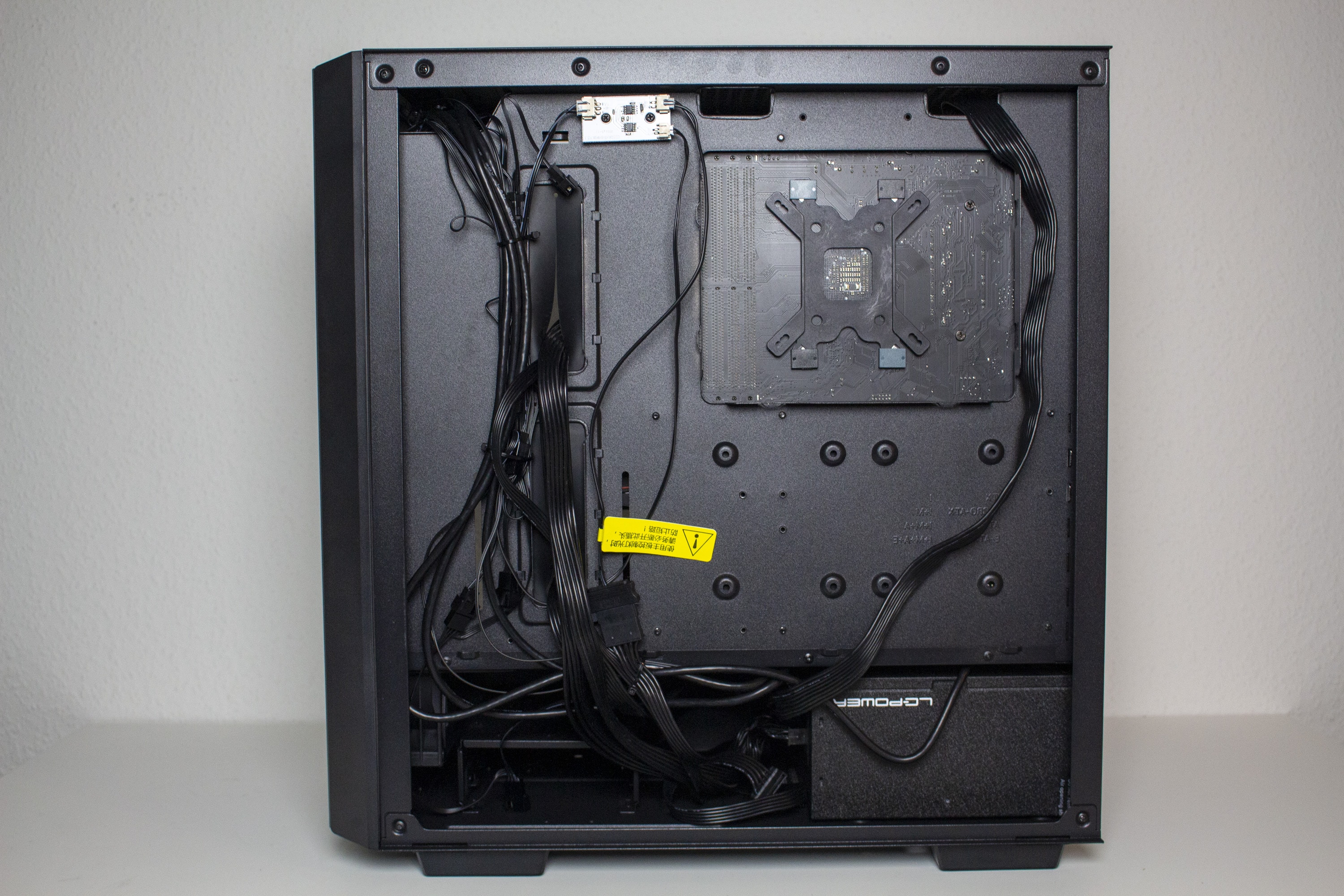 Aufgrund des durchdachten Layout und die großzügigen Platzverhältnisse war der Einbau aller Komponenten sehr einfach und schnell erledigt. Das plane Mainboard-Tray erlaubt besonders breite Hauptplatinen und verfügt über gut positionierte Kabelmanagement-Öffnungen, die teilweise sogar gummiert wurden. Zusammen mit dem sehr guten Raumangebot auf der Rückseite des Mainboard-Trays kann ein sehr ordentliches System geschaffen werden. Beachten sollte man jedoch, dass eine E-ATX-Platine die großen Kabeldurchführungen vollständig verdecken dürfte.