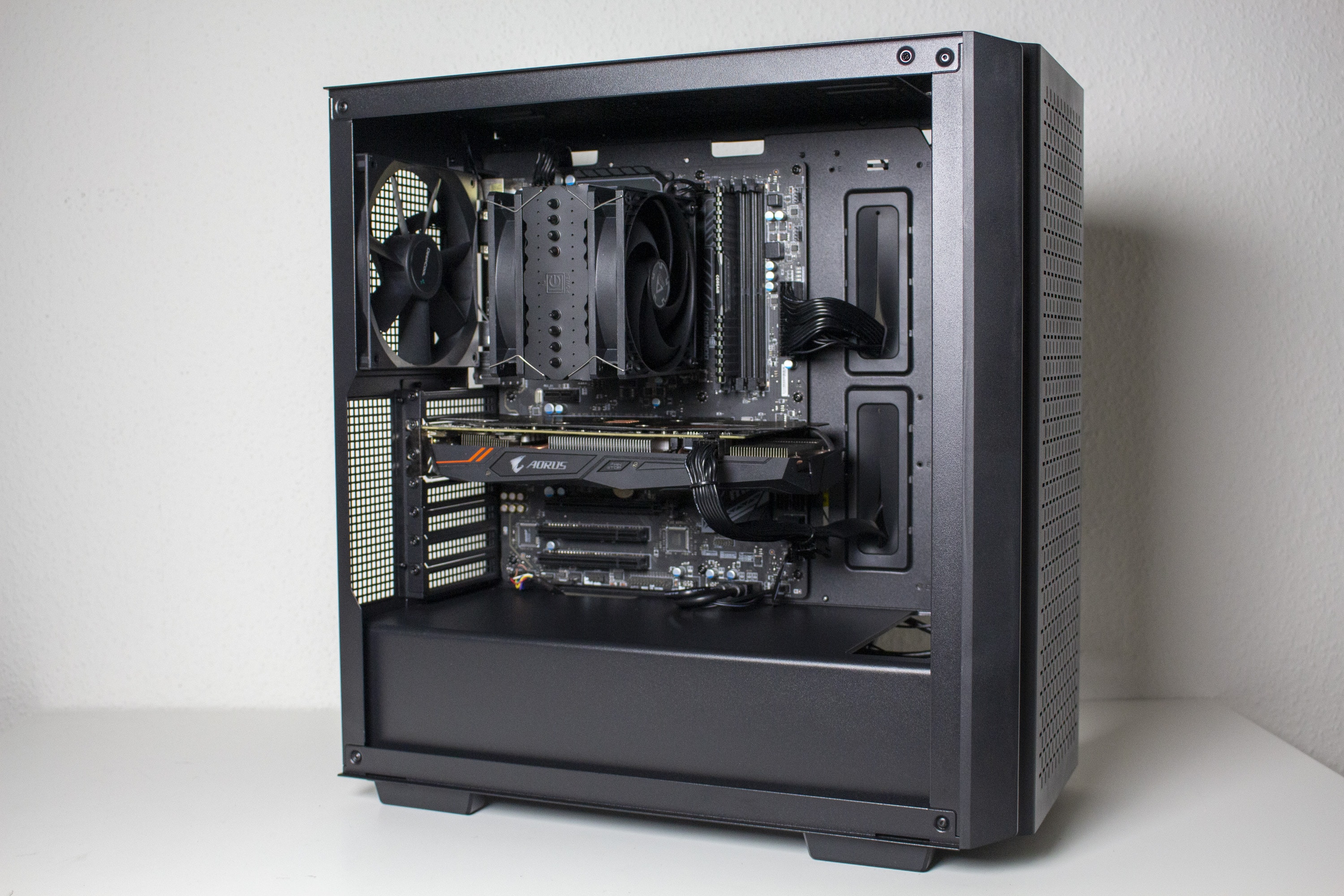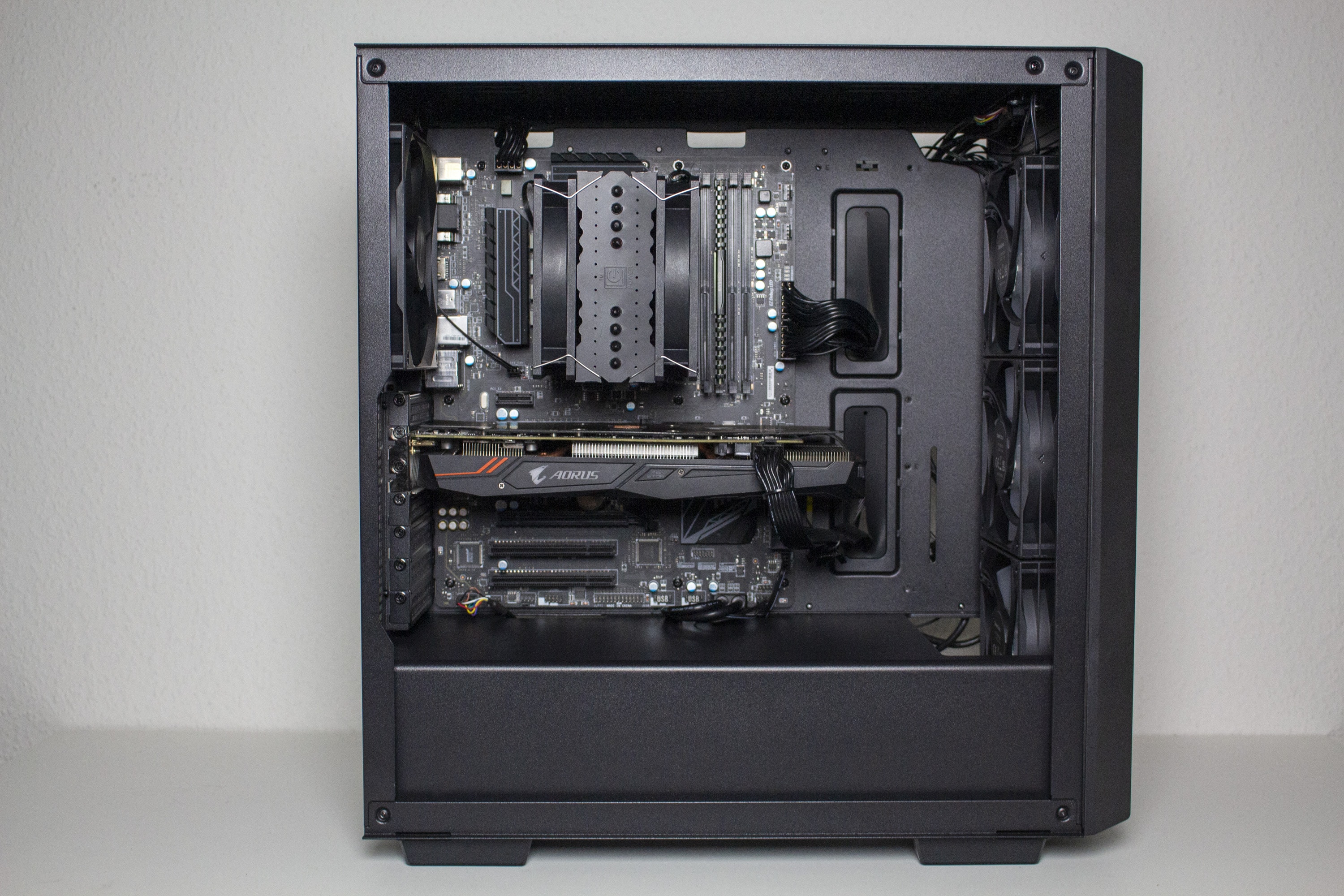 Nun kommen wir zum Systemeinbau. Als Hardware verwenden wir einen AMD Ryzen 5 1400 auf einem MSI B350 PC Mate mit 16GB Crucial Ballistix Sport LT grau DDR4-2666. Der Ryzen wird von einem LC-Power Cosmo Cool LC-CC-120-RGB gekühlt und ist auf 3,8 GHz (1,25 V) übertaktet. Für die Bildausgabe ist eine GTX 1060 6GB von Gigabyte AORUS zuständig. Die Stromversorgung erledigt das vollmodulare LC-Power LC550 V2.31 Platinum mit einem Effizienzgrad von 80 Plus Platinum.