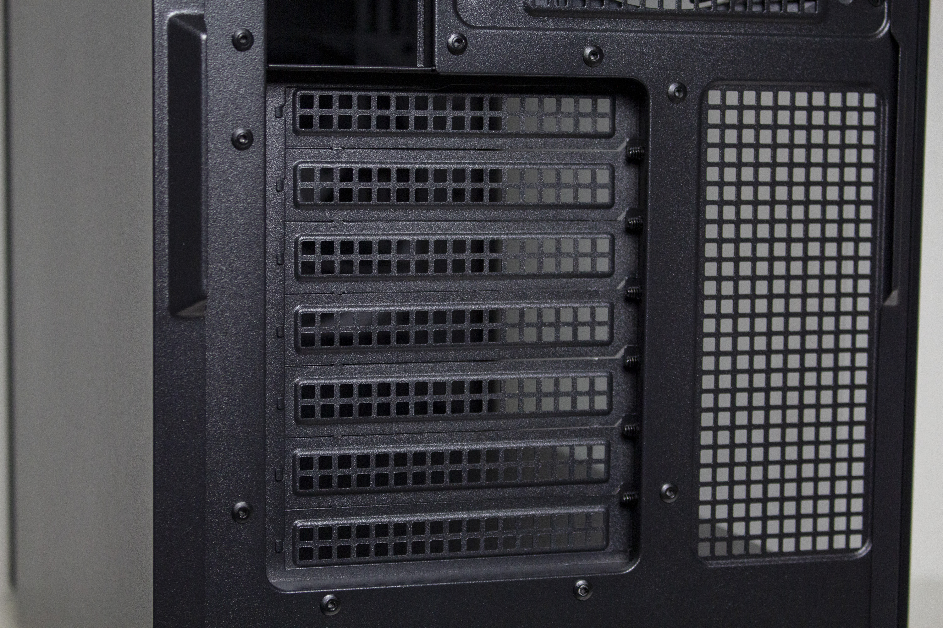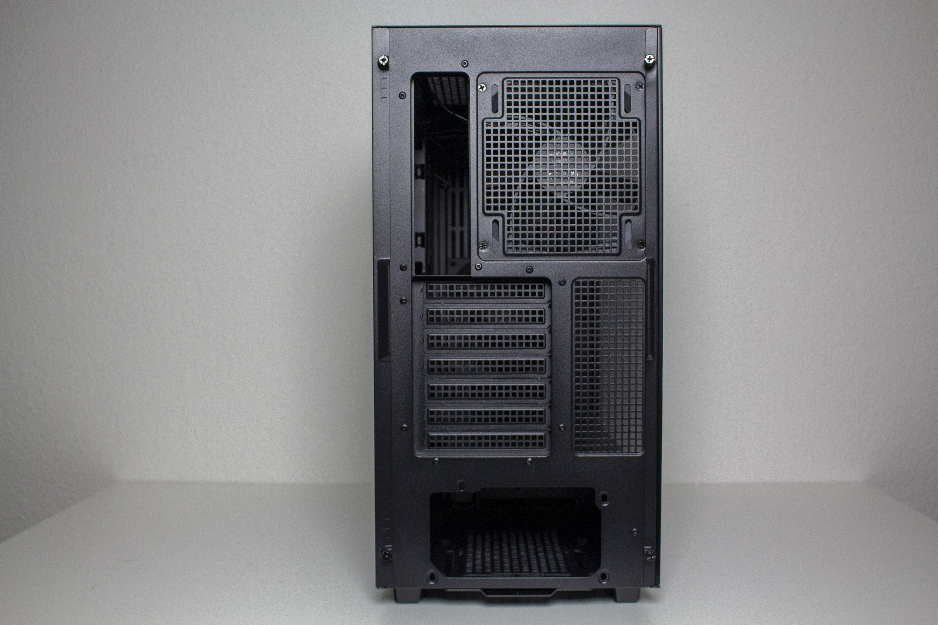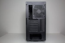 Die Rückseite des CK500 verbirgt nichts außergewöhnliches. Das Netzteil wird am Boden platziert und darüber finden sich sieben Erweiterungsslots mit wiederverwendbaren Blenden. Die Verschraubung der Erweiterungskarten erfolgt erstaunlicherweise im Innenraum und nicht außerhalb. Über den Erweiterungsslots ist der zweite vorinstallierte Lüfter im 140er-Format und der Ausschnitt für die I/O-Blende des Mainboards zu finden.