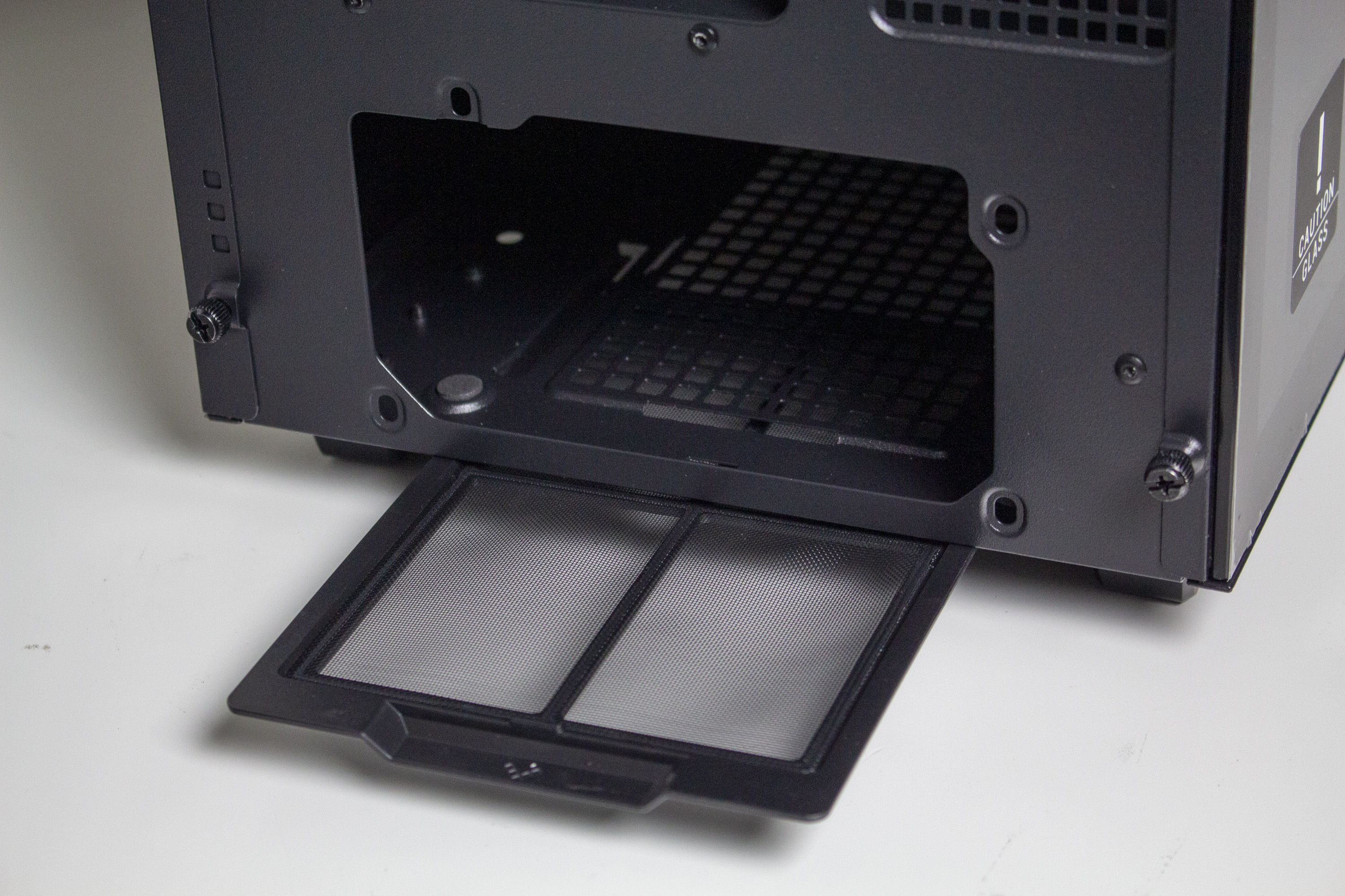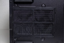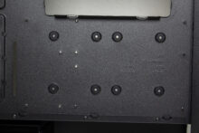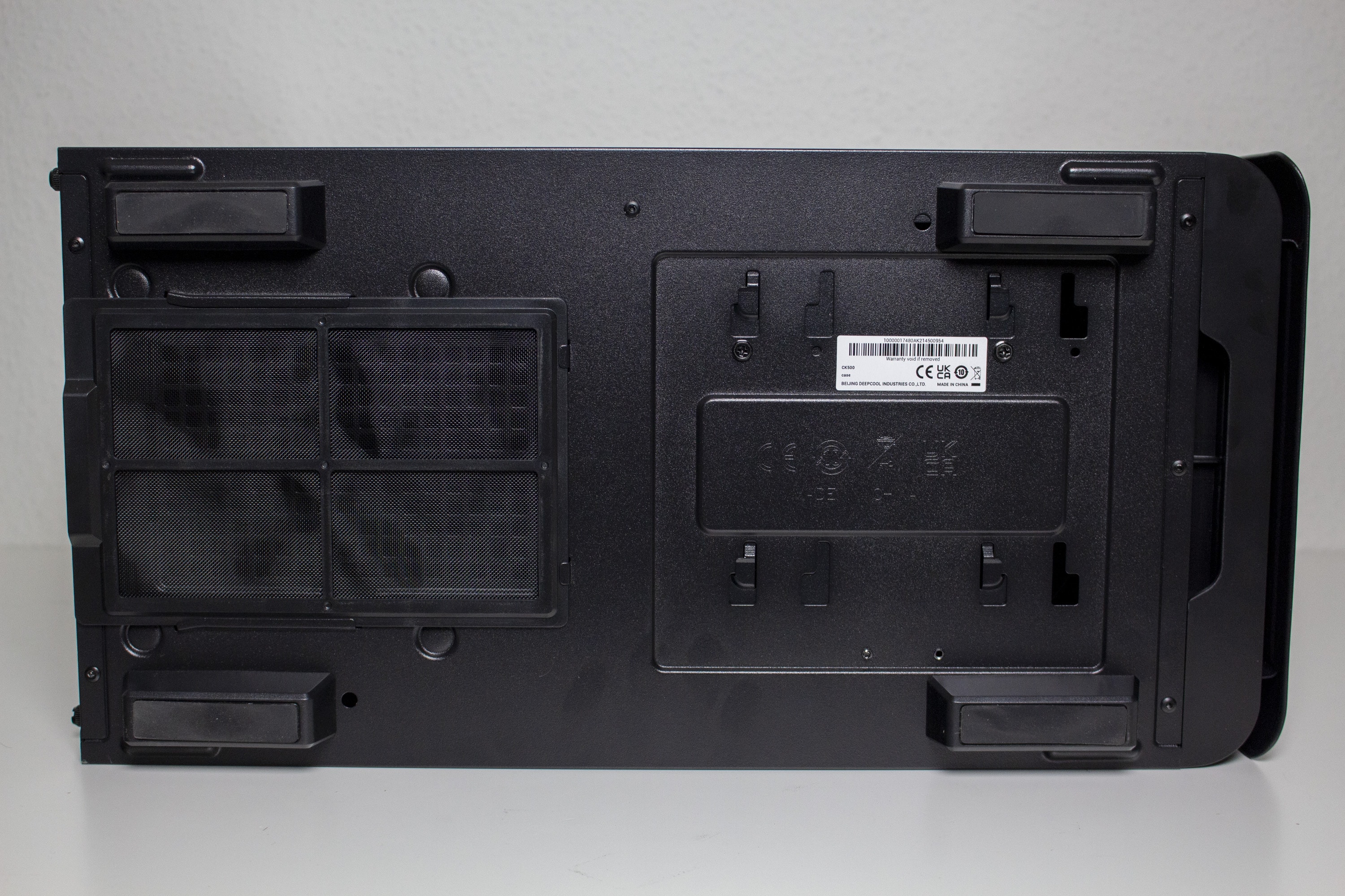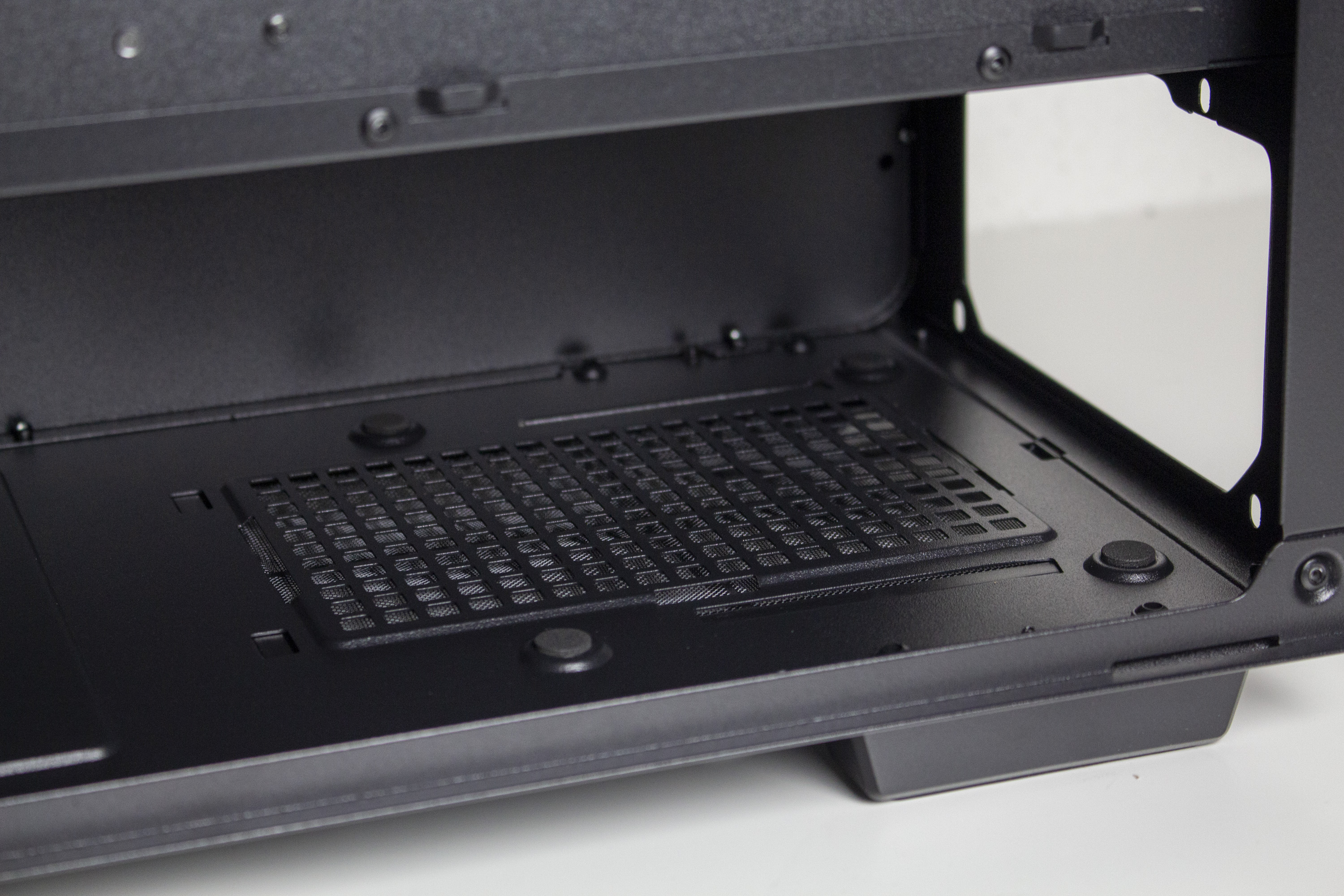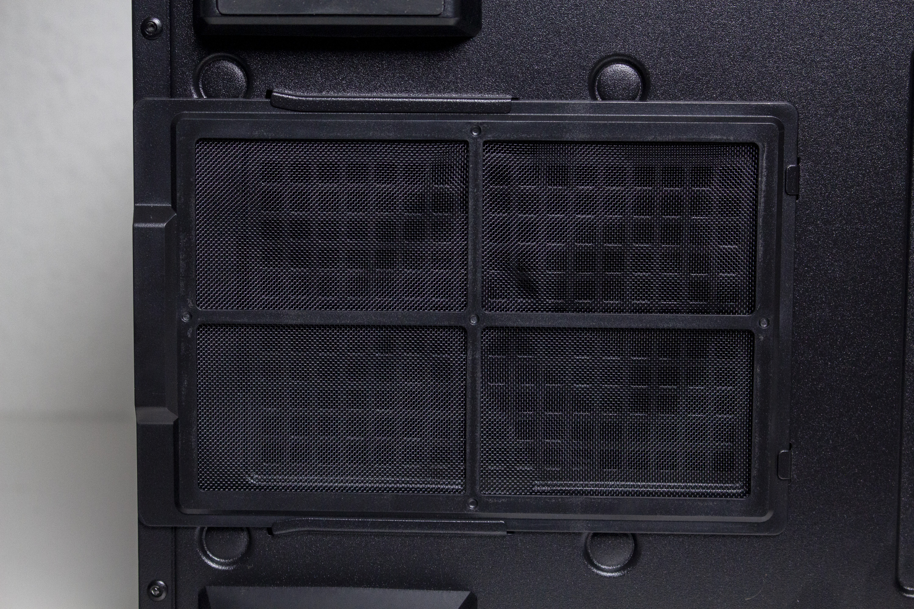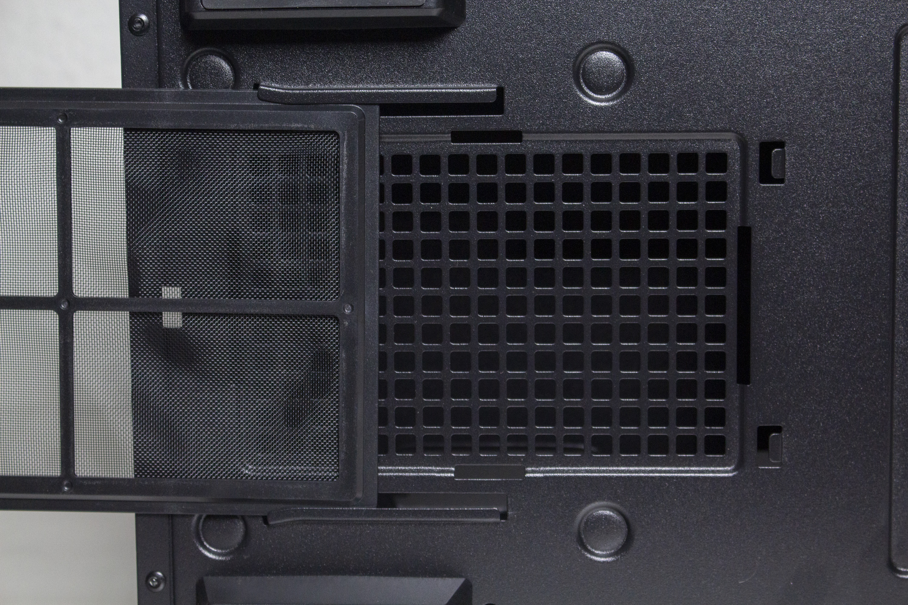 Anders als beim CG560, wurde beim CK500 nicht am Staubfilter gespart. So wurde hier keine einfache Matte aus Mesh vor dem Netzteil platziert, sondern ein feiner Staubfilter mit Kunststoffrahmen verbaut. Dieser lässt sich zur Reinigung einfach nach hinten abziehen. Einen sicheren Stand erhält der Tower durch vier Standfüße aus Kunststoff, die zusätzlich mit einer Schicht Gummi beklebt wurden. Ein weiteres auffälliges Merkmal sind zwei Schrauben in der Nähe des HDD-Käfigs, die auf eine Modularität hindeuten.