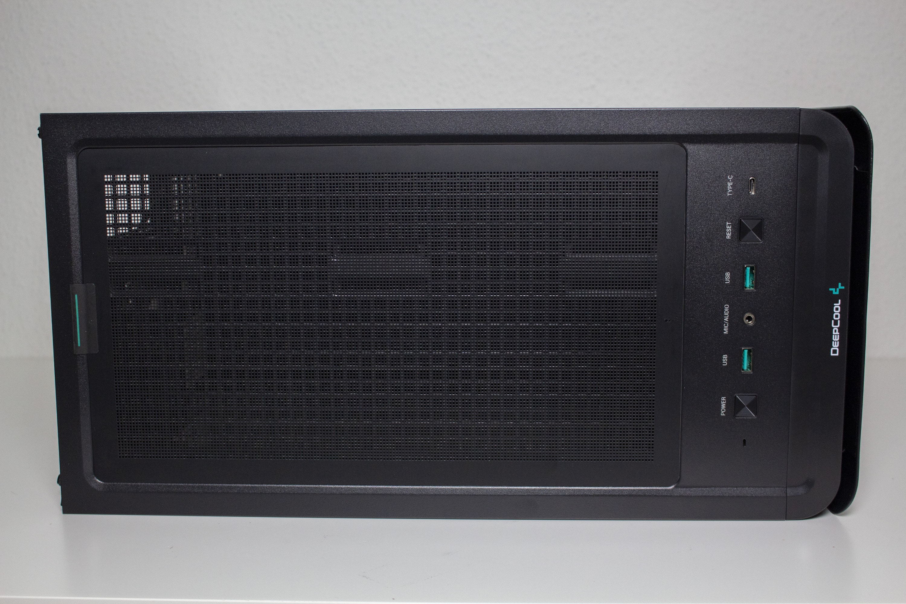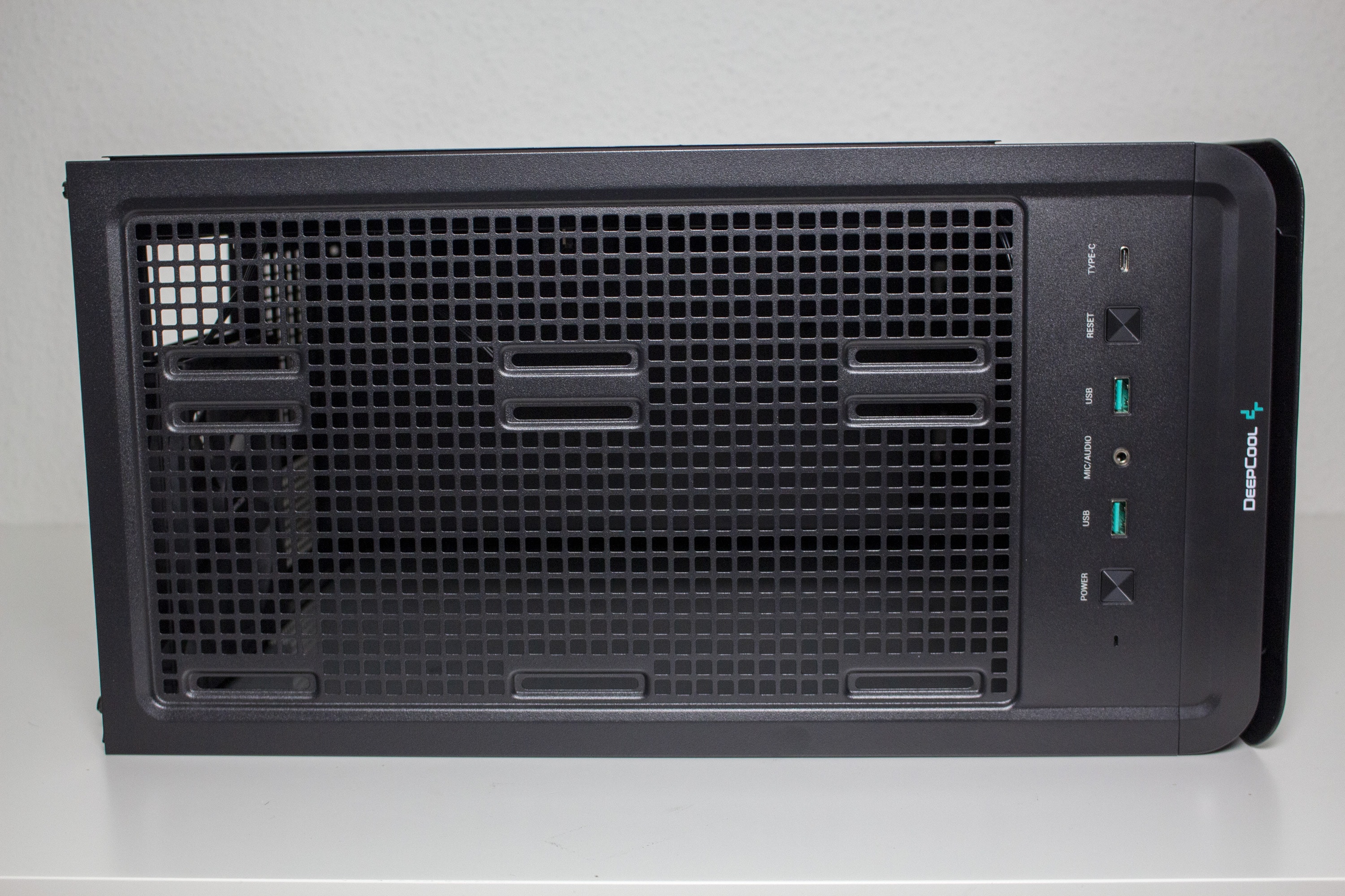 Anders als die Front, wurde der Deckel eher luftig gestaltet und für den Einbau von Lüftern oder Radiatoren optimiert. Dominiert von einer großen Lüfteröffnung inklusive Staubfilter hat der Hersteller hier außerdem das I/O-Panel untergebracht. Dieses verfügt über einen USB-3.2-Typ-C- sowie zwei USB-3.0-Typ-A-Anschlüsse, einen HD-Audio-Comboport und zwei Taster für Power und Reset.