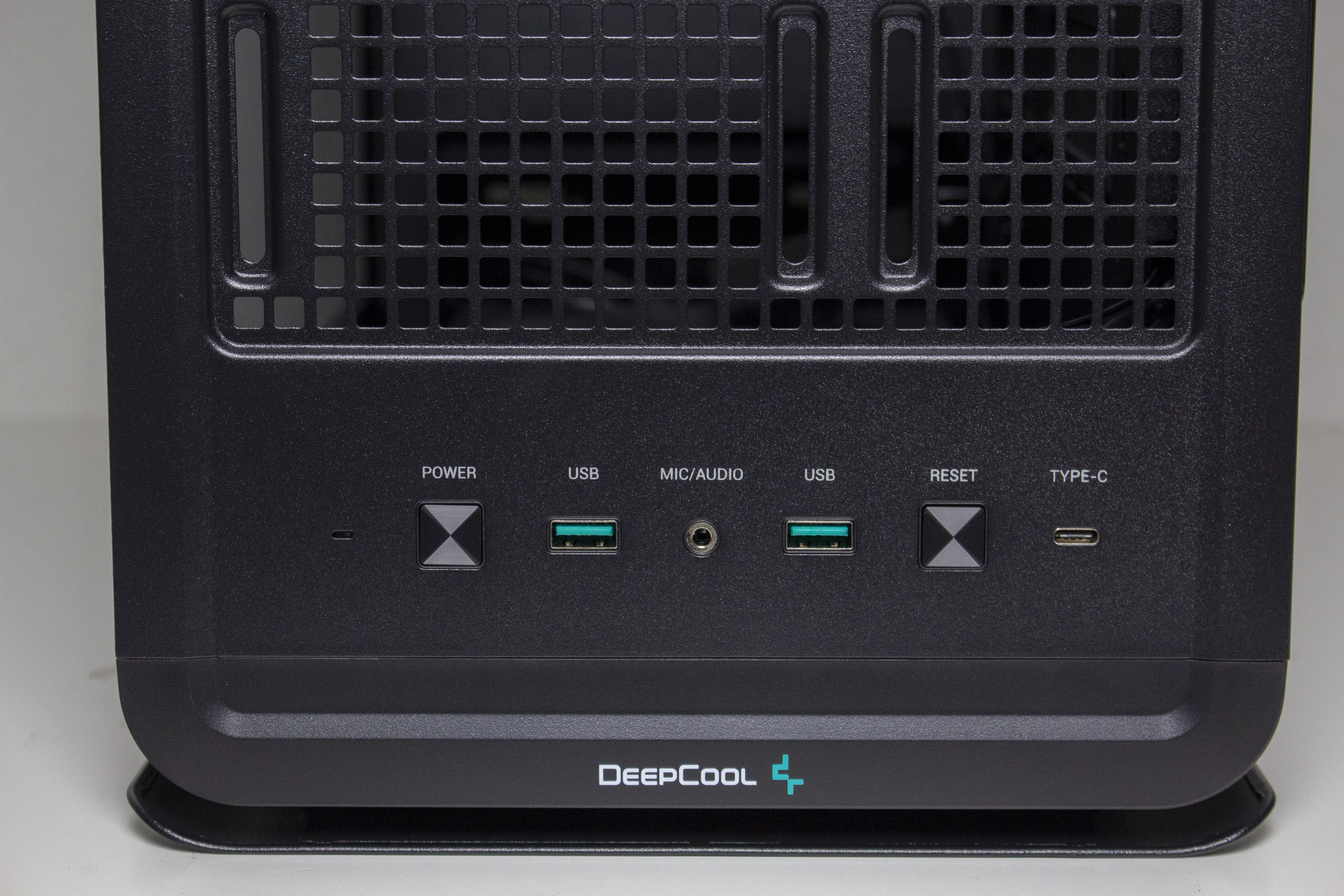 DeepCool hat das CK500 sehr schlicht und zeitlos gestaltet. Das Frontpanel zeichnet sich durch eine schwarz lackierte Stahlplatte aus, die vollständig geschlossen und nach hinten abgerundet ist. Für ausreichend Airflow sollen die länglichen Öffnungen sorgen, die beidseitig am Ende des Frontpanels zu finden sind. Durch einen leichten Ruck kann das magnetisch arretierte Frontpanel entfernt werden und gibt den Blick auf einen feinen Staubfilter frei. Hinter diesem Filter hat DeepCool zudem einen einzelnen 140-Millimeter-Lüfter positioniert. Ob und wie stark die geschlossene Stahlplatte den Airflow beeinflusst, untersuchen wir später etwas genauer.
