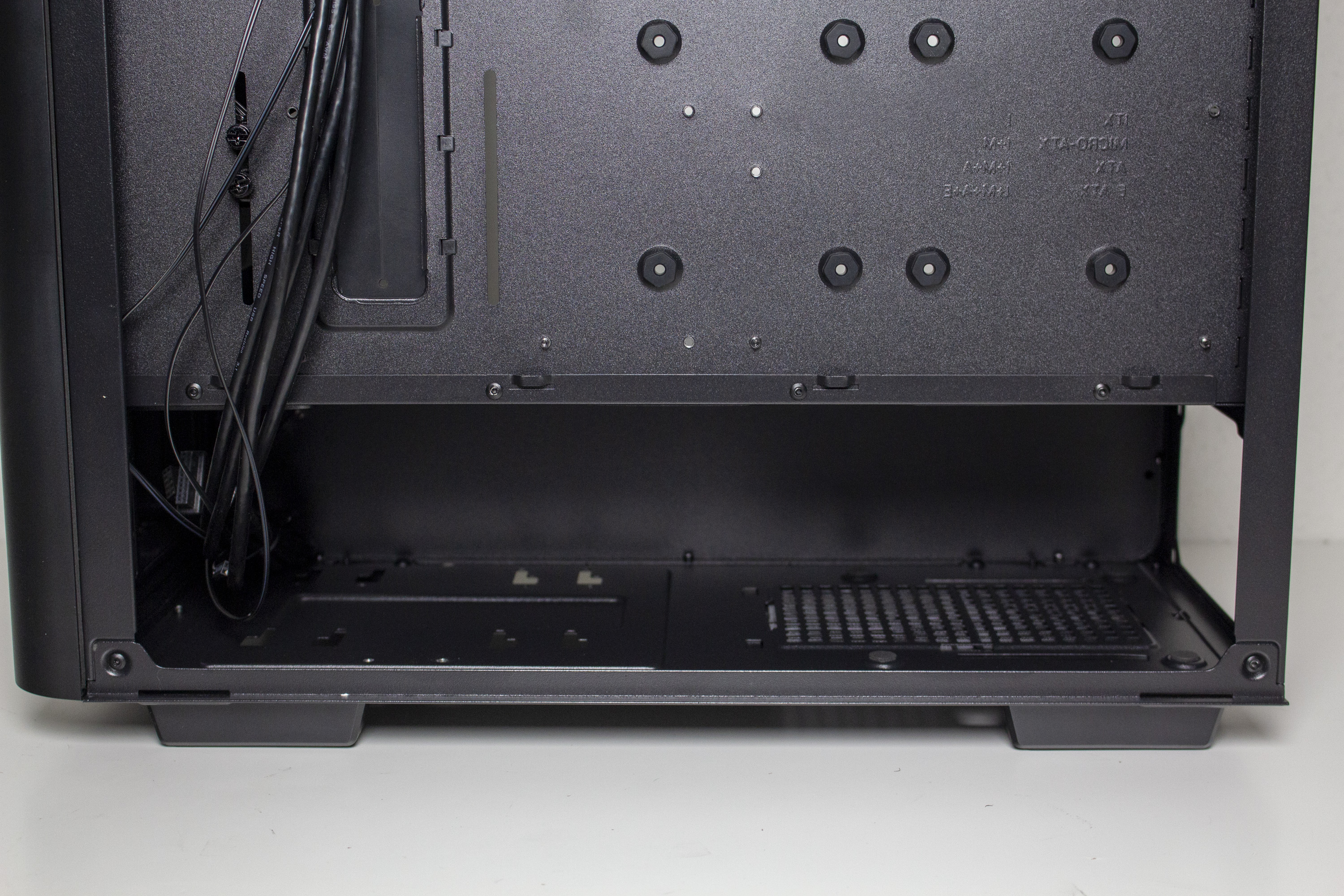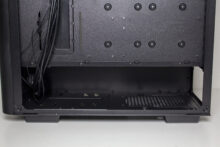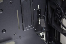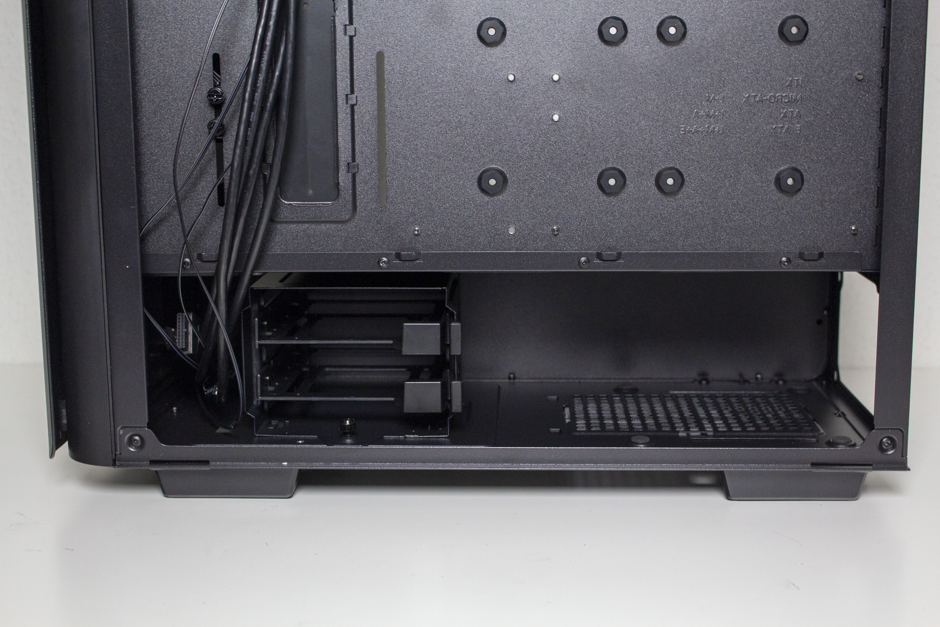 Unterhalb der Netzteilabdeckung verstecken sich offensichtlich das Netzteil und ein modularer HDD-Käfig. Der Montageplatz des Netzteils verfügt zur Minimierung von Vibrationen über dünne Gummipuffer. Ansonsten gibt es auf der Rückseite des Mainboard-Trays vor allem Platz für Kabel. Um die Anschlüsse des Netzteils noch besser verlegen zu können, hat der Hersteller an zahlreichen Stellen Halteösen für Kabelbinder in die Rückwand stanzen lassen und die Kabel des I/O-Panels bereits vorverlegt.