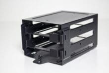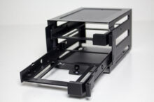 Die Installationsmöglichkeiten für herkömmliche Datenträger entsprechen dem gewählten Layout. So können im modularen HDD-Käfig entweder zwei 3,5″- oder 2,5″-HDDs eingebaut werden. Dazu müssen die Kunststoffrahmen herausgezogen, bestückt und wieder hineingeschoben werden. Zusätzlich lassen sich an der Rückseite des Mainboard-Trays zwei weitere SSDs platzieren. Hier erfolgt die Befestigung über Gummiringe und längliche Schrauben. Pro SSD muss man vier solcher Schrauben befestigen und den Datenträger dann an die Gummiringe drücken. Einfacher geht es nicht.