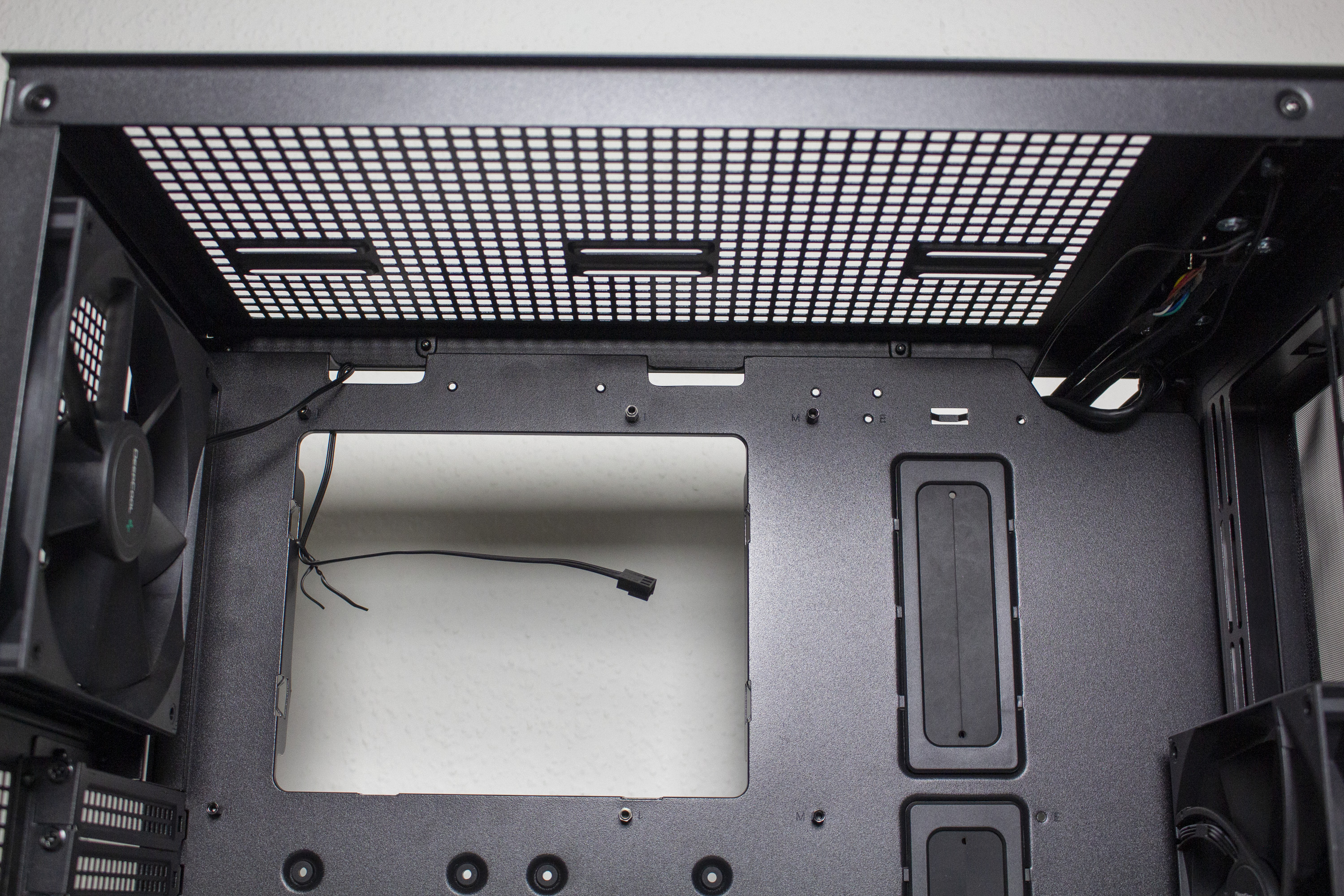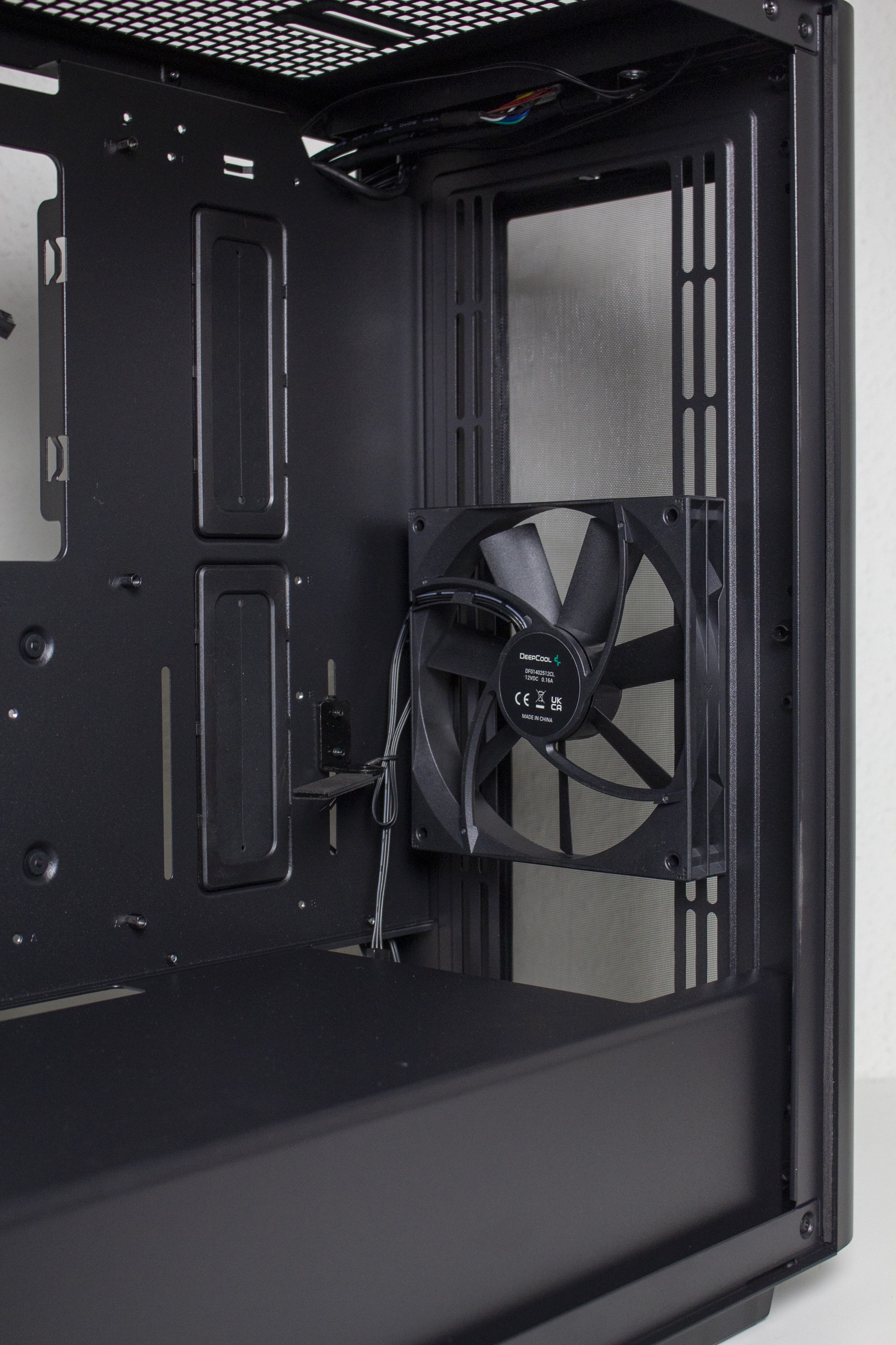 Im Innenraum gibt es in Bezug auf das Layout keine Unterschiede zum CG560. So unterteilt sich das Innere in zwei Kammern. Die obere Kammer ist sehr groß und zeichnet sich durch ein planes Mainboard-Tray aus. Zur Optimierung der Verkabelung hat DeepCool das Tray mit zwei großen und drei kleinen Kabelmanagement-Öffnungen ausgestattet. Die zwei großen Löcher verfügen zusätzlich über Gummierungen. Durch die offene Gestaltung des Innenraums kann der vorinstallierte Frontlüfter problemlos Frischluft in den Innenraum befördern. Ein weiteres Feature des CK500 findet sich aber im vorderen Bereich auf der Höhe der Grafikkarte. DeepCool hat diesem Midi-Tower nämlich eine modulare GPU-Halterung spendiert.