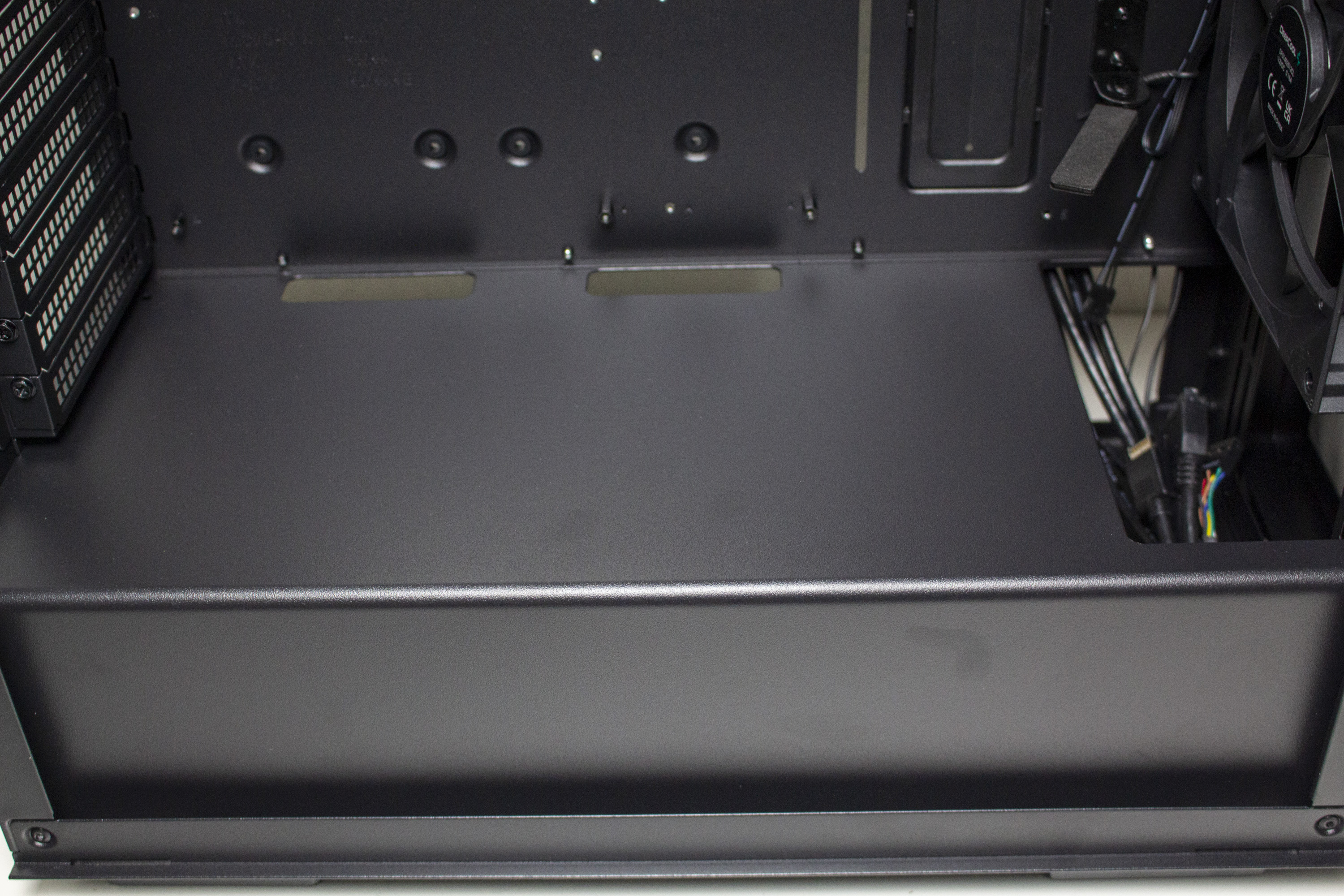 Wie so oft, kommt auch beim CK500 eine Netzteilabdeckung zum Einsatz. Diese verdeckt das Netzteil, dessen Kabel und den HDD-Käfig. Zur Erleichterung der Verkabelung verfügt die Abdeckung außerdem noch über zwei Kabelmanagement-Öffnungen und, im vorderen Bereich, über einen großen Ausschnitt der die Kompatibilität zu Radiatoren erhöhen soll.