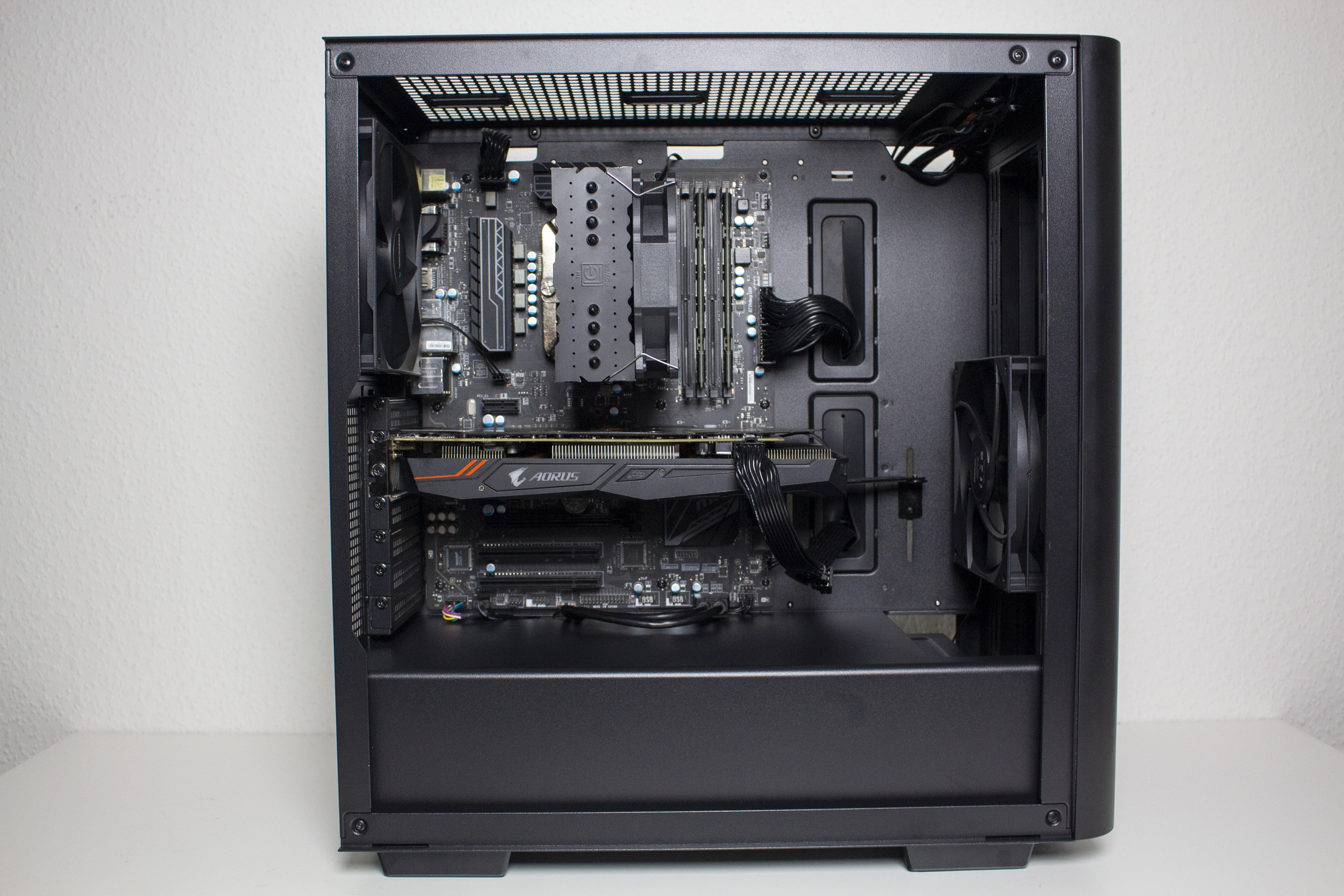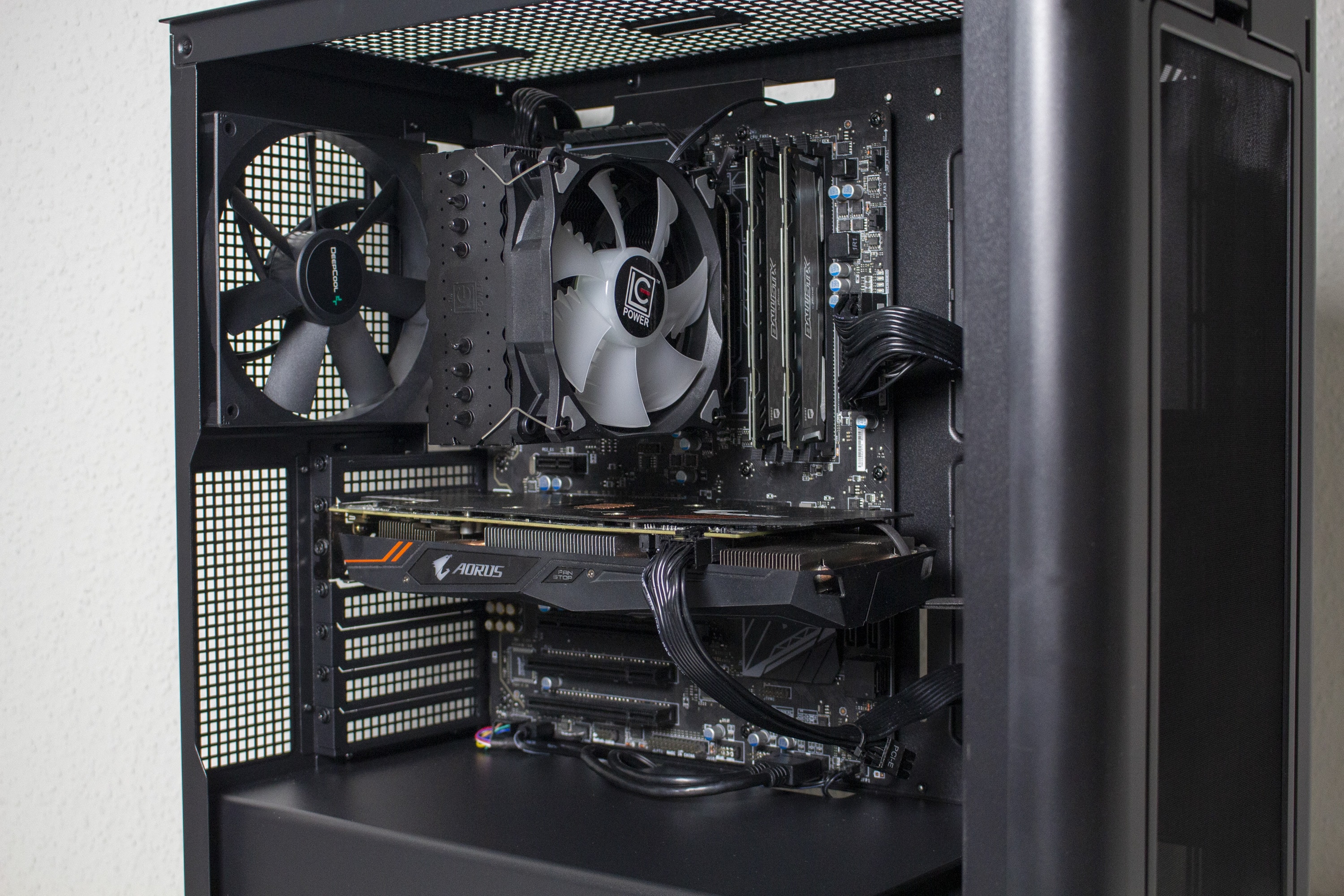 Nun kommen wir zum Systemeinbau. Als Hardware verwenden wir einen AMD Ryzen 5 1400 auf einem MSI B350 PC Mate mit 16GB Crucial Ballistix Sport LT grau DDR4-2666. Der Ryzen wird von einem LC-Power Cosmo Cool LC-CC-120-RGB gekühlt und ist auf 3,8 GHz (1,25 V) übertaktet. Für die Bildausgabe ist eine GTX 1060 6GB von Gigabyte AORUS zuständig. Die Stromversorgung erledigt das vollmodulare LC-Power LC550 V2.31 Platinum mit einem Effizienzgrad von 80 Plus Platinum.