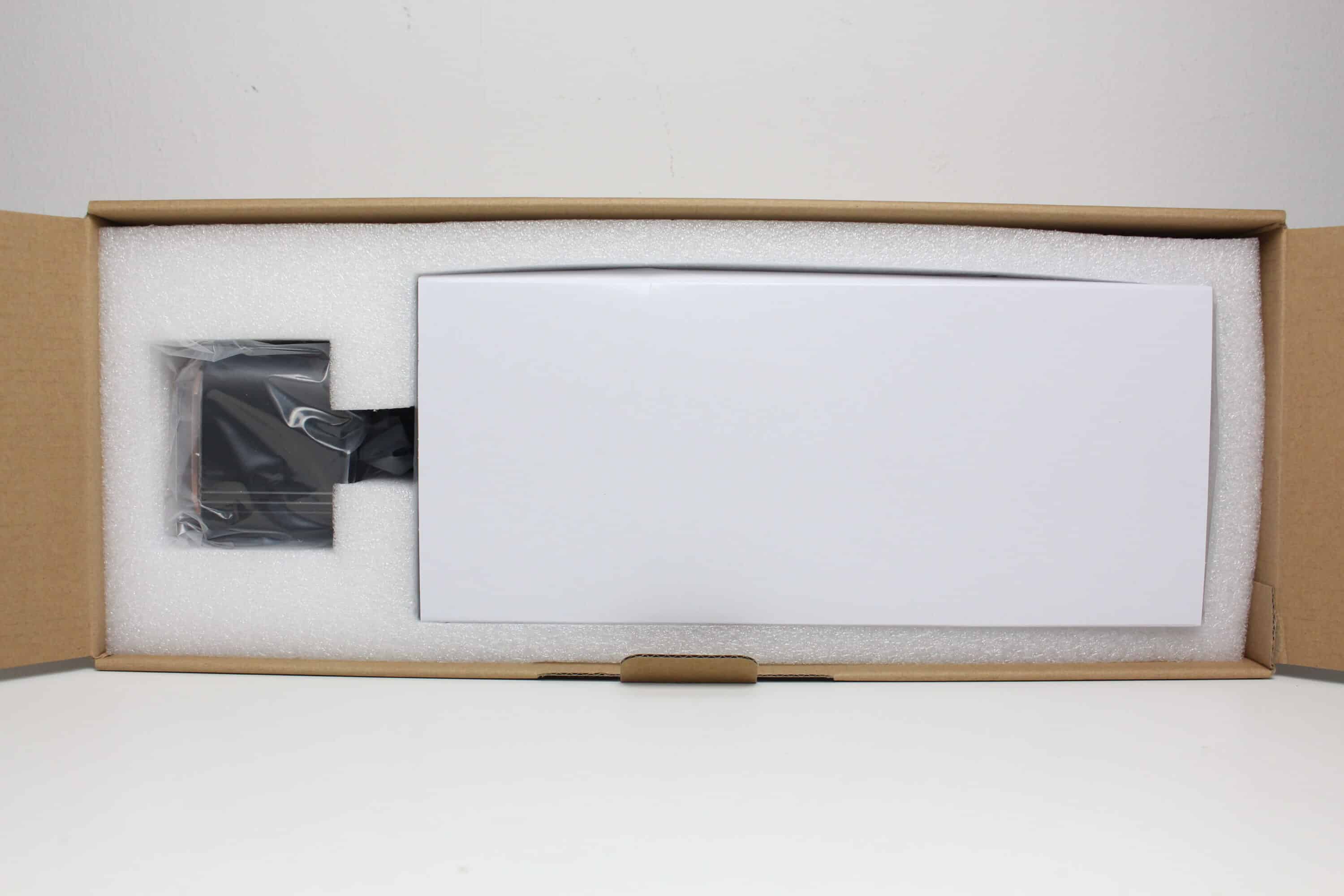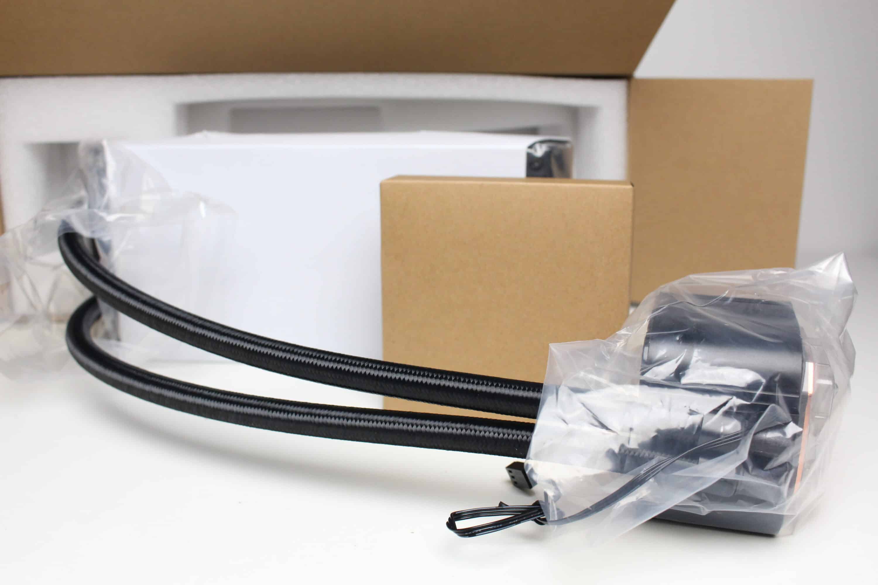 Öffnet man die Verpackung, dann trifft man zunächst auf eine weiße Pappschachtel und jede Menge weichen Schaumstoff. Die Pappschachtel dient in Verbindung mit einem weiteren Folie zum Schutz des Radiators. Auch der Pumpenblock wurde in eine zusätzliche Folie eingewickelt. Verdeckt vom Radiator finden wir dann noch eine braune Schachtel mit einer Montageanleitung, sämtlichen Montagezubehör sowie einem PWM-Splitter und zwei Low-Noise-Adaptern.