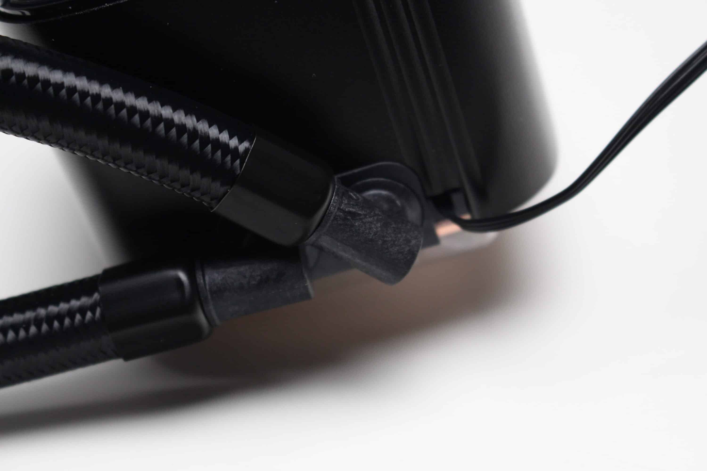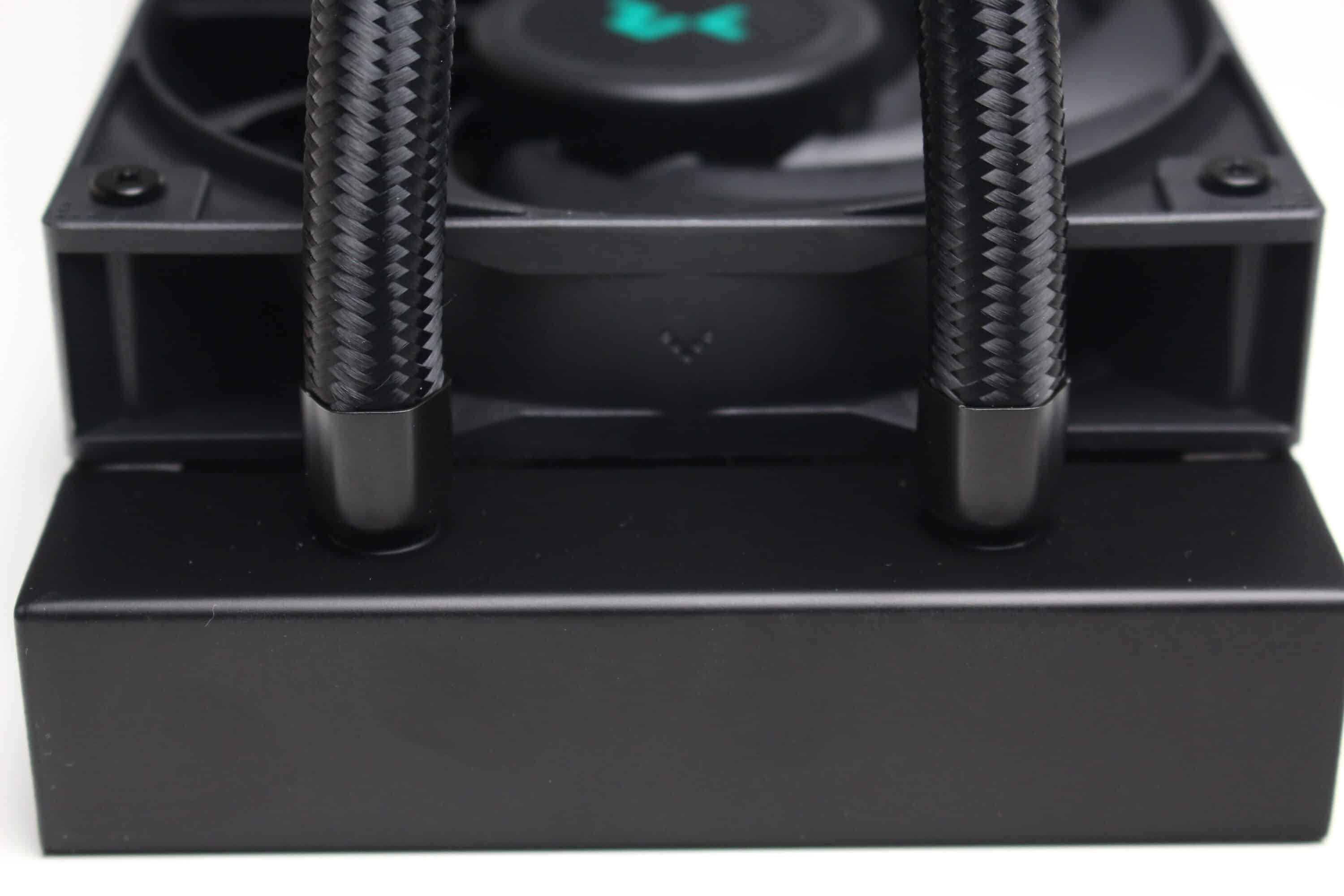 Die DeepCool LS520S Zero Dark verfügt über zwei schwarze, textilummantelte Schläuche, die mit jeweils 410 Millimeter durchschnittlich lang sind. Einer flexiblen Orientierung im Gehäuse sollte damit also nichts im Weg stehen. Sowohl am Radiator als auch an den drehbaren Gelenken am Pumpenblock wurden die Schläuche durch Stahlmuffen festgepresst. Somit ist diese Kompaktwasserkühlung nicht erweiter- oder auffüllbar.