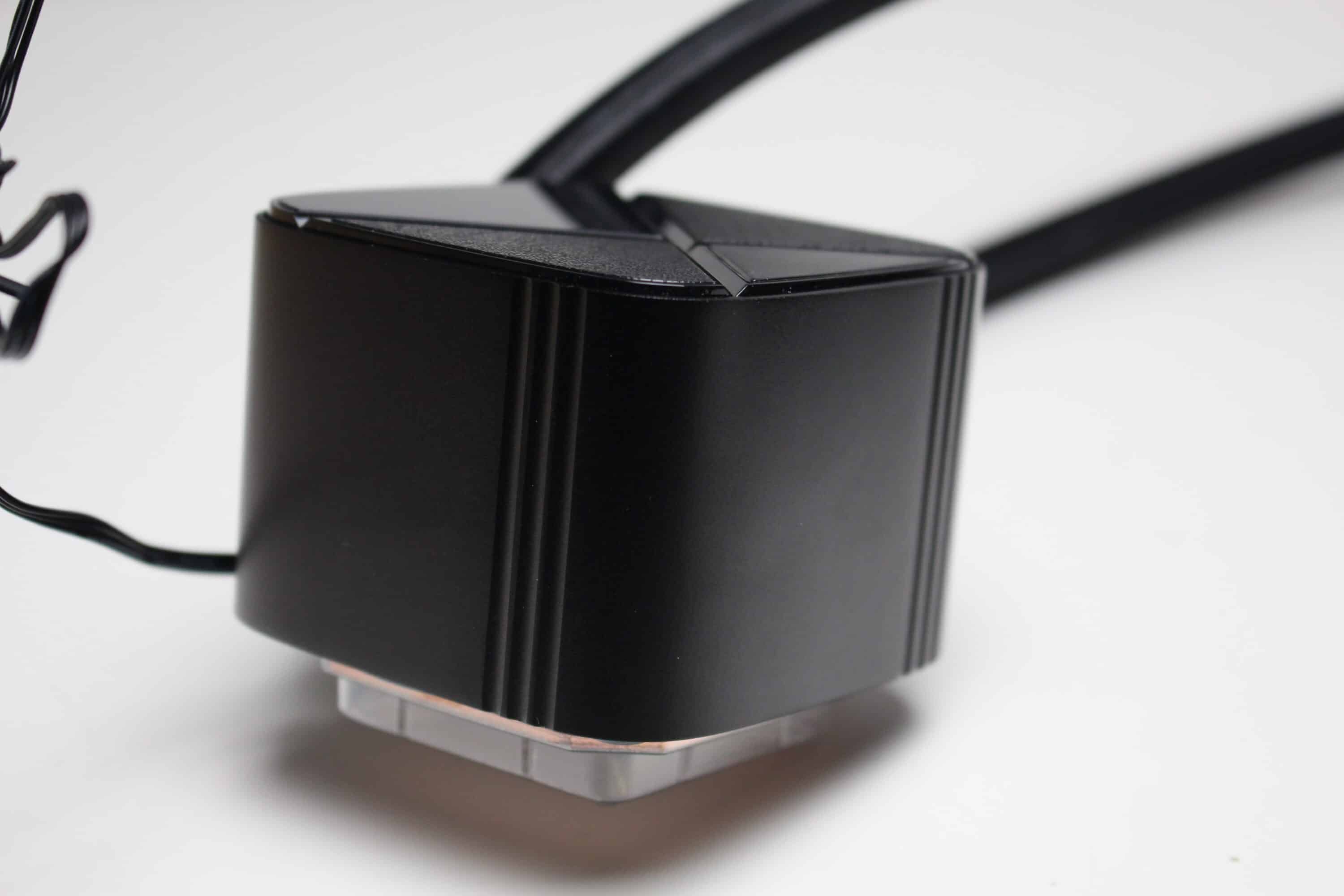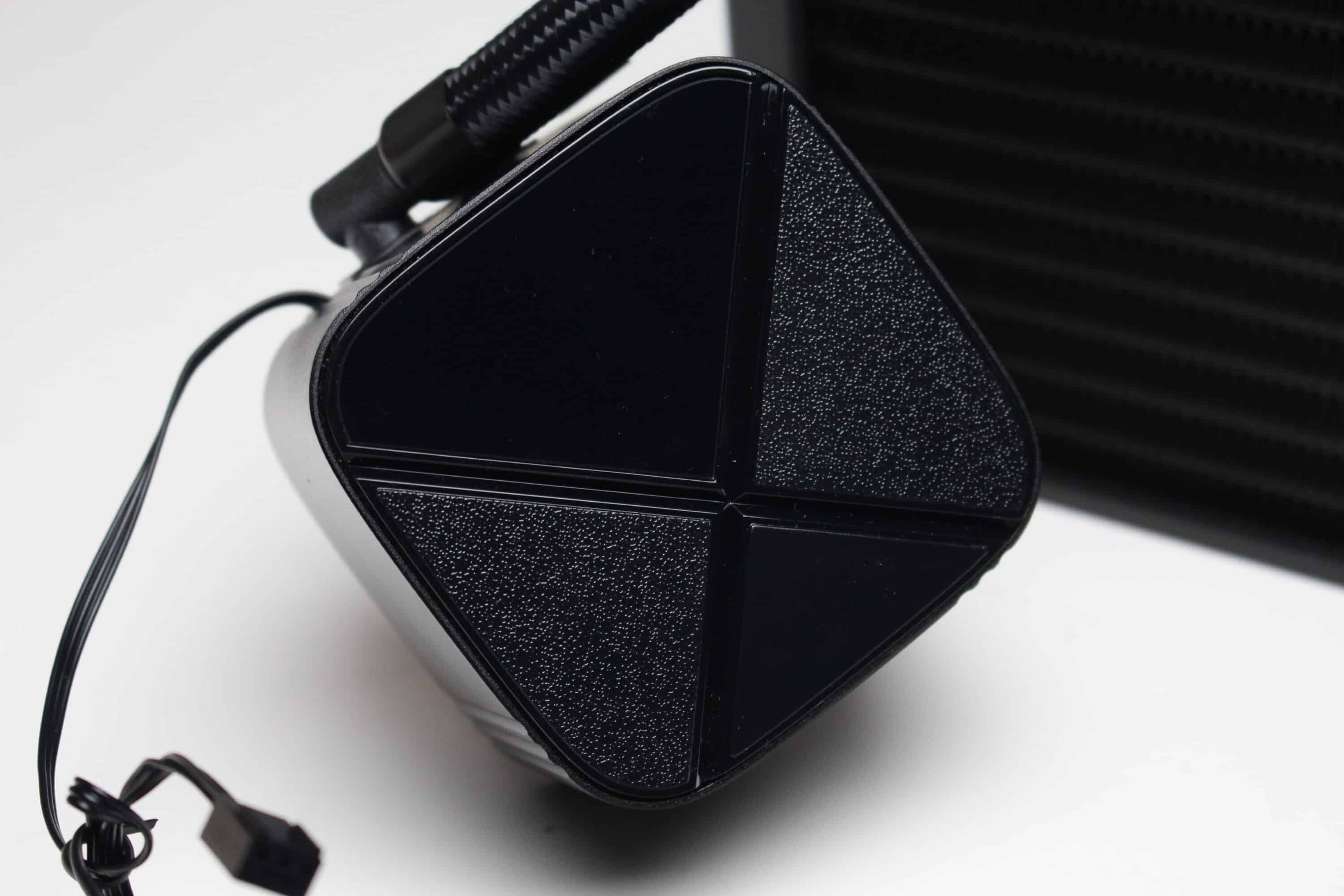 Schlicht geht es auch am Pumpenblock weiter. Dieser besteht aus einem schwarzen Kunststoff und ähnelt optisch dem Block der LS520 SE. Hier gibt es nun jedoch keinen ARGB-beleuchteten Infinity-Mirror mehr sondern eine schlicht-schwarze Deckelplatte, bestehend aus drei unterschiedlich strukturierten Bereichen sowie einem weiß beleuchtetes Herstellerlogo.