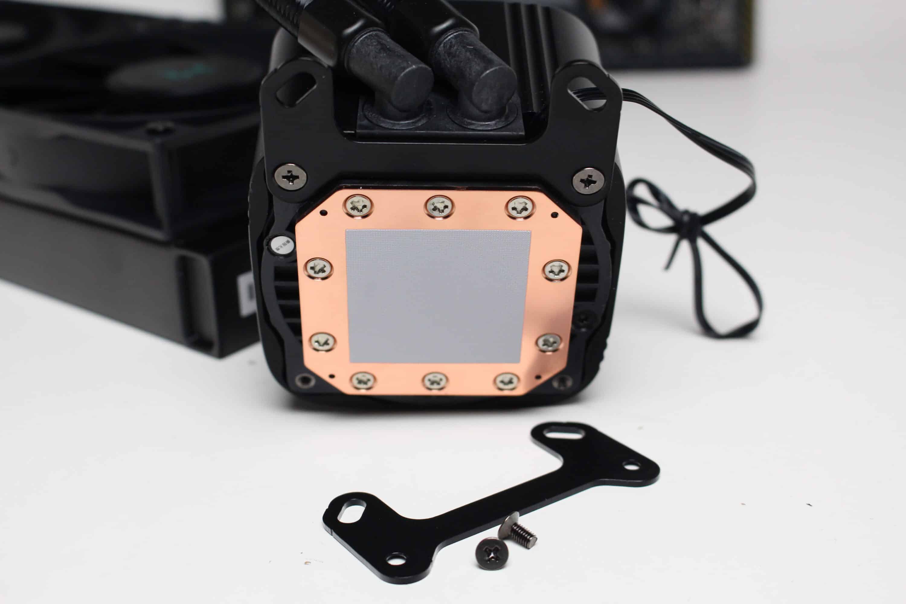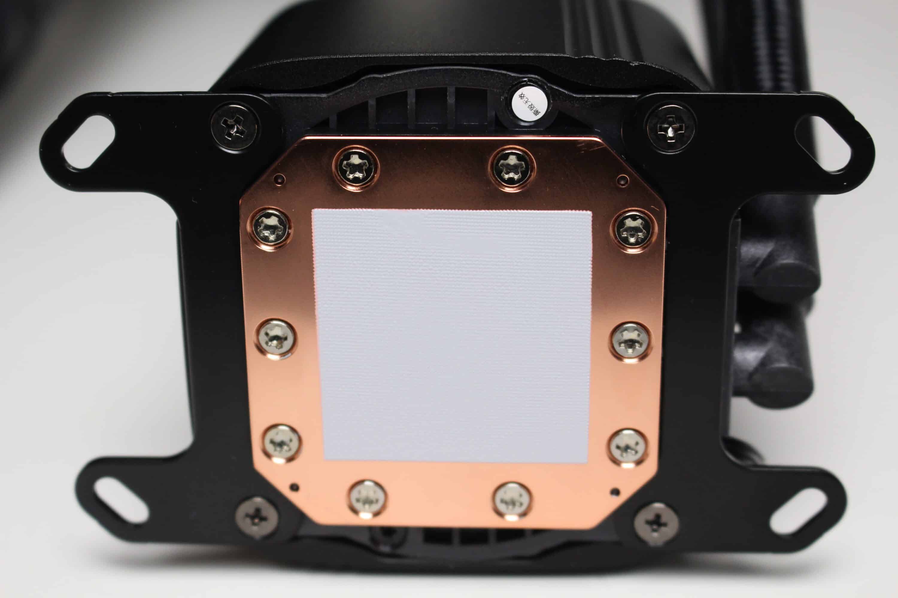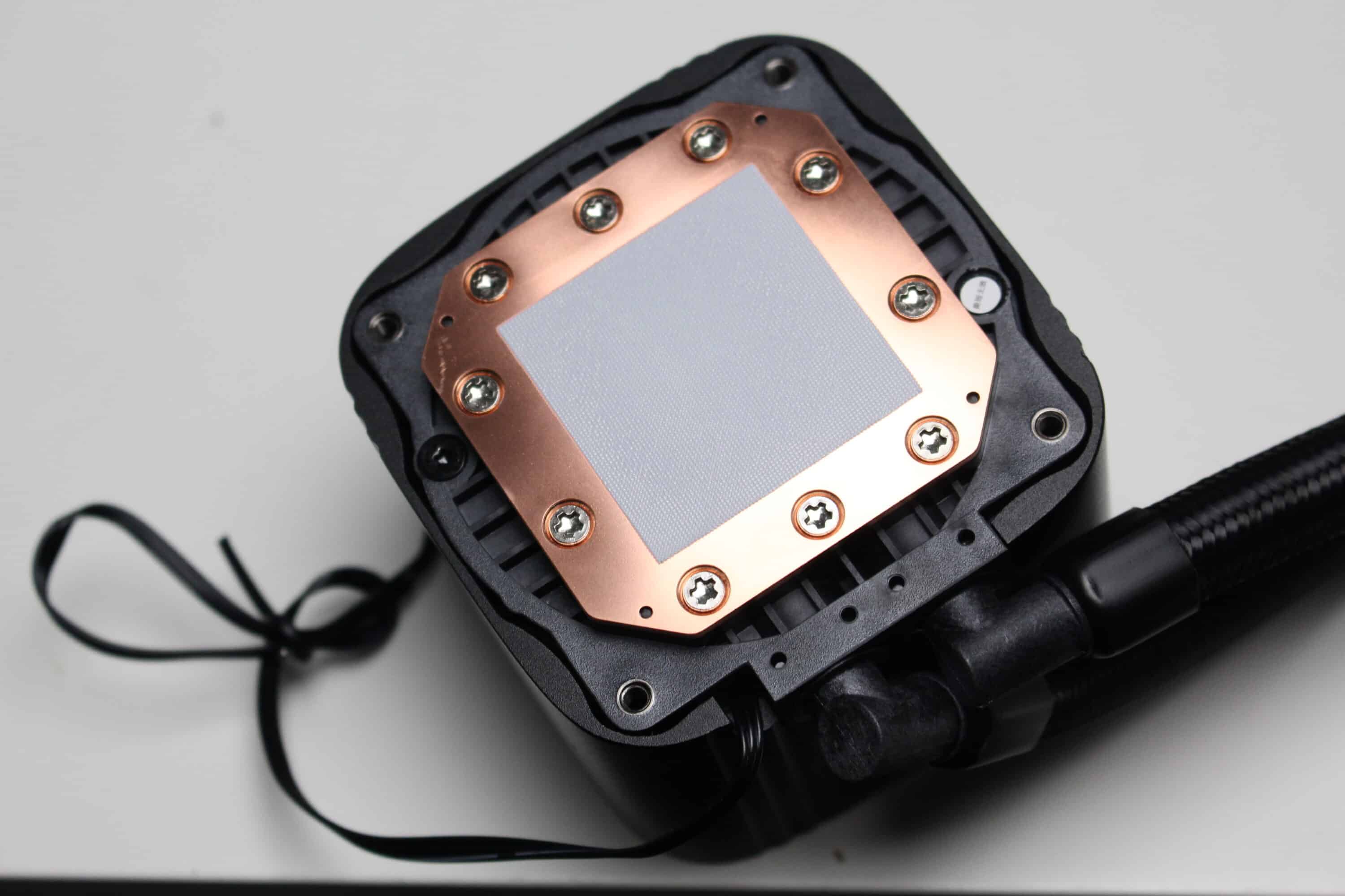 Der Anschluss der Pumpe erfolgt über ein 3-Pin-Kabel und lässt die Pumpe kostant mit circa 3100 Umdrehungen pro Minute drehen. Eine Reduzierung der Pumpendrehzahl ist leider nicht möglich. Die Weiterleitung der CPU-Wärme erfolgt über einen Kühlerboden aus Kupfer, auf den DeepCool bereits eine Schicht Wärmeleitpaste voraufgetragen hat.
