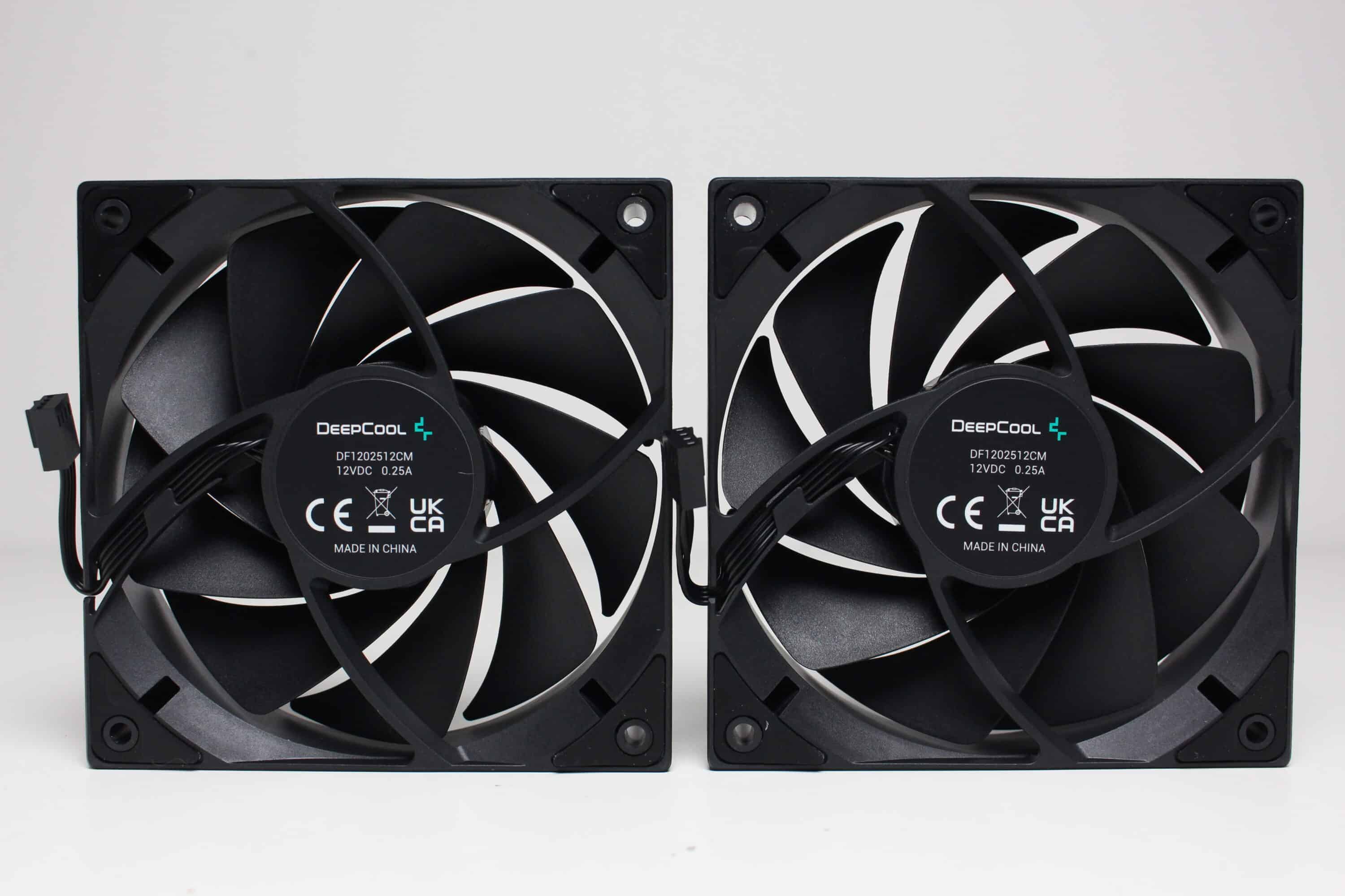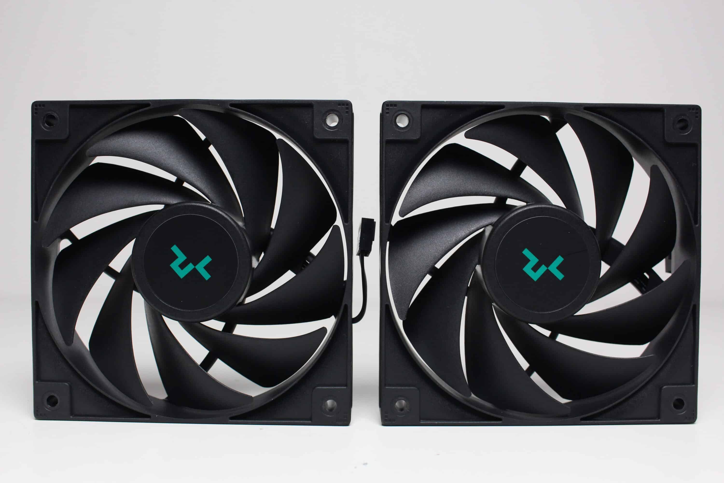 Zwei Lüfter vom Typ DeepCool DF1202512CM runden die schlichte Optik der LS520S Zero Dark ab. Sowohl der Rahmen als auch die 9-blättrigen Rotoren bestehen aus einem schwarzen Kunststoff und auch die Gummielemente in den Ecken sind dunkel gestaltet. Die Abmessungen belaufen sich auf 120x120x25 Millimeter und der Anschluss erfolgt über ein sehr kurzen PWM-Anschluss mit entsprechender Y-Weiche als Kabelverlängerung. DeepCool gibt für die Lüfter einen Drehzahlbereich zwischen 500 und 2250 Umdrehungen pro Minute an.