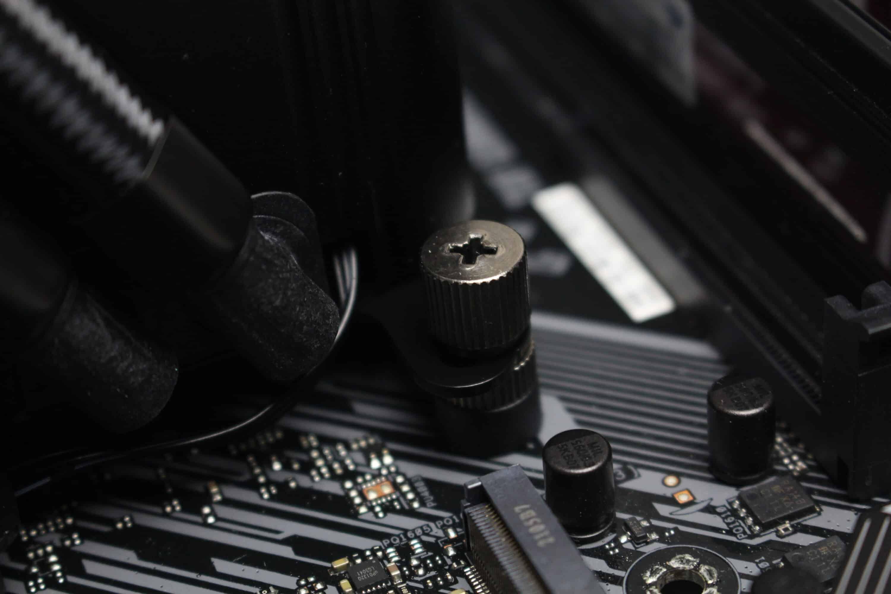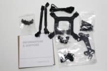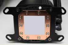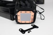 Als nächstes muss der Pumpenblock vorbereitet werden, indem zwei Montagebügel von unten angeschraubt werden. Die Orientierung ist theoretisch in 90-Grad-Schritten möglich. Anschließend wird der Pumpenblock auf die CPU gestellt und mit vier Rändelschrauben festgeschraubt. Im letzten Schritt wird der Radiator inklusive Lüfter im Gehäuse montiert.
