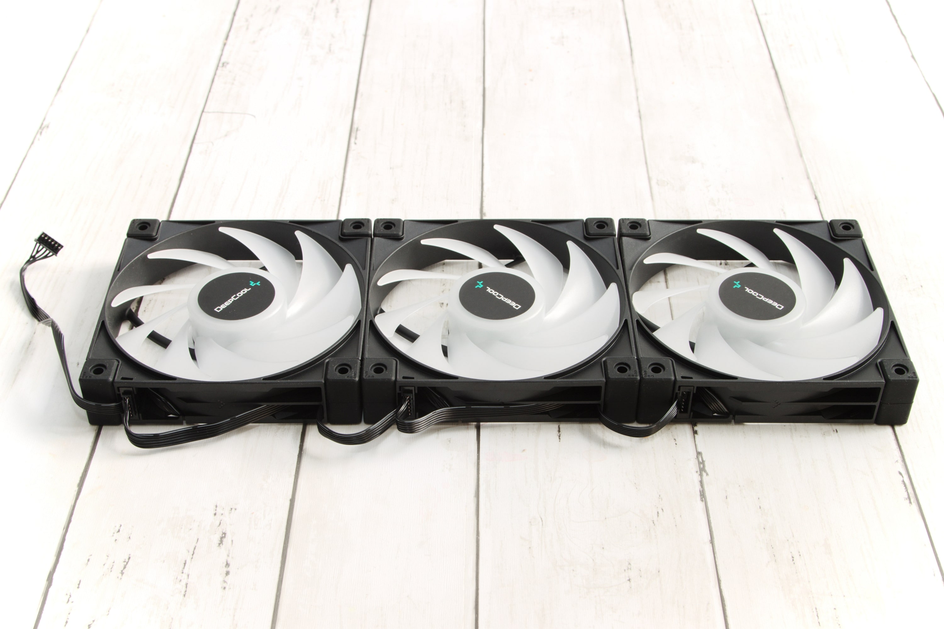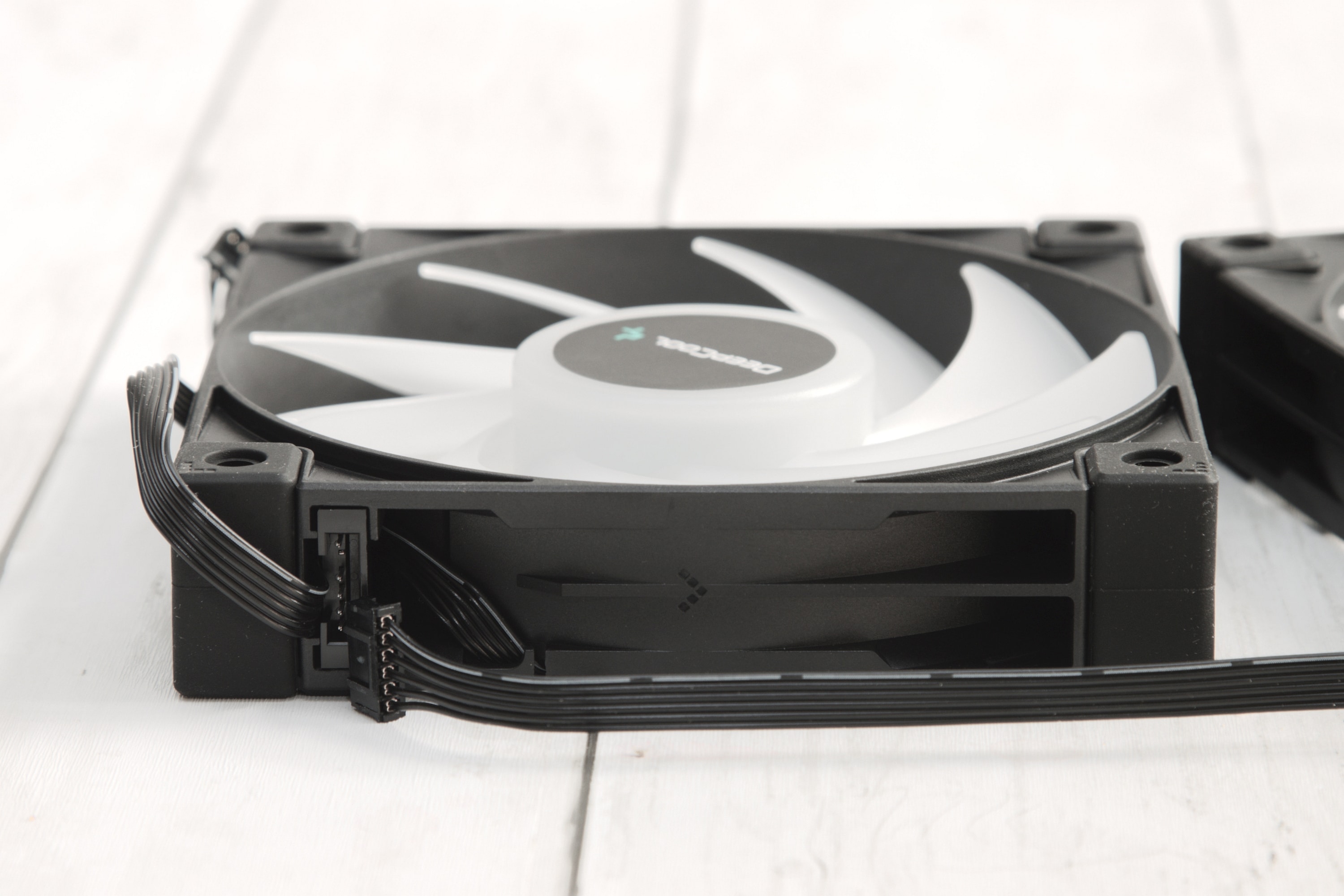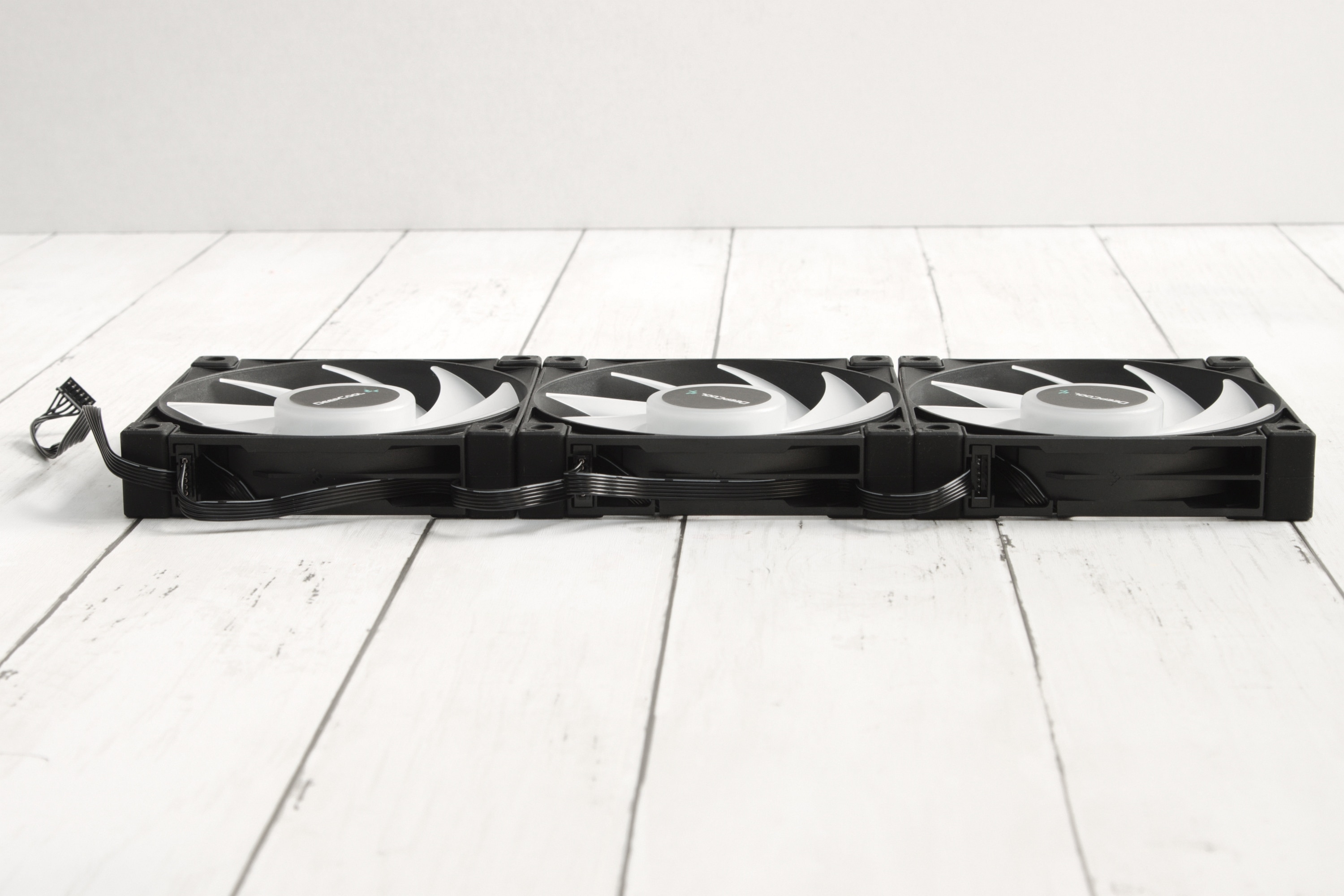 Aber hier kommen wir direkt zur Besonderheit, die den DeepCool LS720 zur Konkurrenz der Preisklasse herausstechen lässt: Die Lüfter können aneinander angeschlossen werden mit den Kabeln, die kaum länger sind als ein Lüfter breit ist. So können sie eine Lüfterkette bilden, die nur mit einem Kabel angesteuert werden muss, was den Kabelsalat deutlich reduzieren soll, denn üblicherweise muss man pro RGB-Lüfter je zwei Kabel an entsprechende Anschlüsse bringen.
