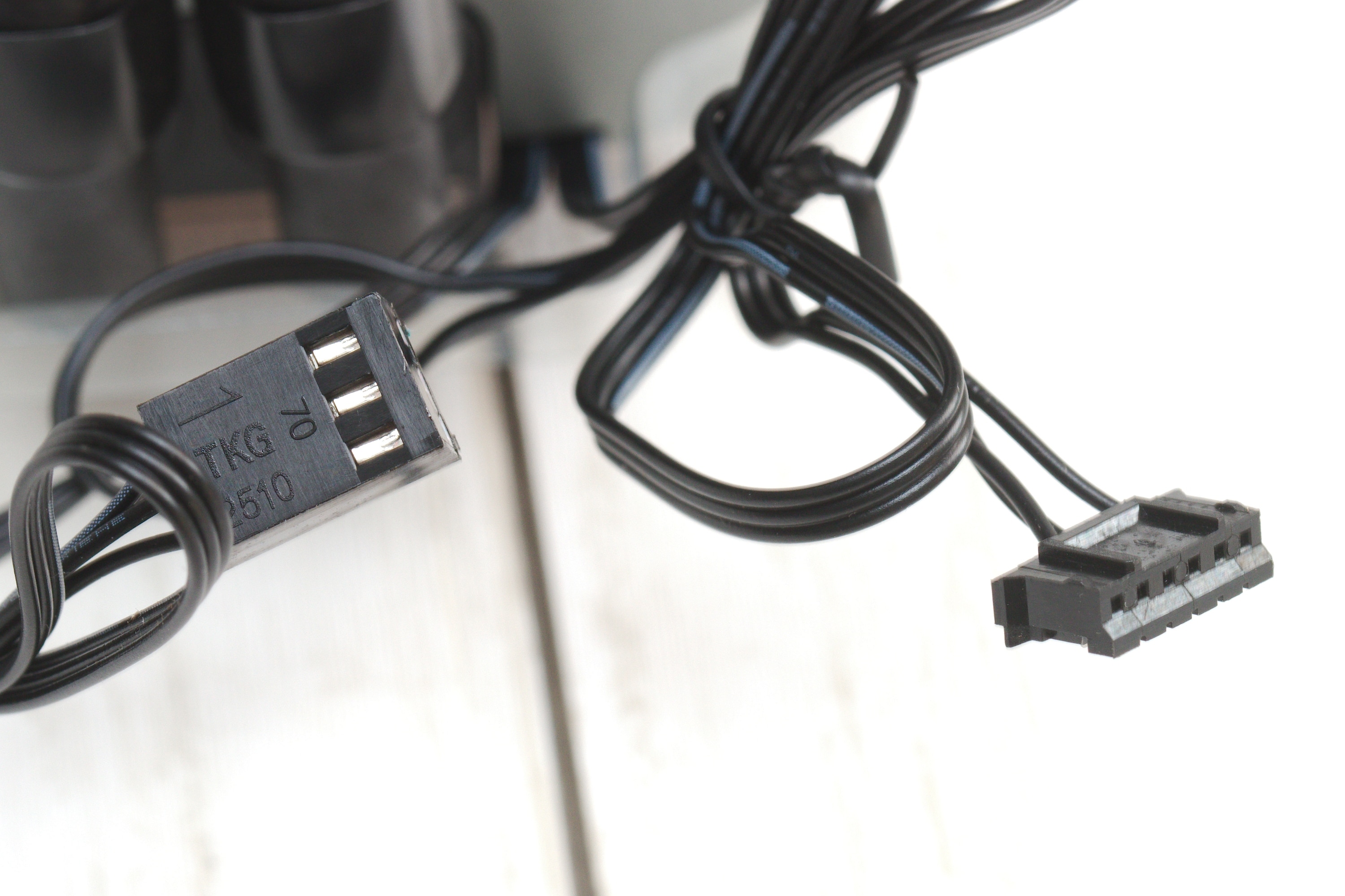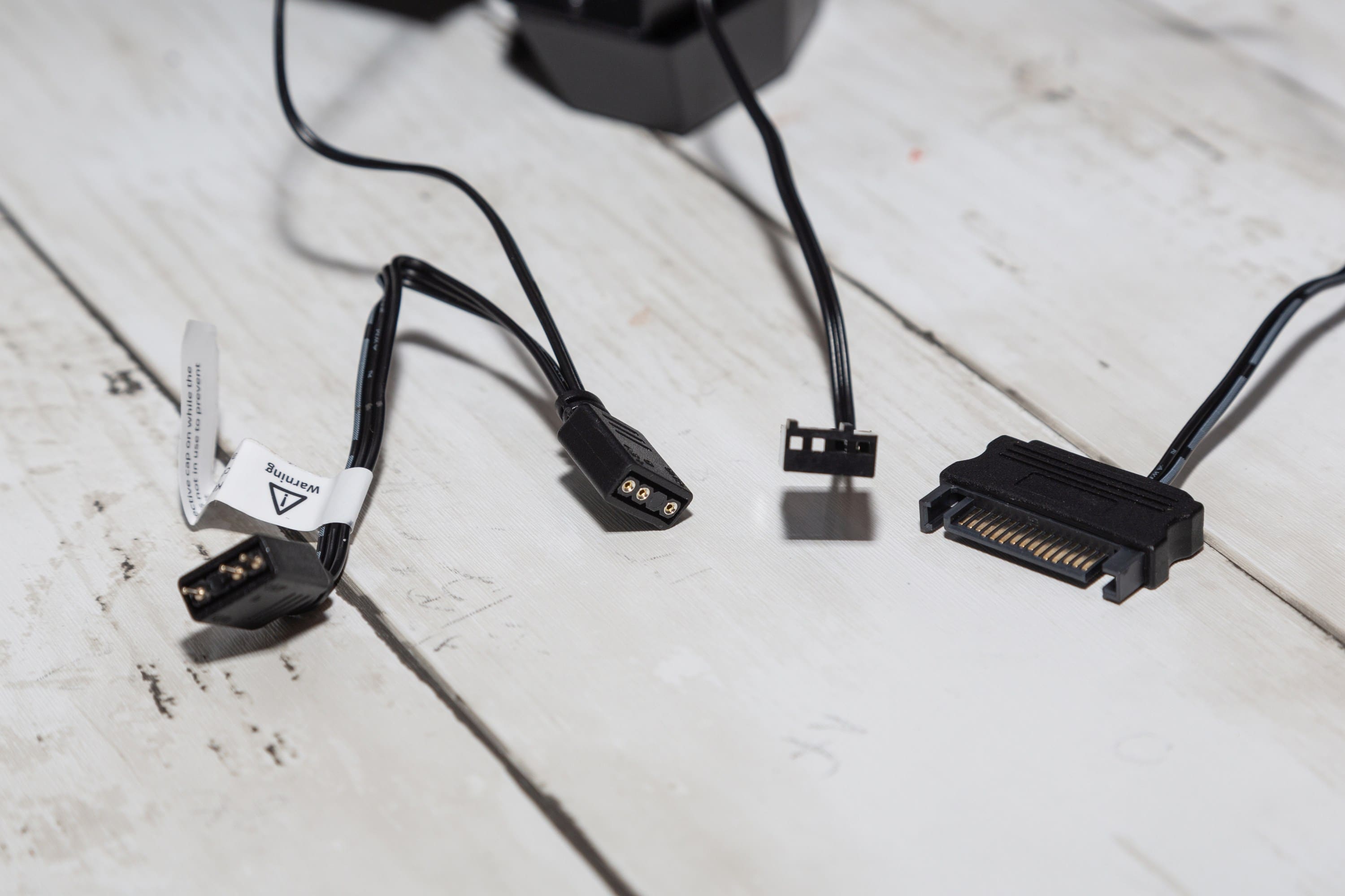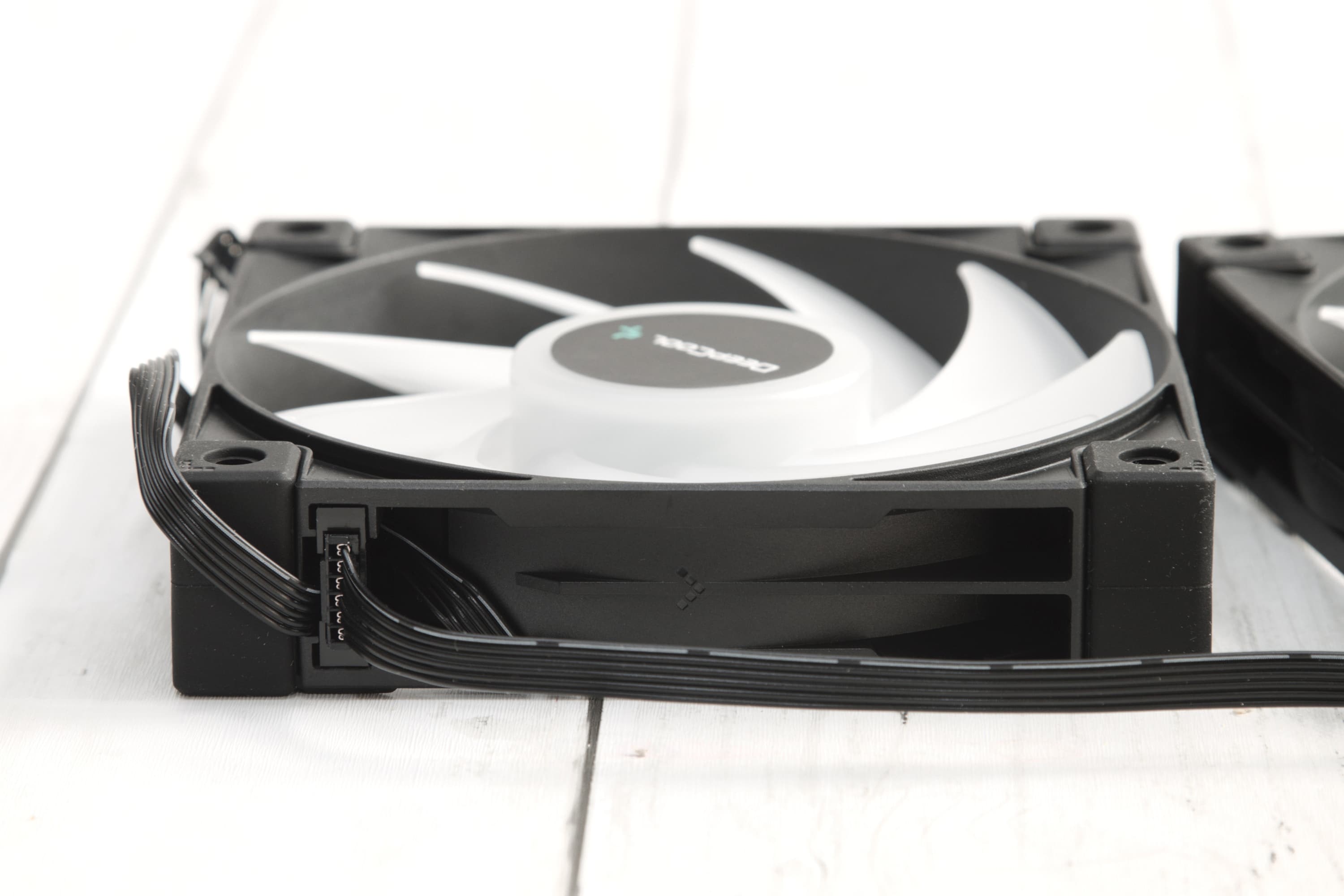 Aber hier kommen wir direkt zur Besonderheit, die den DeepCool LS720 zur Konkurrenz der Preisklasse herausstechen lässt: Die Lüfter können aneinander angeschlossen werden mit den Kabeln, die kaum länger sind als ein Lüfter breit ist. So können sie eine Lüfterkette bilden, die nur mit einem Kabel angesteuert werden muss, was den Kabelsalat deutlich reduzieren soll, denn üblicherweise muss man pro RGB-Lüfter je zwei Kabel an entsprechende Anschlüsse bringen.