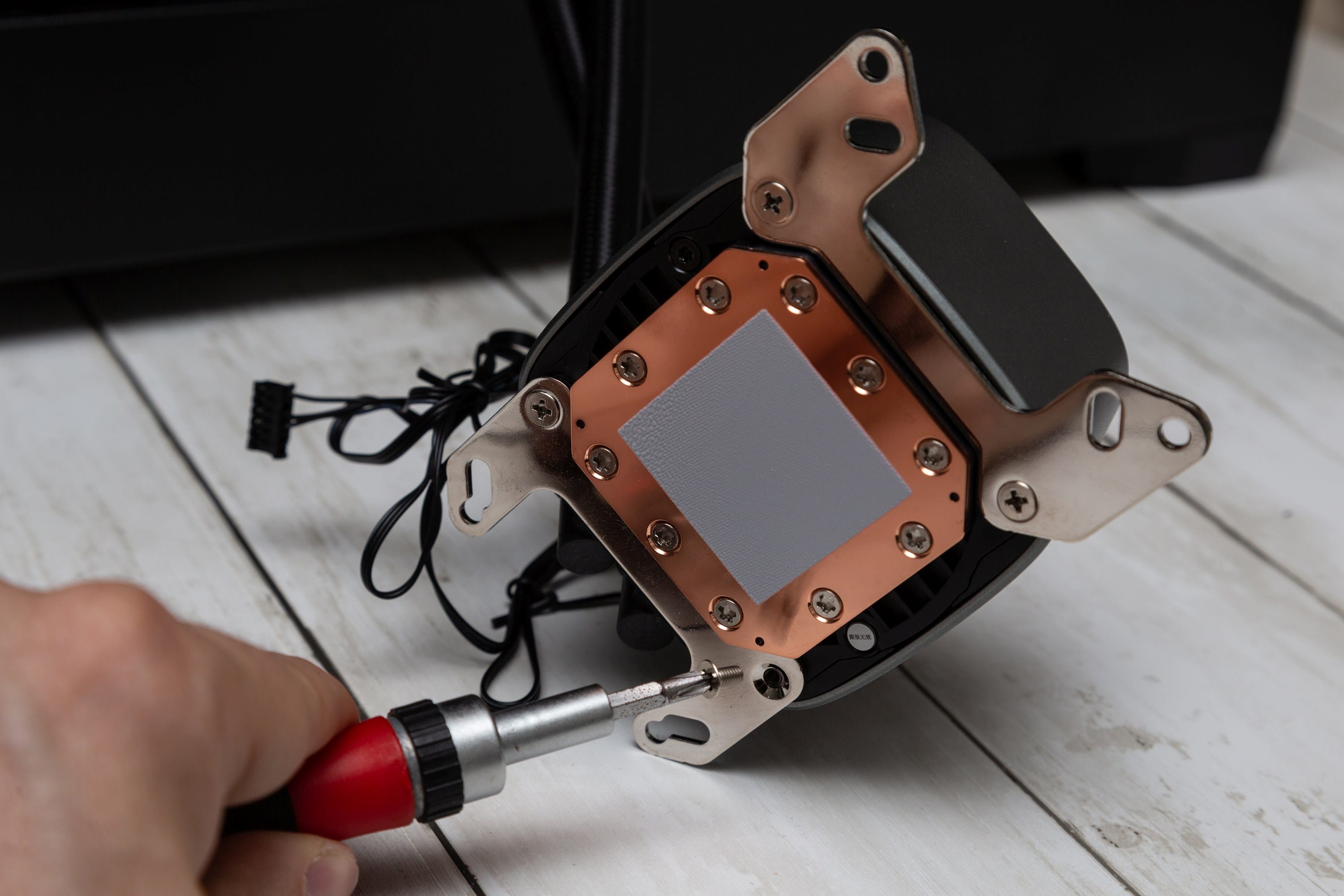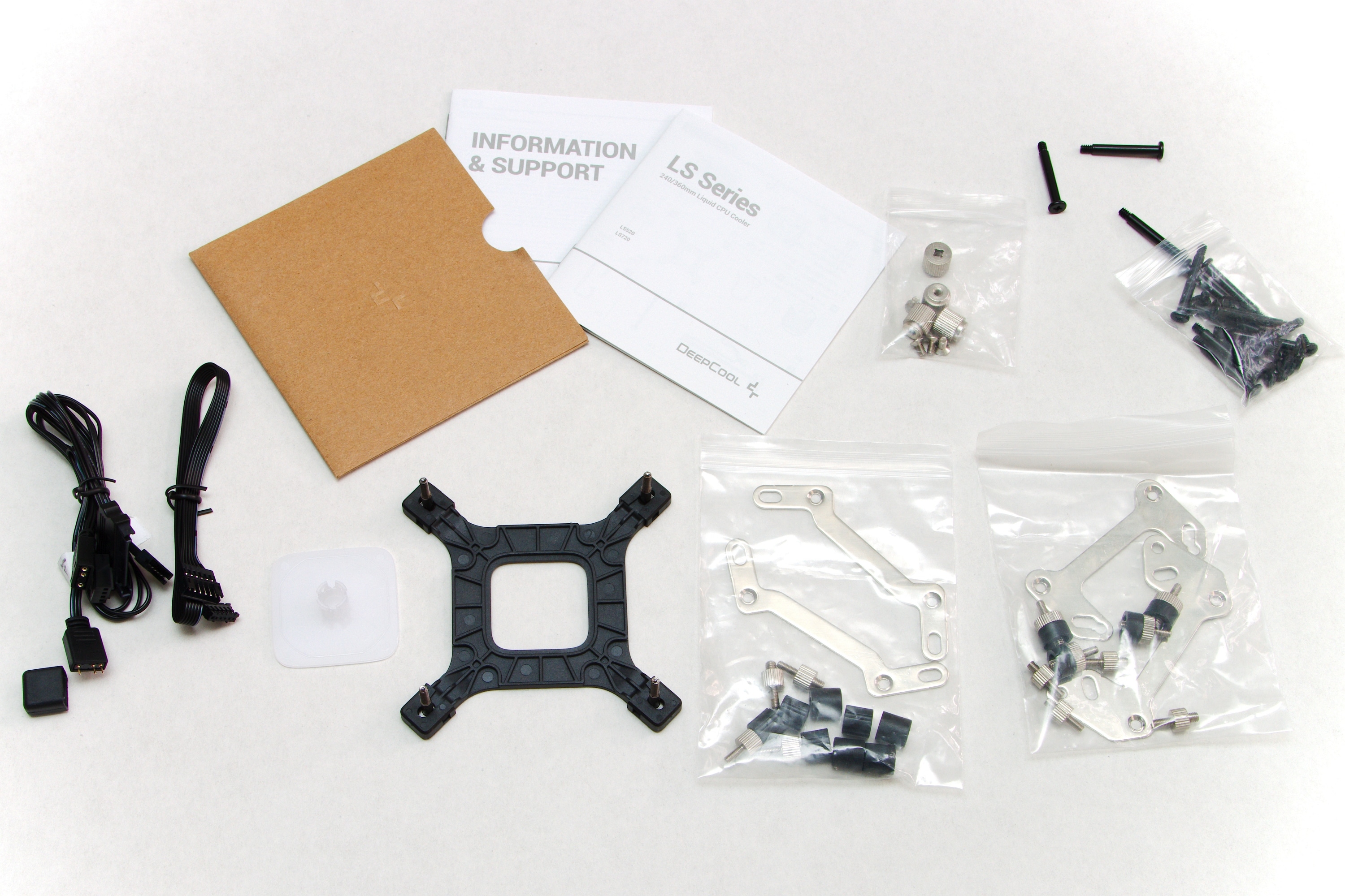 Der Einbau des DeepCool LS720 All-In-One-Wasserkühlers ist prinzipiell nicht schwer – unterscheidet sich jedoch von Sockel zu Sockel deutlich. Eines ist immer gleich: Zunächst muss man die Halterungen an die Pumpeneinheit anschrauben. Hier gibt es unterschiedliche Halterungen für die unterschiedlichen Sockel und man kann diese entsprechend je nach gewünschter Ausrichtung anbringen, damit die Pumpeneinheit gedreht ist, wie man es möchte. DeepCool empfiehlt allerdings, die Schläuche nach unten vom Prozessor abgehen zu lassen, um die beste Hitzeübertragung und somit die niedrigsten Temperaturen zu erreichen.