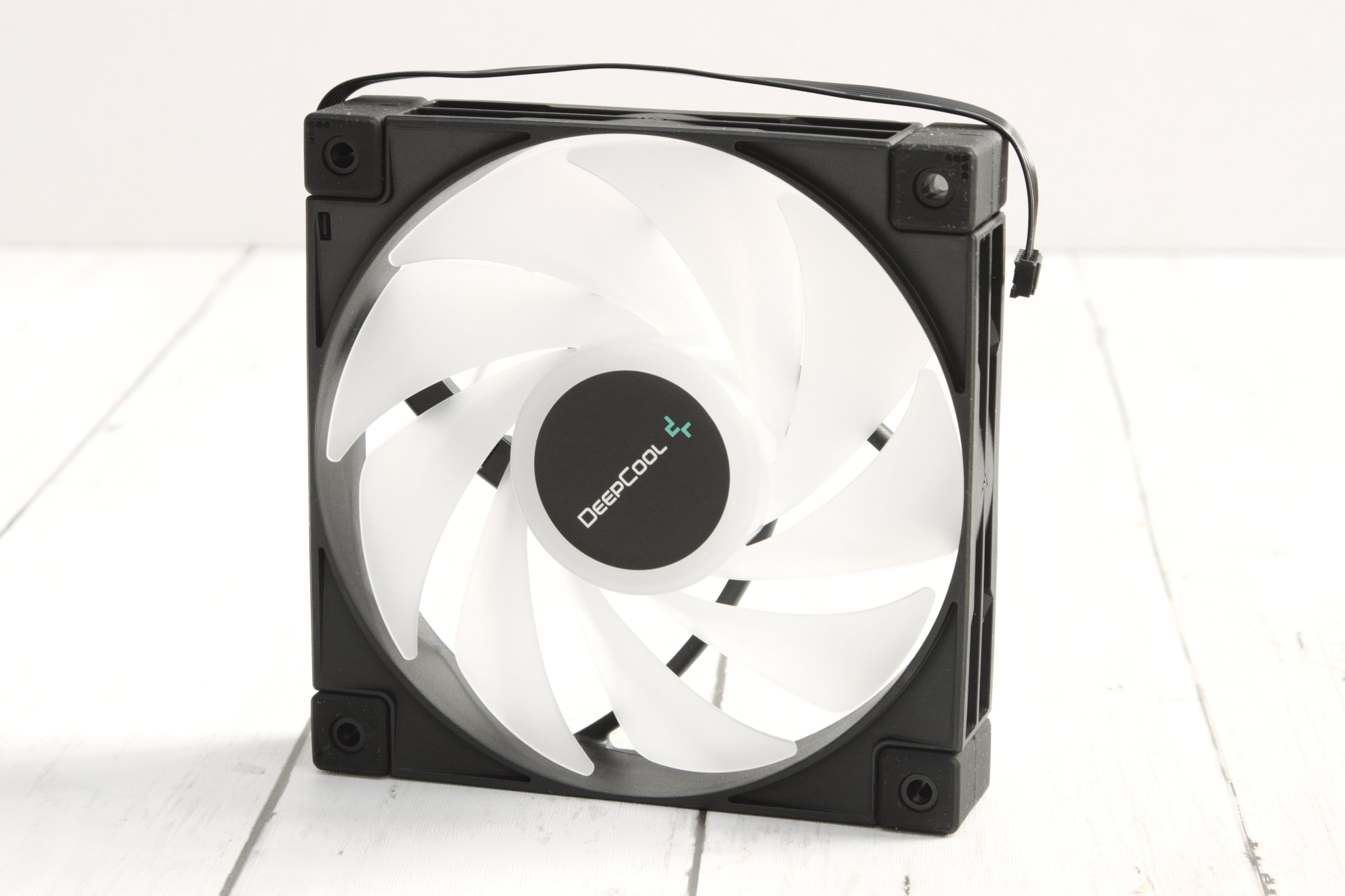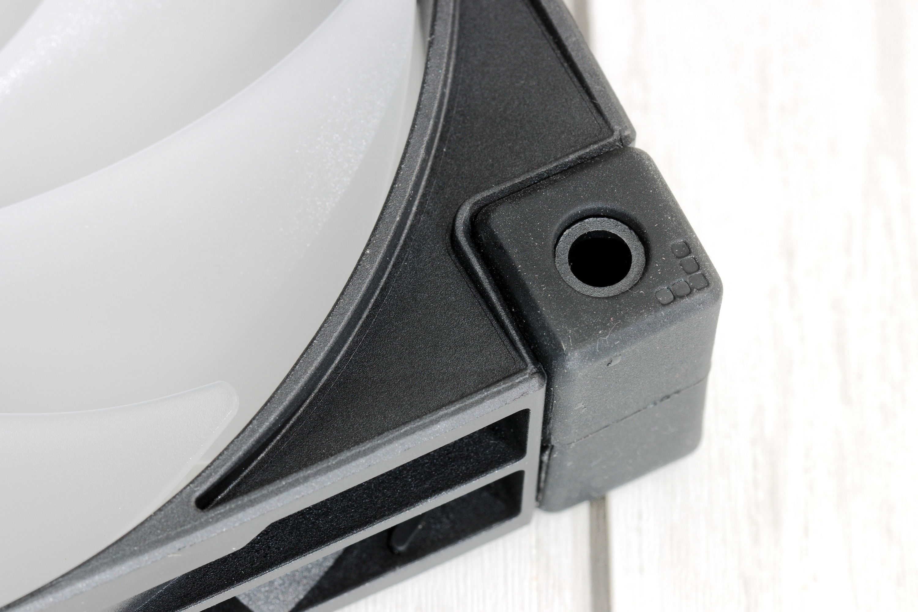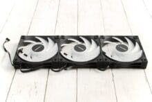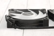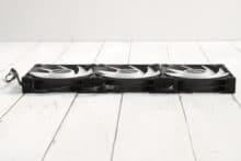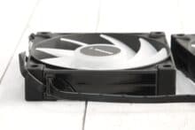 Die Lüfter, die sich im Lieferumfang des DeepCool LS720 befinden, sind nicht wirklich verwindungssteif. Insgesamt geht die Verarbeitung in Ordnung – ein Gefühl von Premium-Lüftern kommt nicht auf. Ein nettes Detail sind die gummierten Ecken, die Vibrationsgeräusche dämpfen, allerdings schwer von Staub zu befreien sind, was den optischen Eindruck etwas dämpfen kann. Auf den ersten Blick sehen sie aus wie die RGB-Variante des Lüfters, der auf dem DeepCool AK400 zu finden ist, wobei die Verwandtschaft auch durch die Produktbezeichnung FC120 FDB bestätigt wird, doch die Lüfter des DeepCool LS720 können sich schneller drehen, werden auf voller Leistung entsprechend etwas lauter und leisten daher noch mehr.