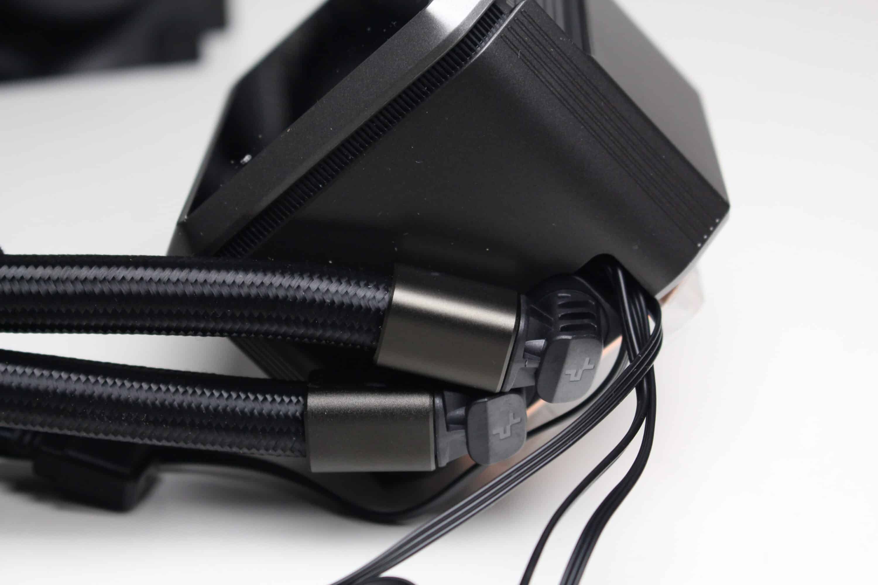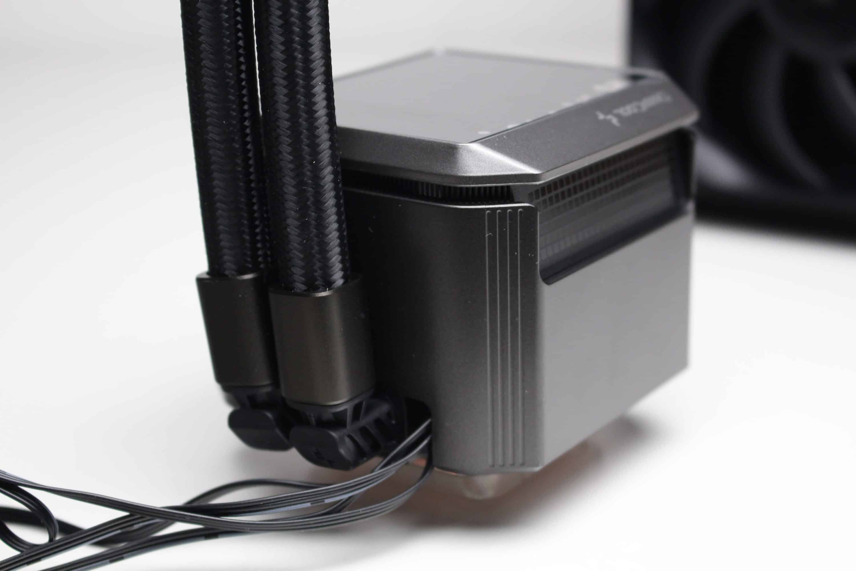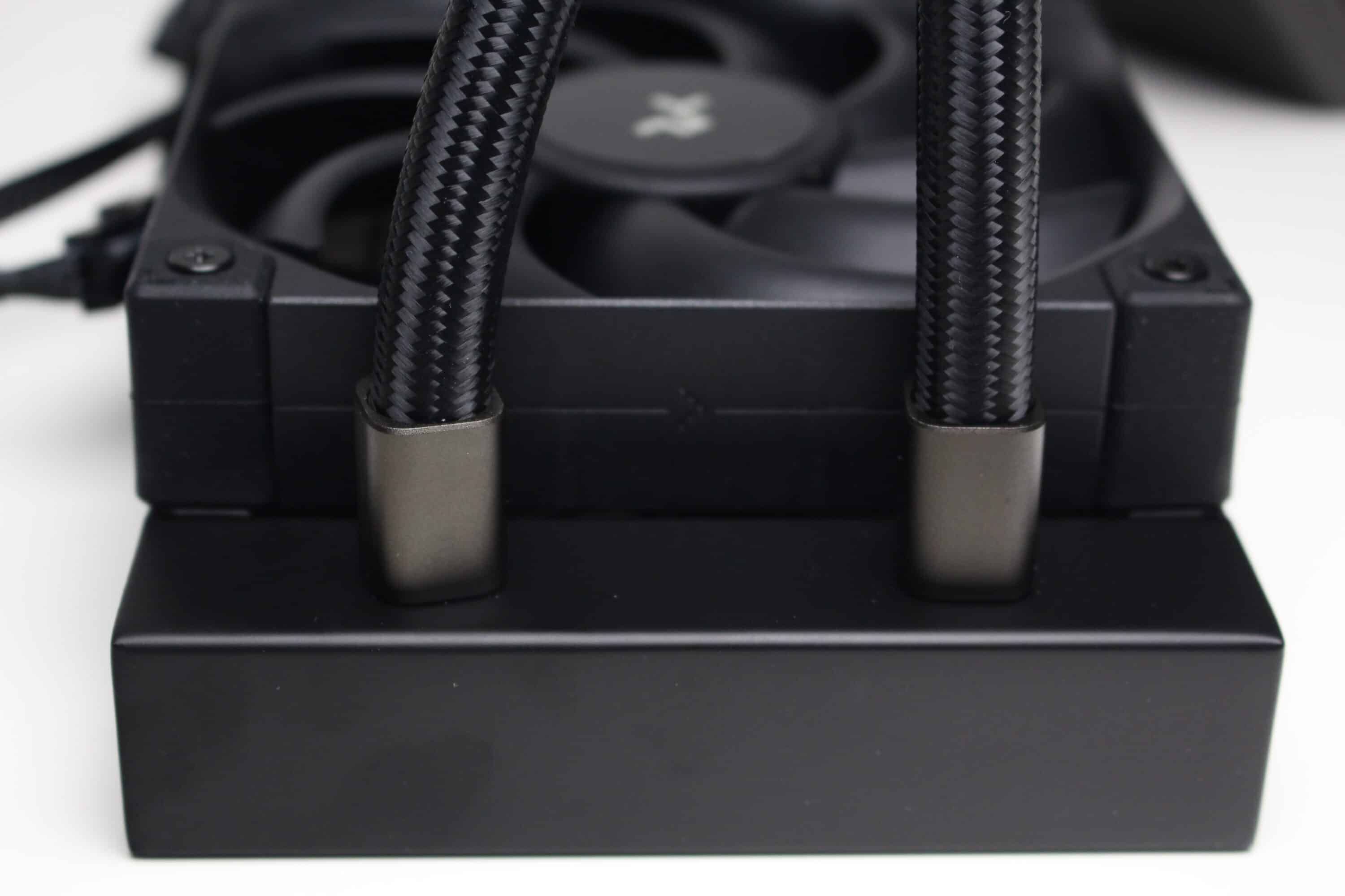 Die Wasserleitungen verfügen über schwarze, textilummantelte Schläuche, die mit jeweils 410 Millimeter durchschnittlich lang sind. In Verbindung mit den drehbaren Gelenken am Pumpenblock sollte dadurch eine flexible Positionierung im Gehäuse möglich sein. Da sowohl am Radiator als auch an den drehbaren Gelenken des Pumpenblocks die Schläuche durch Stahlmuffen festgepresst wurden, ist diese Kompaktwasserkühlung nicht erweiter- oder auffüllbar.