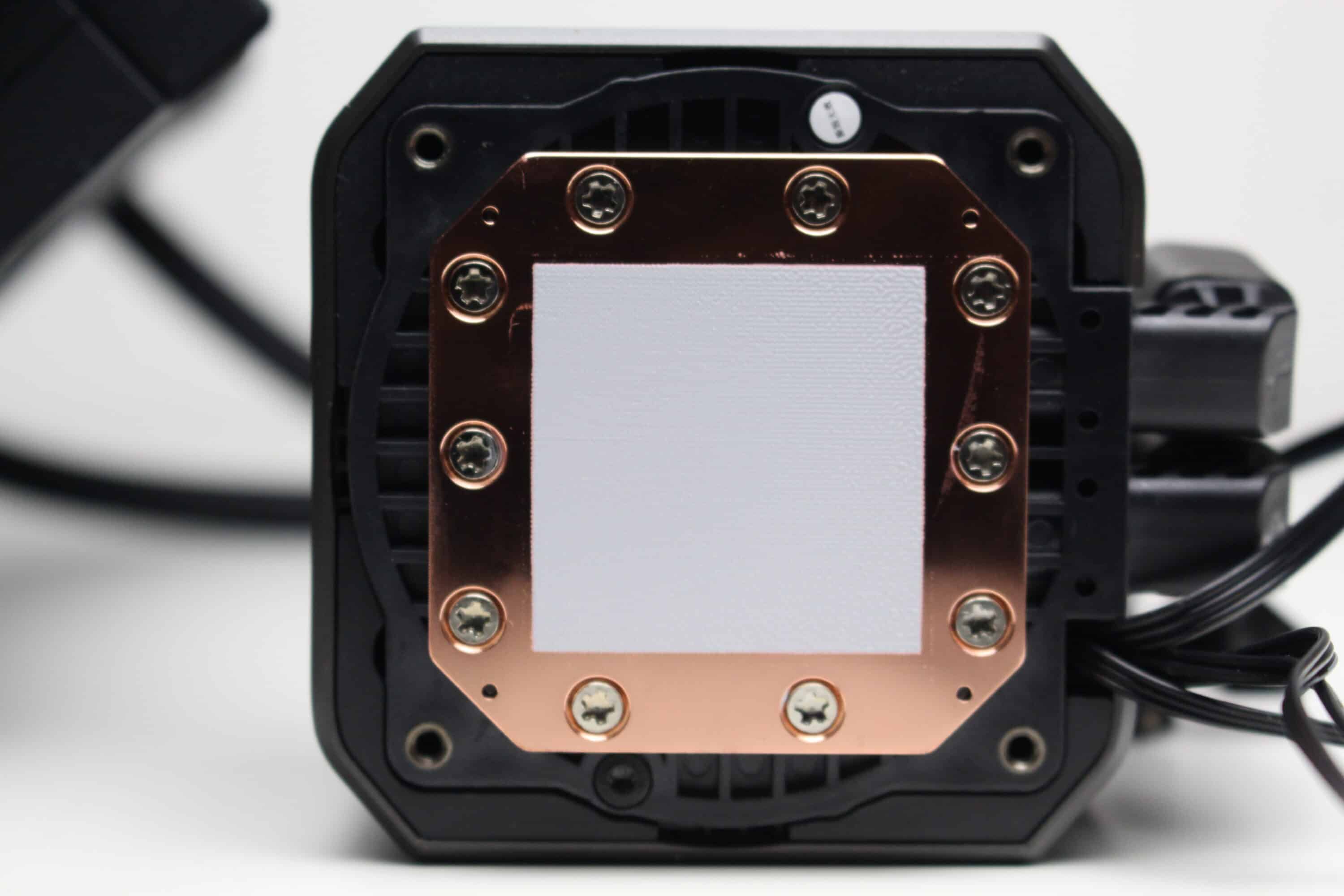 Optischer Mittelpunkt ist bei der Mystique 240 der Pumpenblock. Im ausgeschalteten Zustand ist der Block jedoch sehr schlicht gehalten und es dominieren die Farben Schwarz und Silber bzw. Grau. Lediglich die flache, leicht spiegelnde Oberfläche an der Oberseite lässt mehr erahnen. Mehr dazu aber in einem späteren Kapitel. Die Pumpe selbst verfügt über eine Kupferplatte am Boden, auf der ab Werk bereits Wärmeleitpaste aufgetragen wurde. Außerdem gibt DeepCool für die Pumpe eine Geschwindigkeit von 3400 Umdrehungen pro Minute an und die Steuerung erfolgt mittels 3-Pin-Anschluss über das Mainboard.
