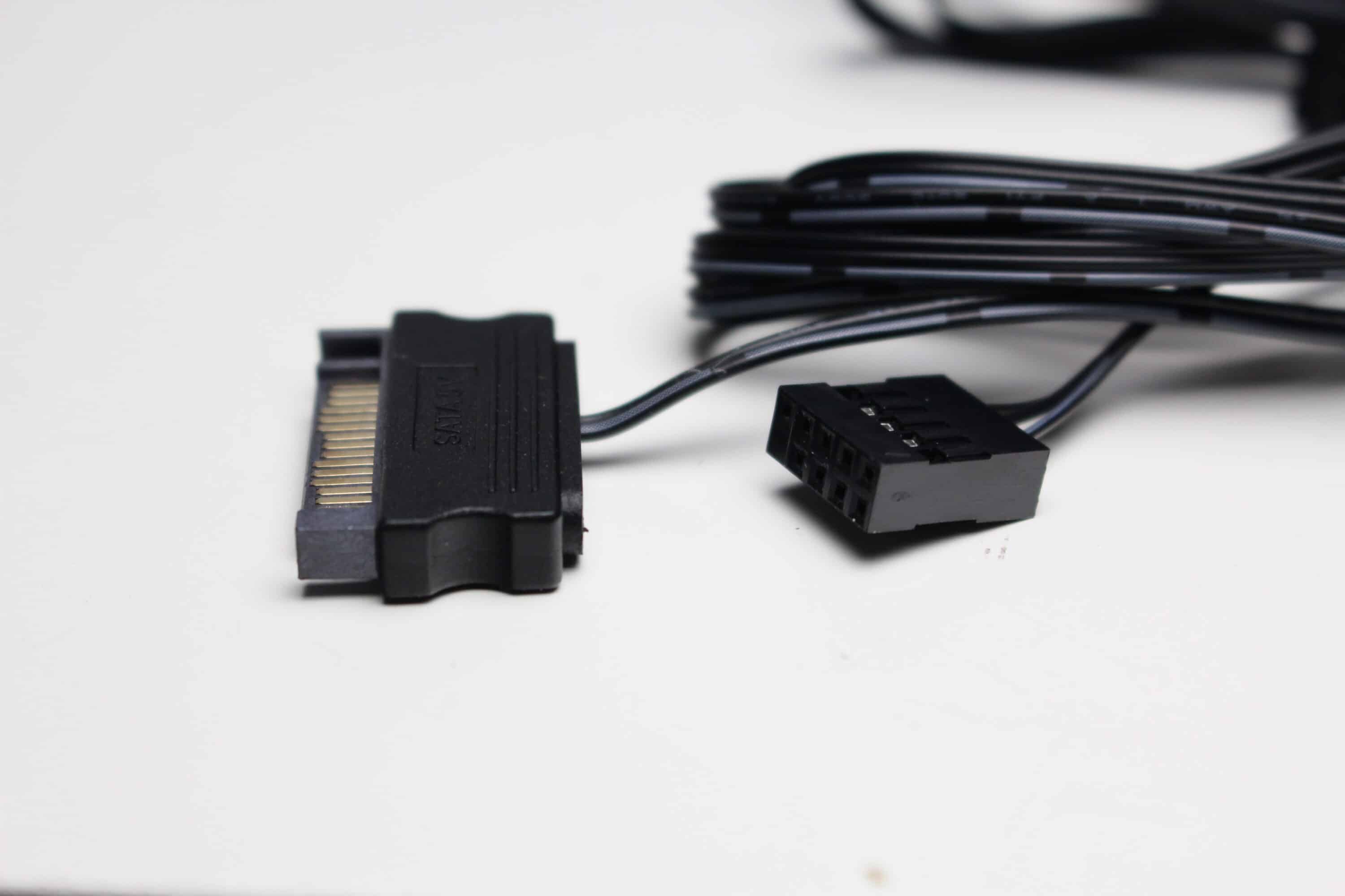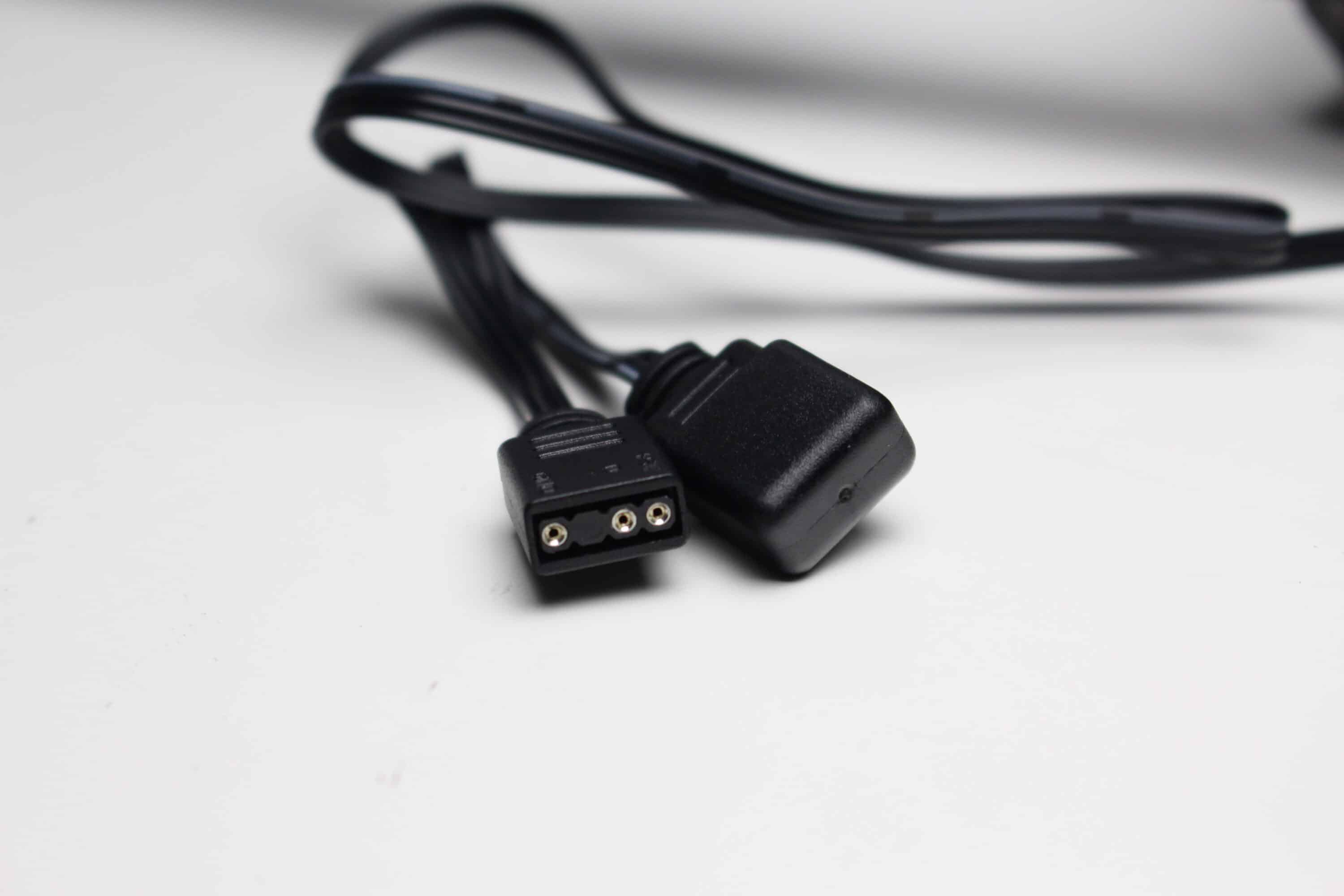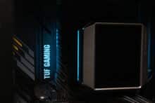 Außerdem verfügt der Pumpenblock über zwei nach unten gerichtete ARGB-Elemente, die über das Mainboard angesteuert werden können und für eine indirekte Beleuchtung sorgen. Die Ansteuerung erfolgt über einen 3-Pin-5V-ARGB-Stecker. Um den Anschluss an einem Mainboard mit wenigen Anschlüssen zu erleichtern, verfügt das Kabel zudem über einen Splitter für das ARGB-Signal. Abschließend noch ein paar Impressionen der aktivierten Beleuchtung.
