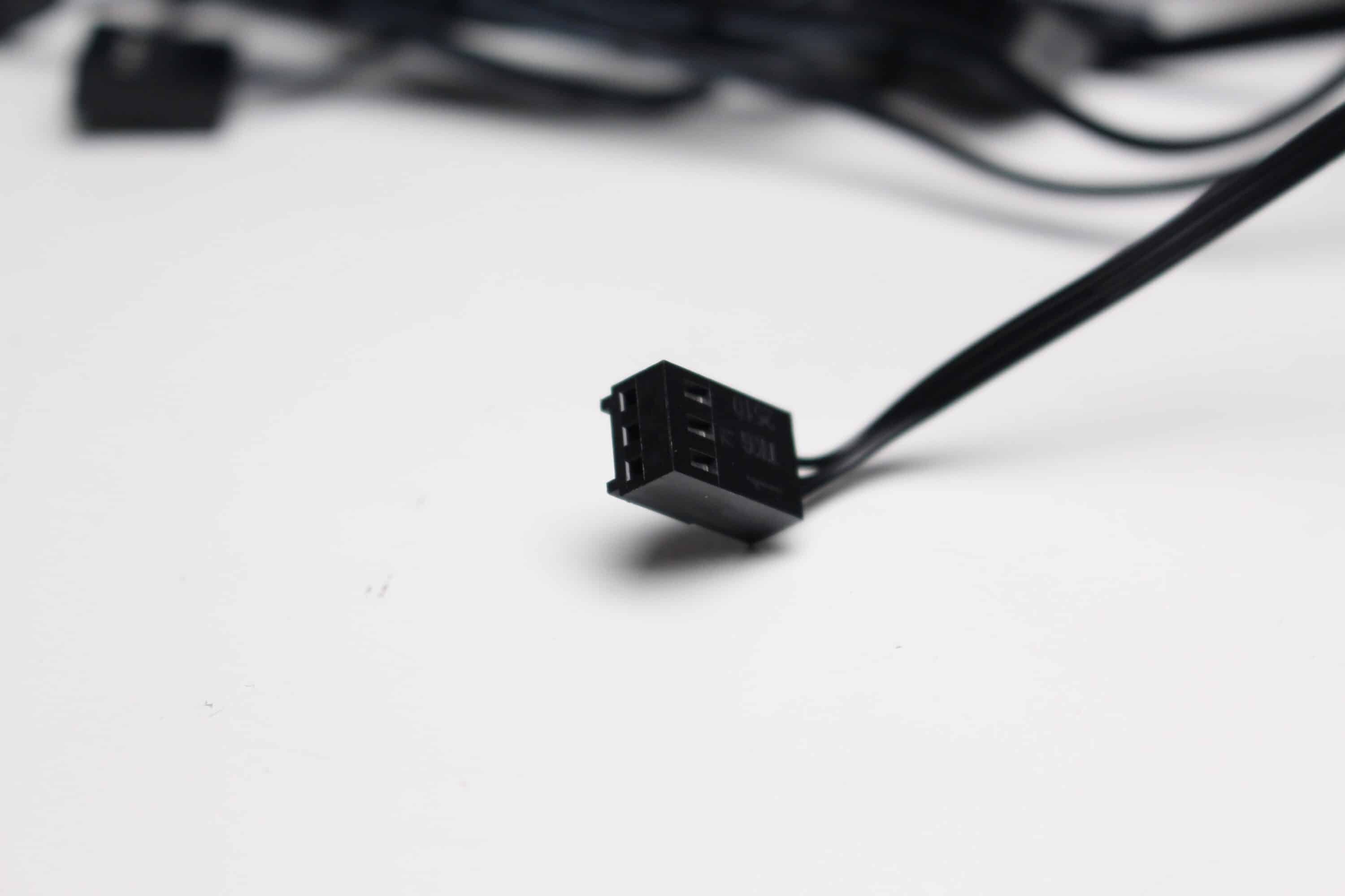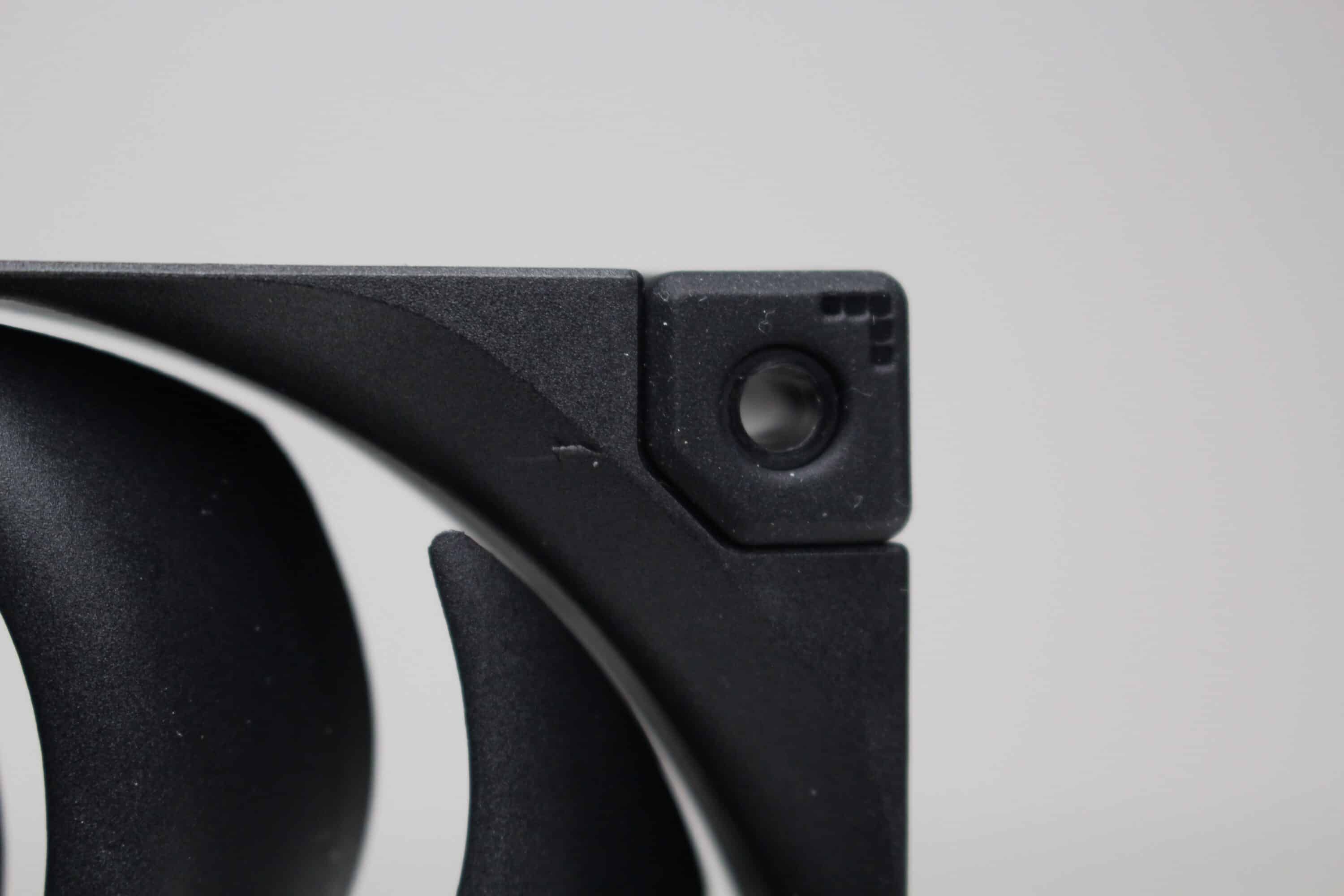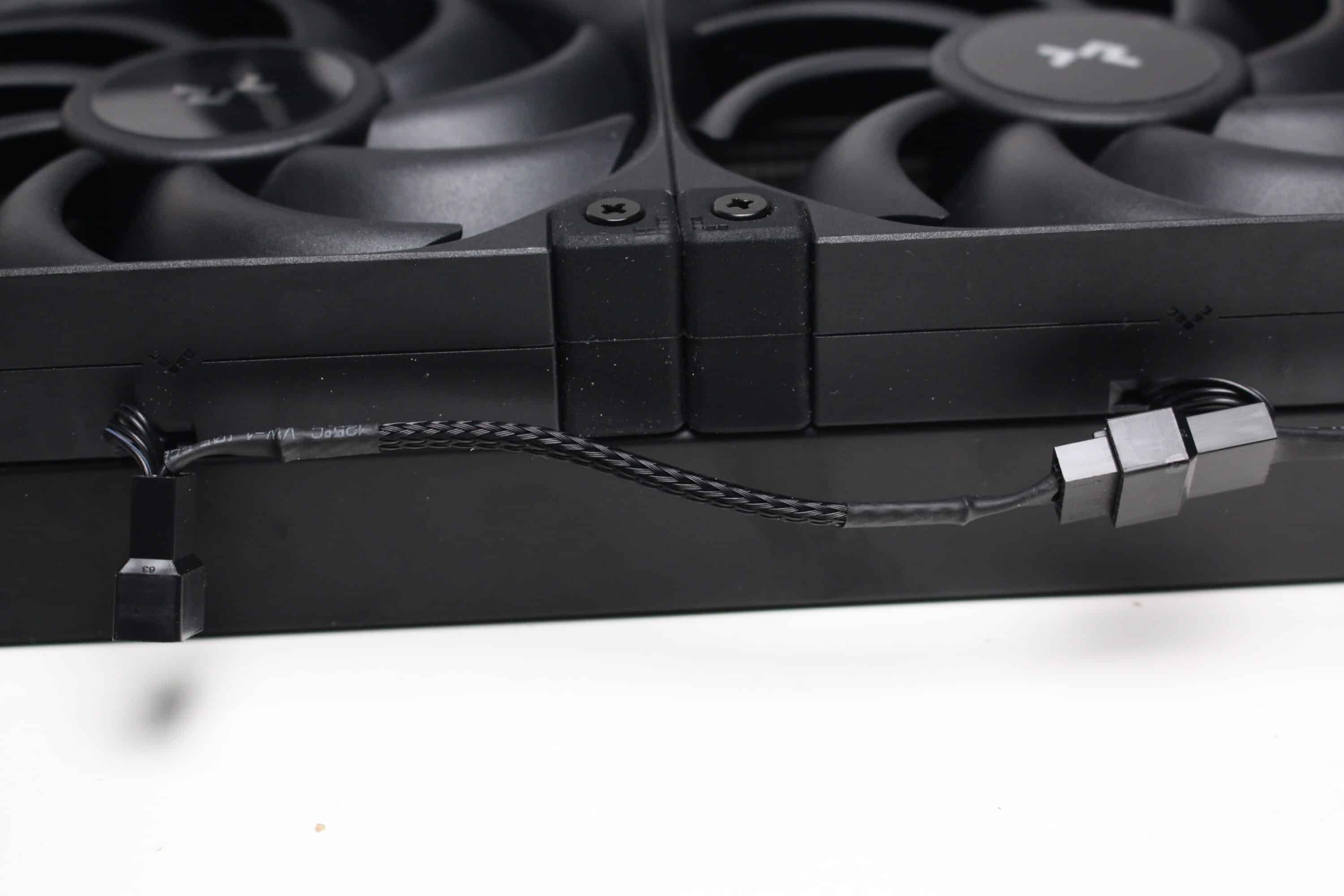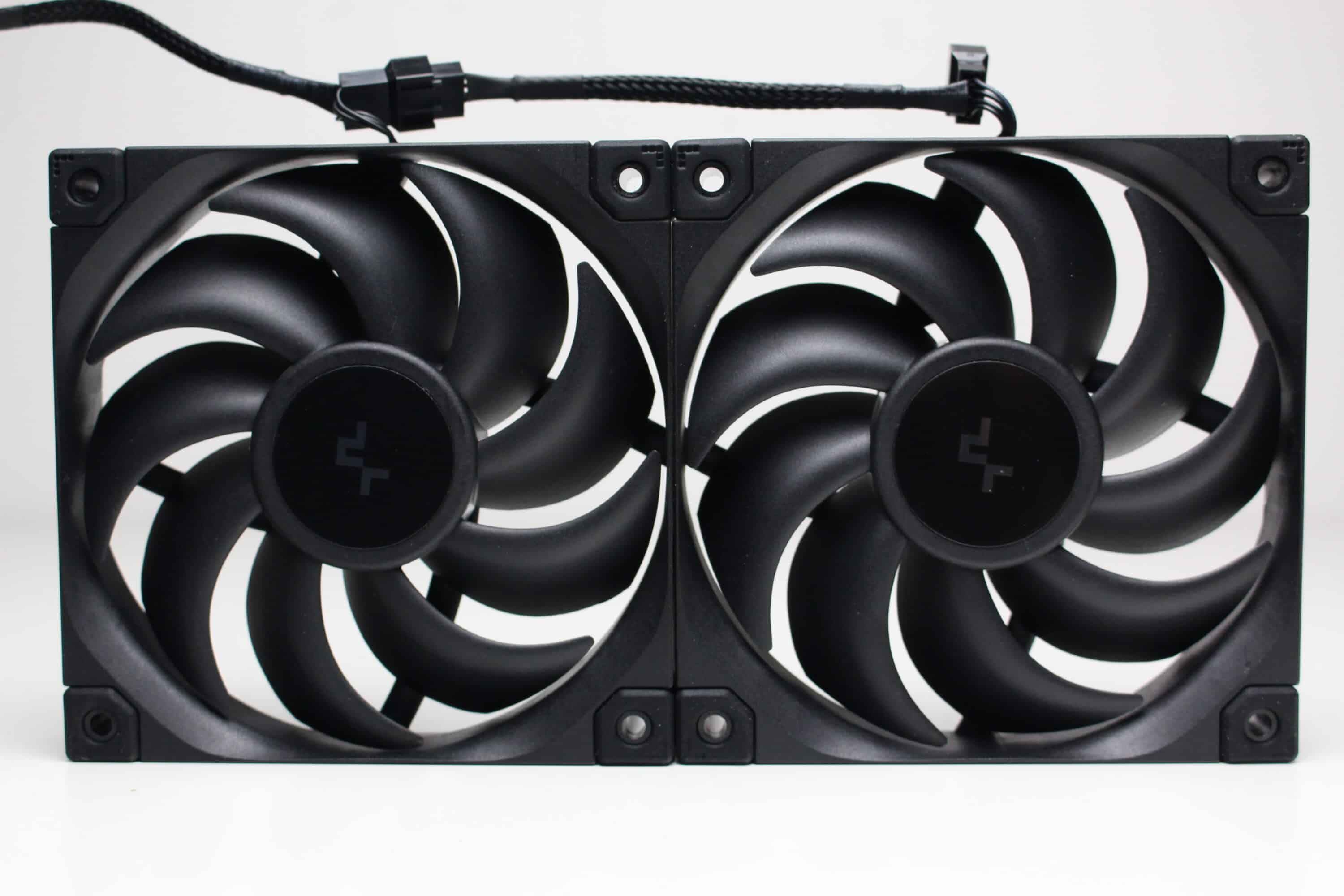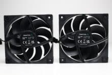 Bei den zwei Lüftern vom Typ DeepCool FT12 SE FDB wird es hingegen wieder sehr schlicht. Sowohl der Rahmen als auch die 9-blättrigen Rotoren bestehen aus einem schwarzen Kunststoff und auch die Gummielemente in den Ecken sind dunkel gestaltet. Die Abmessungen belaufen sich auf 120x120x25 Millimeter und der Anschluss am Mainboard erfolgt über ein sehr kurzen PWM-Anschluss mit entsprechender Y-Weiche und einer großzügig dimensionierten Kabelverlängerung. DeepCool gibt für die Lüfter einen Drehzahlbereich zwischen 500 und 2150 Umdrehungen pro Minute an.