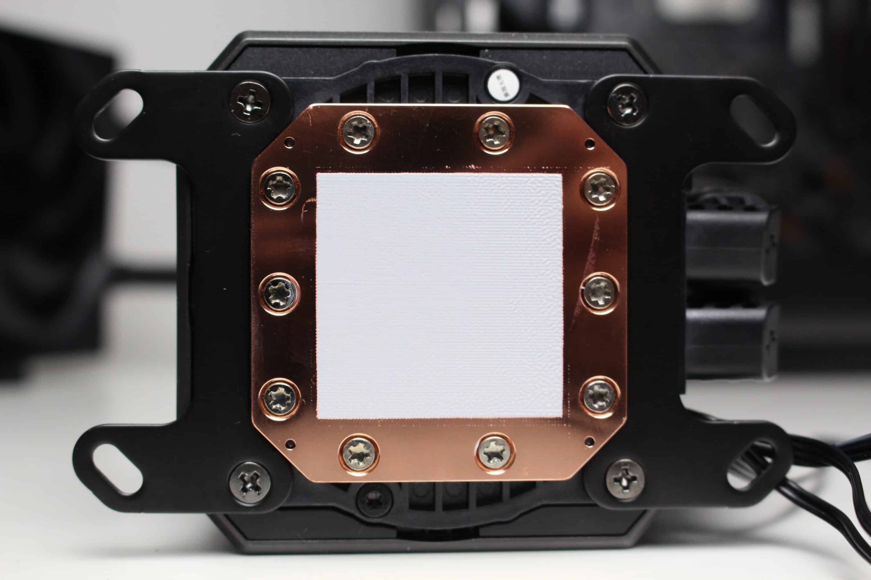 Als nächstes folgt die Vorbereitung des Pumpenblocks, indem an diesen zwei Montagebügel von unten angeschraubt werden. Die Orientierung ist theoretisch in 90-Grad-Schritten möglich. Anschließend wird der Pumpenblock auf die CPU gestellt und mit vier Rändelschrauben festgeschraubt. Die Wärmeleitpaste ist bei der Mystique 240 bereits voraufgetragen. Im letzten Schritt wird der Radiator inklusive Lüfter im Gehäuse montiert.